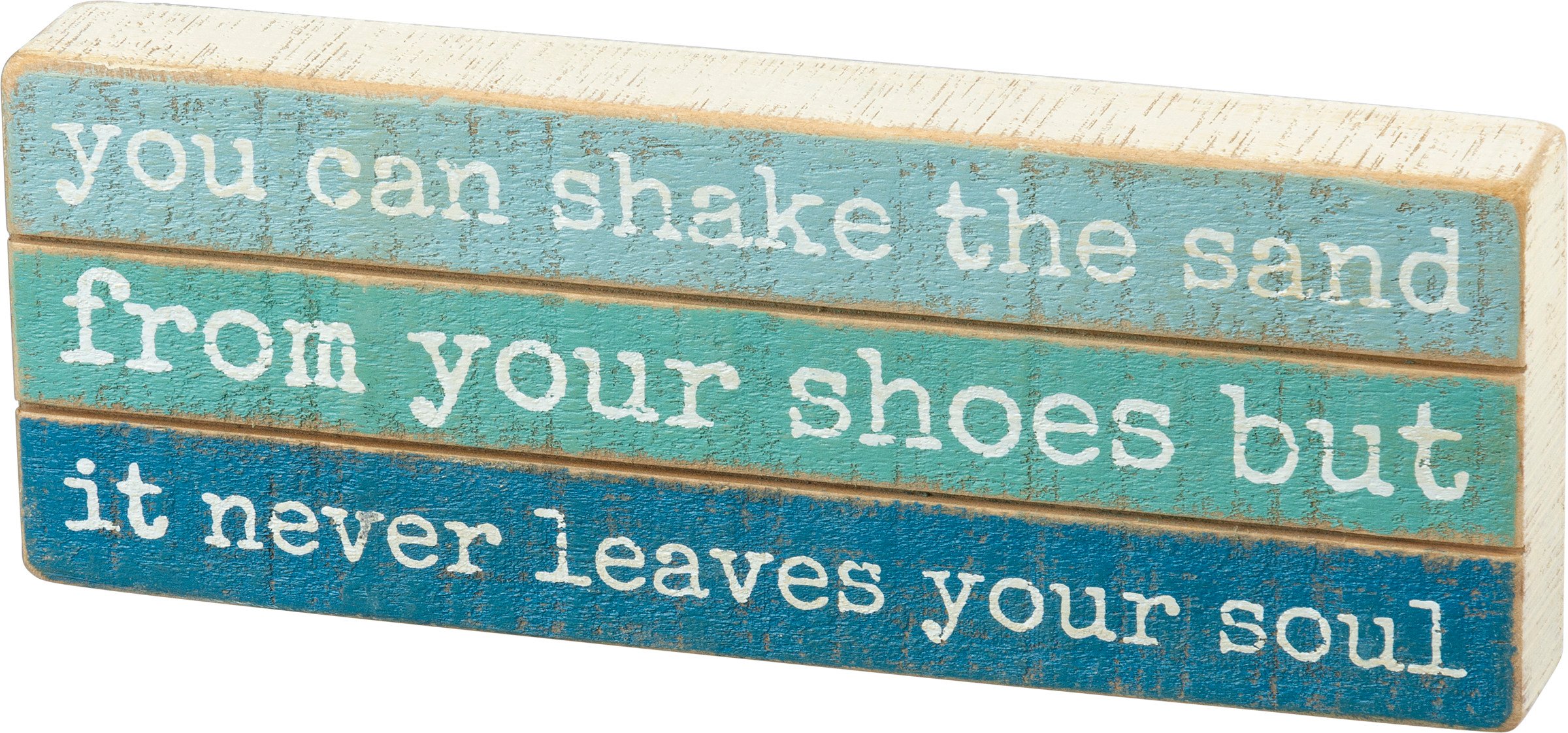 A slat wood box sign in a beach-inspired color blocked palette featuring a typeset "You Can Shake The Sand From Your Shoes But It Never Leaves Your Soul" sentiment. Easy to hang or can free-stand alone.
