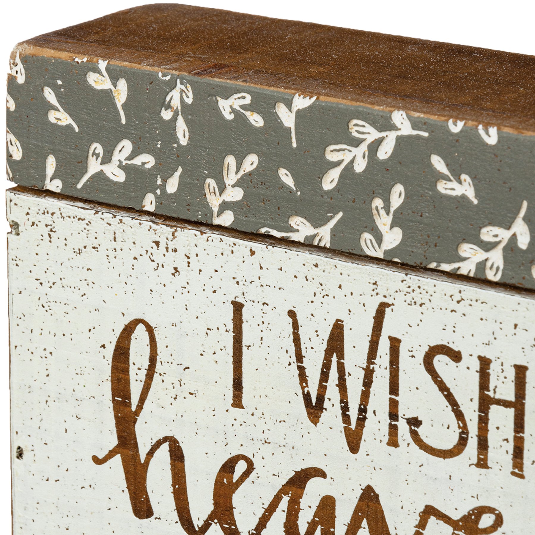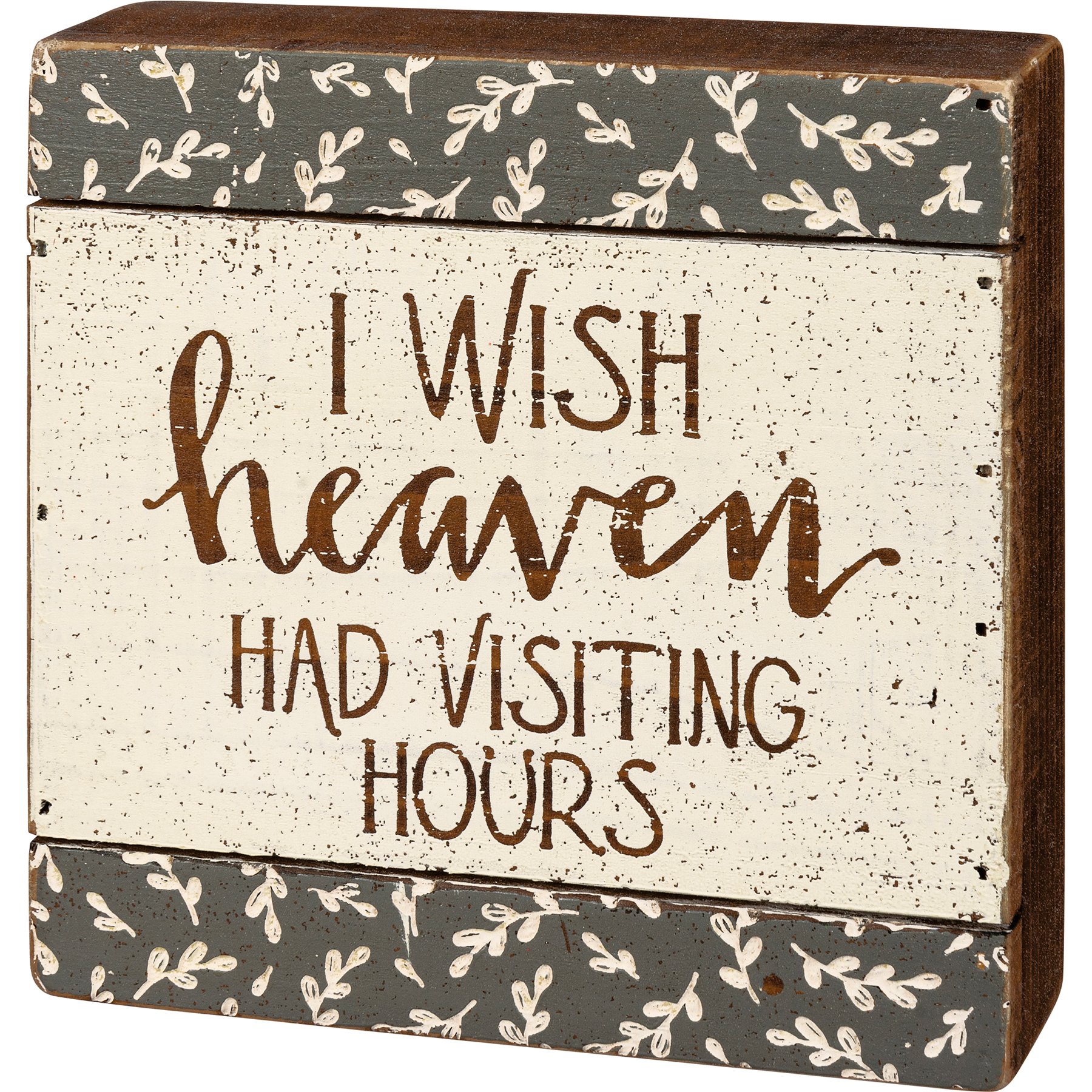 A wooden slat box sign featuring a hand lettered "I Wish Heaven Had Visiting Hours" sentiment and debossed botanical designs with painted details. Easy to hang or can free-stand alone.