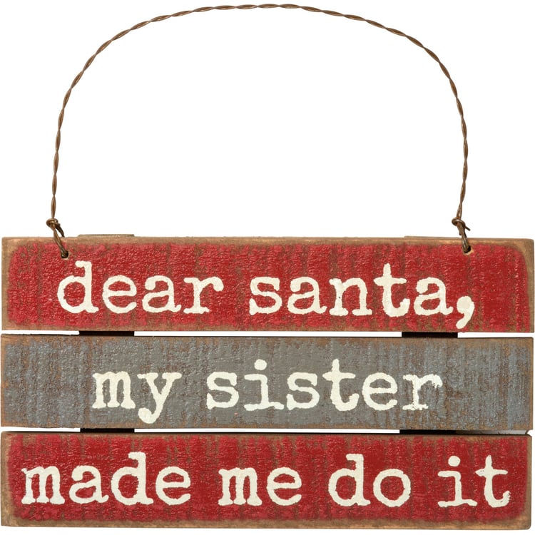 Rustic style meet simple Christmas charm with this slat wood ornament, featuring a distressed "Dear Santa, My Sister Made Me Do It" sentiment in an understated color blocked palette. Complements well with existing decor or coordinating styles for a cohesive collection. Contains twisted top wire loop for easy hanging.
