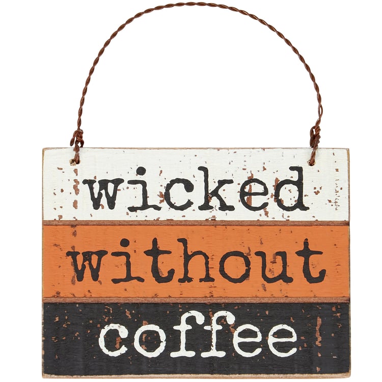 A slat wood ornament from our Halloween Collection displaying a fun Halloween themed sentiment that reads "Wicked Without Coffee." Seasonal slat ornament features classic Halloween color palette with distressed details for added interest. Our Wicked slat ornament is easy to hang via the attached twisted wire loop. A rustic seasonal home accent that can be easily displayed in any home or work space.