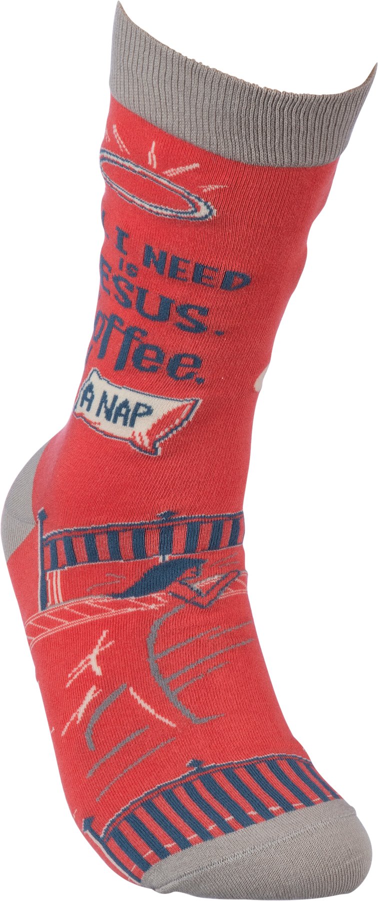These colorful socks feature woven designs with coordinating "All I Need Is Jesus, Coffee, And Naps" sentiment. Cotton, nylon, spandex. One size fits most.