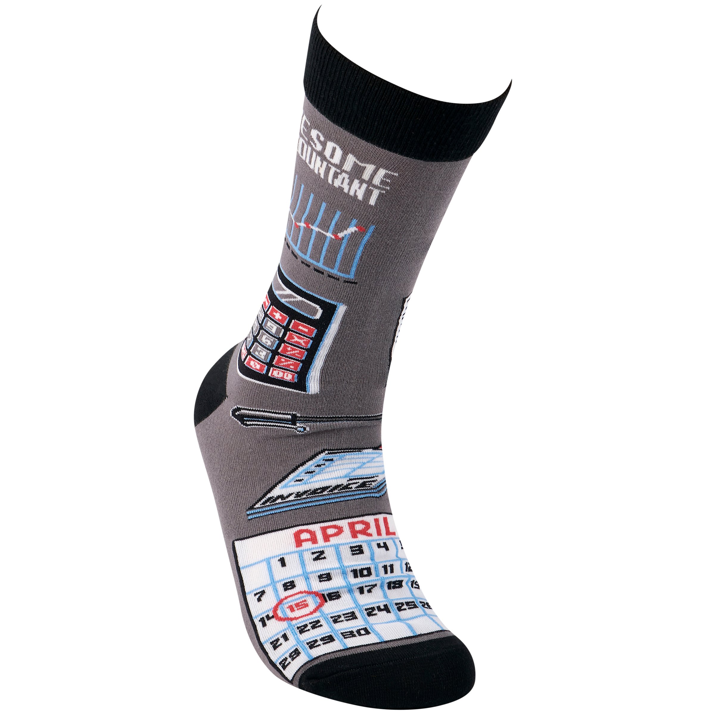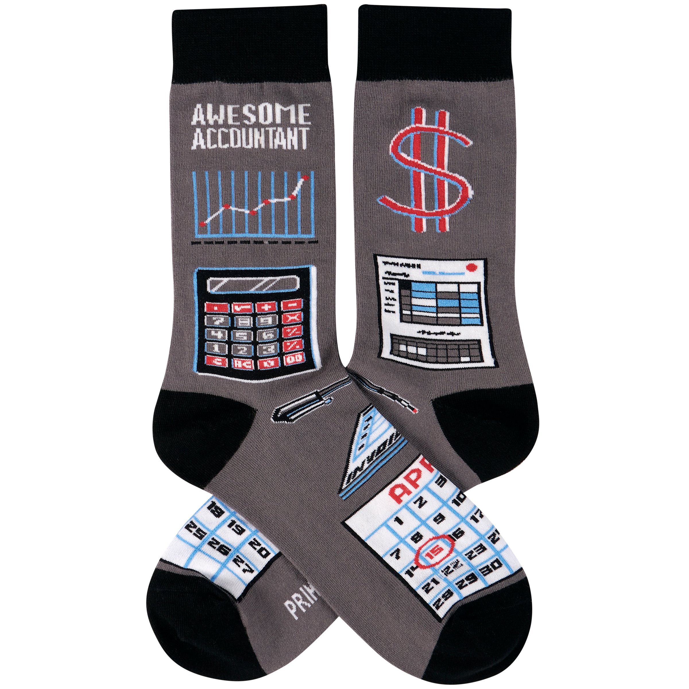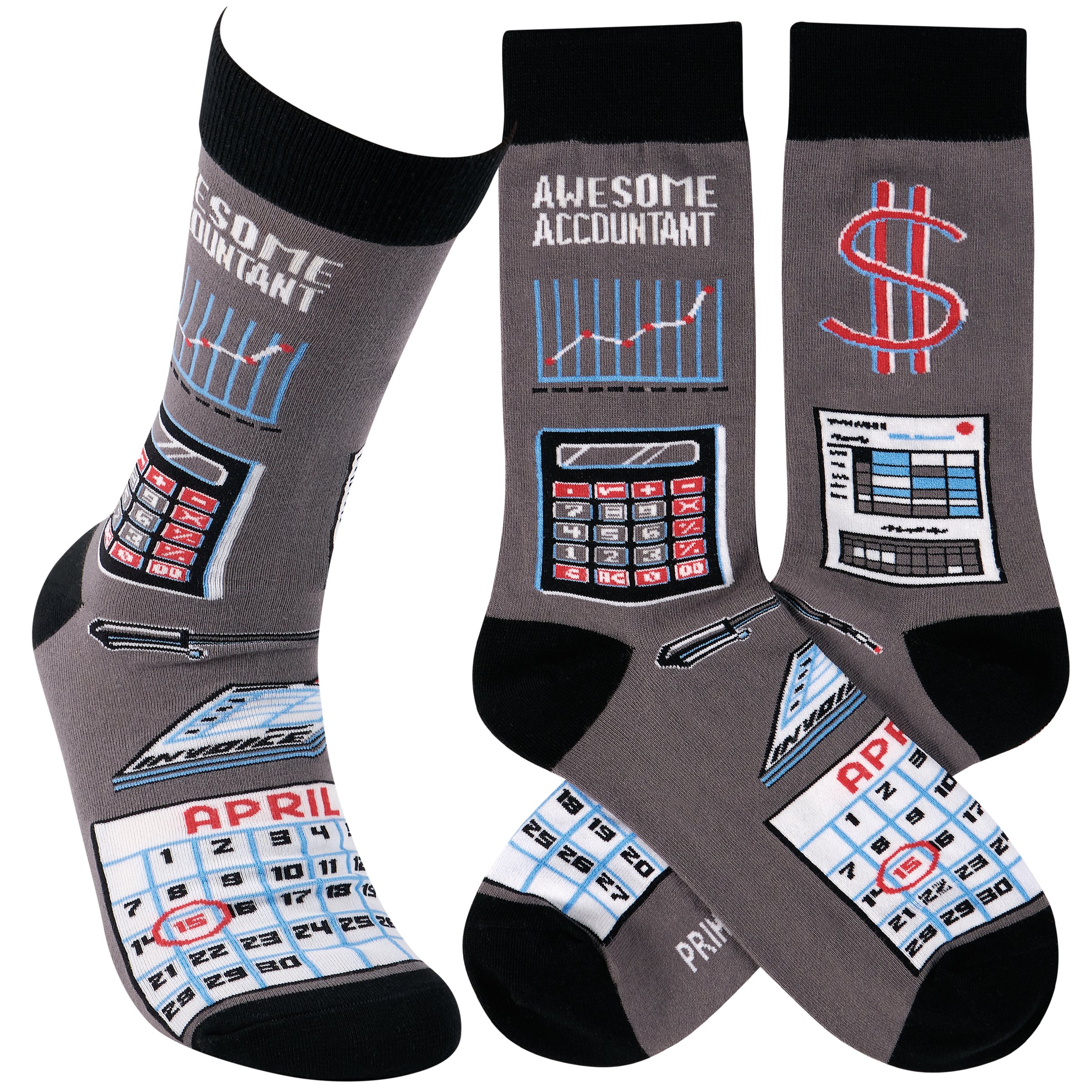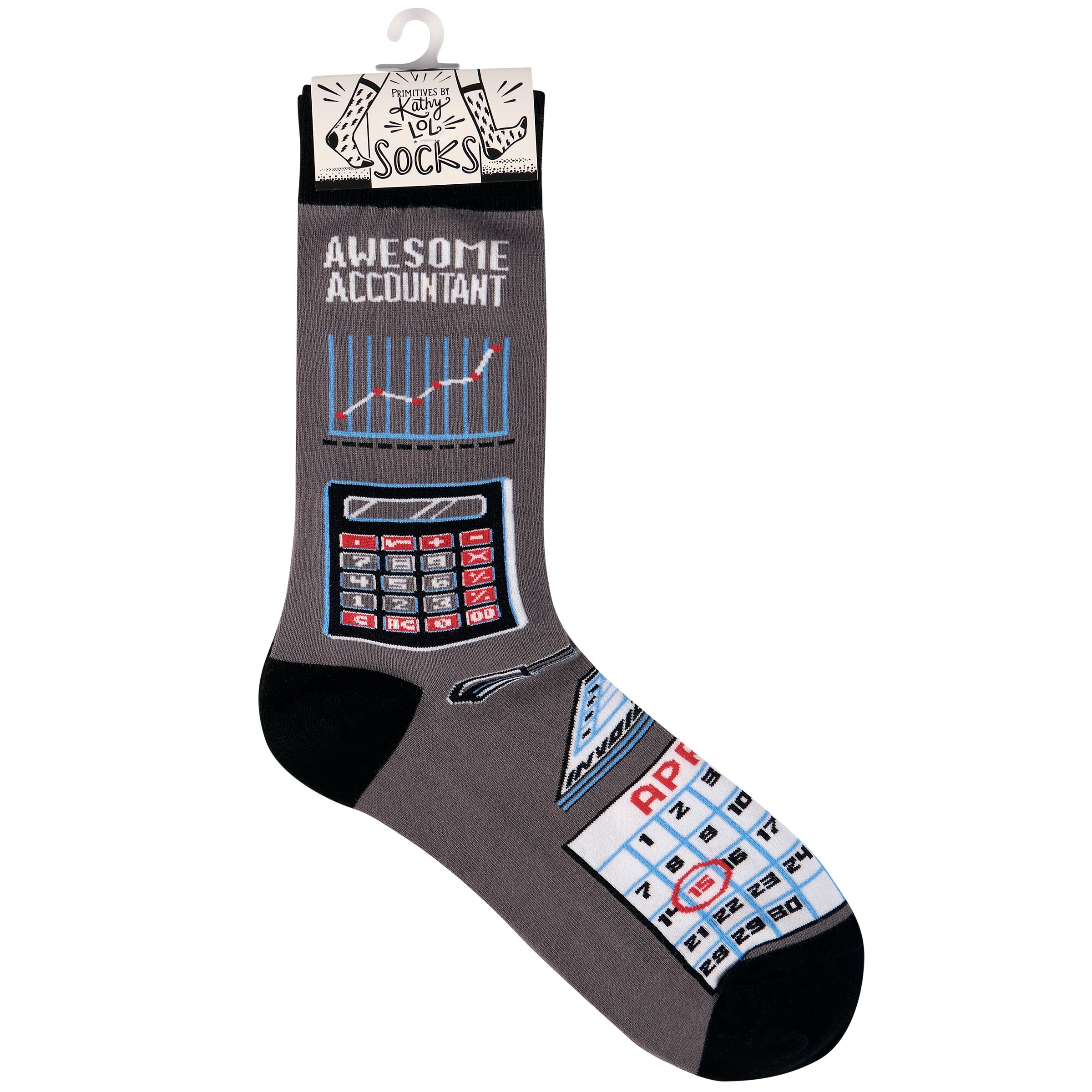 A pair of colorful socks from our LOL-Made You Smile Collection displaying playful hand illustrated designs of accounting tools and motifs with a fun accountant inspired sentiment that reads "Awesome Accountant." These giftable socks are made with a cotton, nylon, and spandex blend for a one size fits most design. Our Awesome Accountant socks come with a decorative header card and a clear plastic hanger for easy rack display and gifting. A fun accountant-themed gift perfect for everyday self-expression.