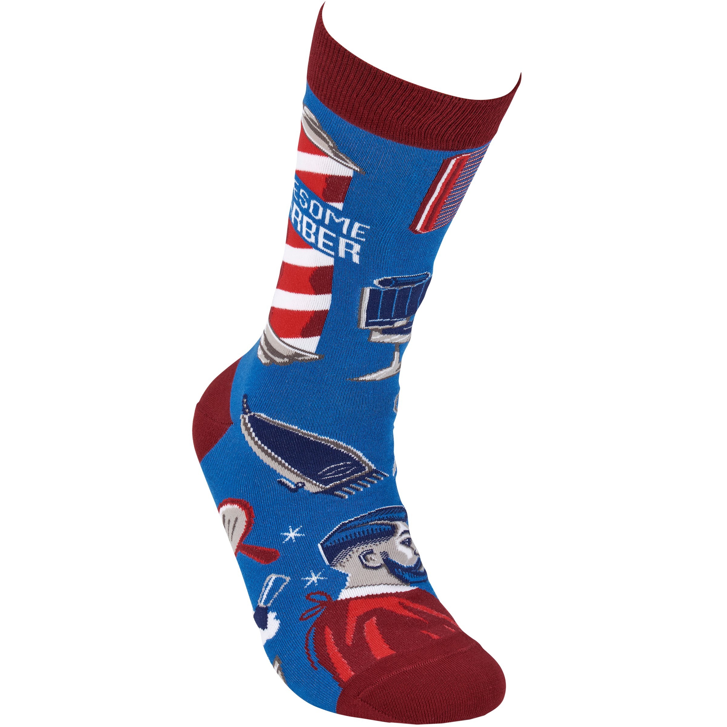 A pair of colorful socks from our LOL-Made You Smile Collection displaying unique hand illustrated designs of barbershop motifs with a fun sentiment that reads "Awesome Barber." Socks feature a one size fits most design made with cotton, nylon, and spandex. Our Awesome Barber socks come with a header card and a clear plastic hanger for display. A fun barber-themed gift perfect for everyday self-expression.