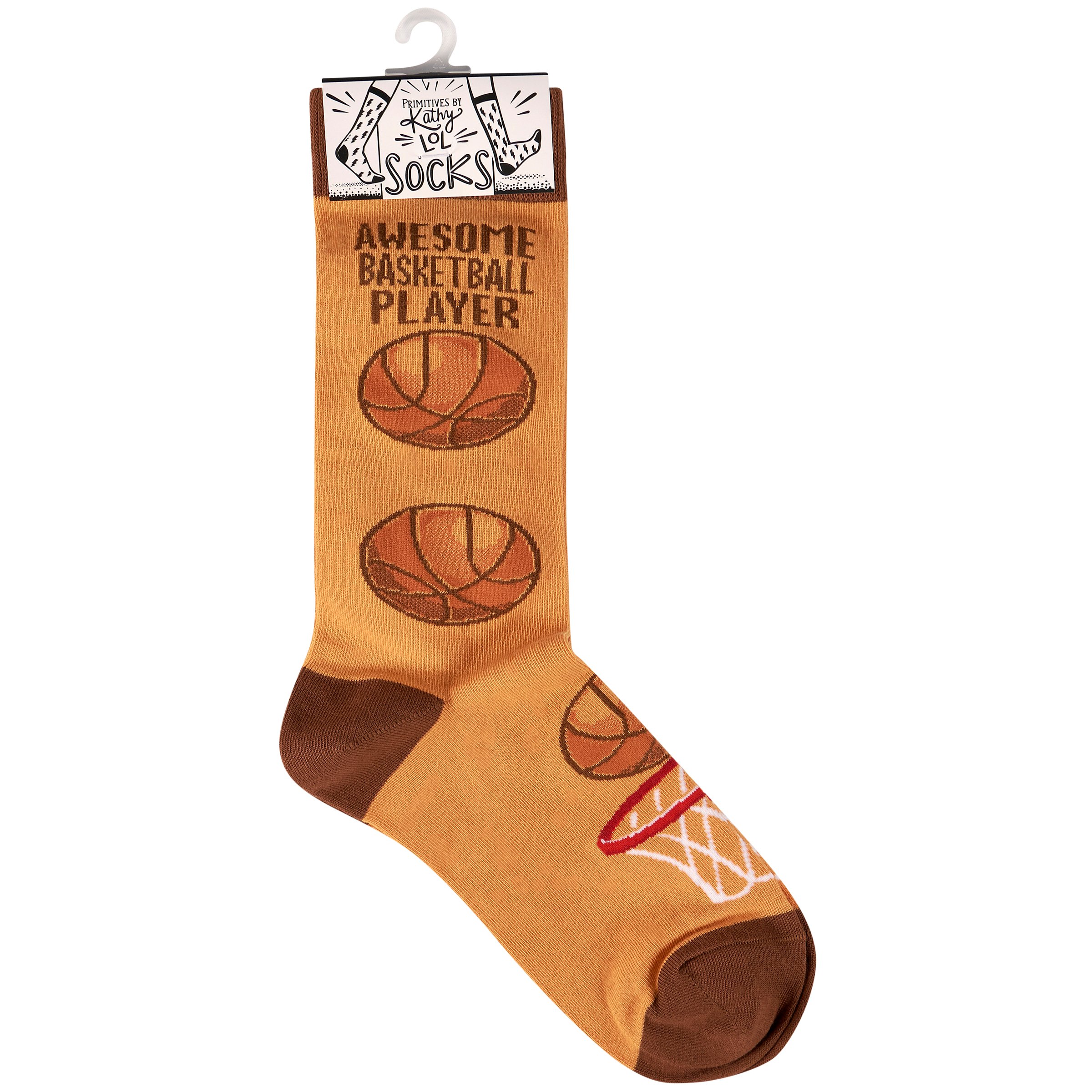 A pair of colorful socks from our LOL-Made You Smile Collection displaying playful hand illustrated designs of basketballs and basketball net with a fun sports inspired sentiment that reads "Awesome Basketball Player." These giftable socks are made with a cotton, nylon, and spandex blend for a one size fits most design. Our Awesome Basketball Player socks come with a decorative header card and a clear plastic hanger for easy rack display and gifting. A fun basketball-themed gift perfect for everyday self-expression.