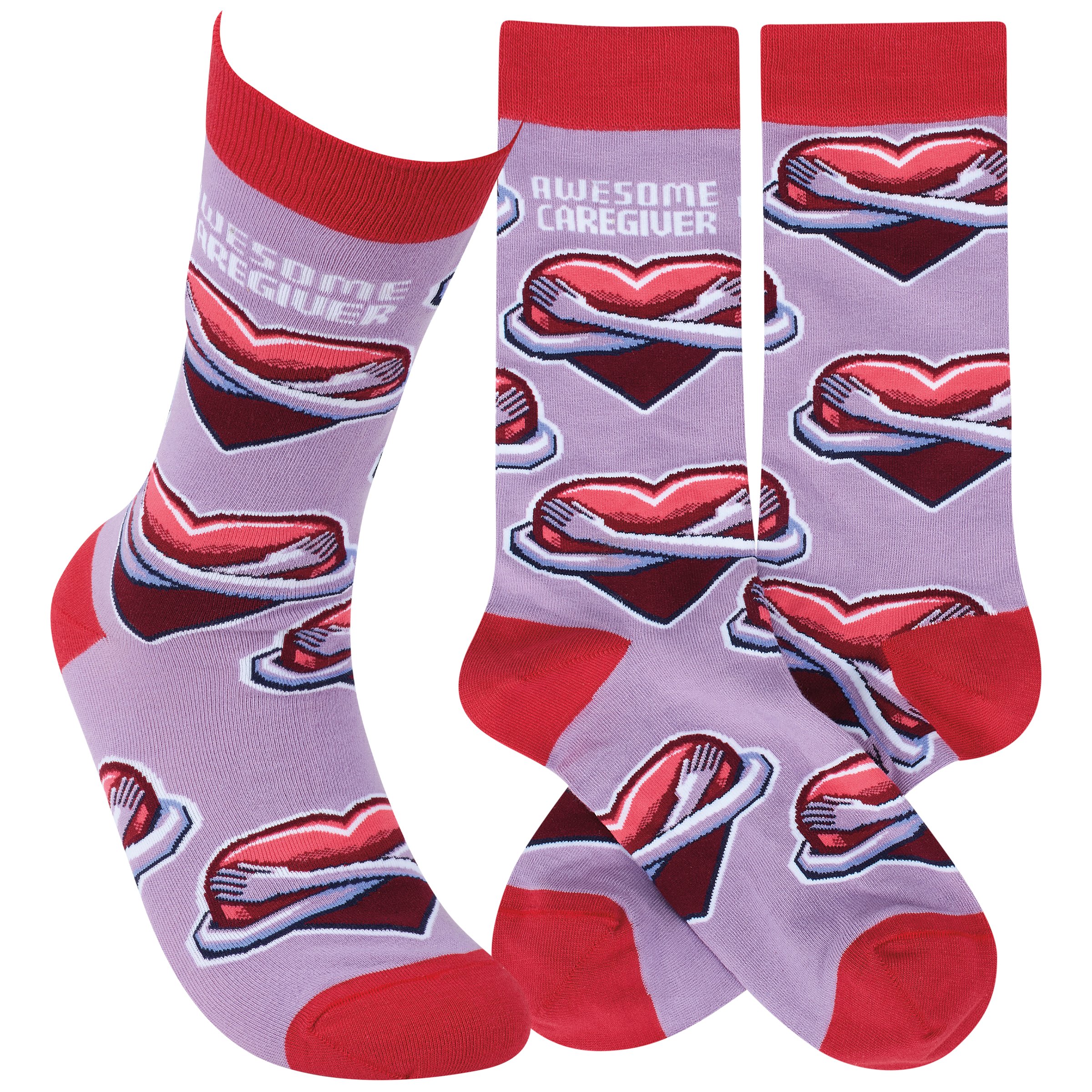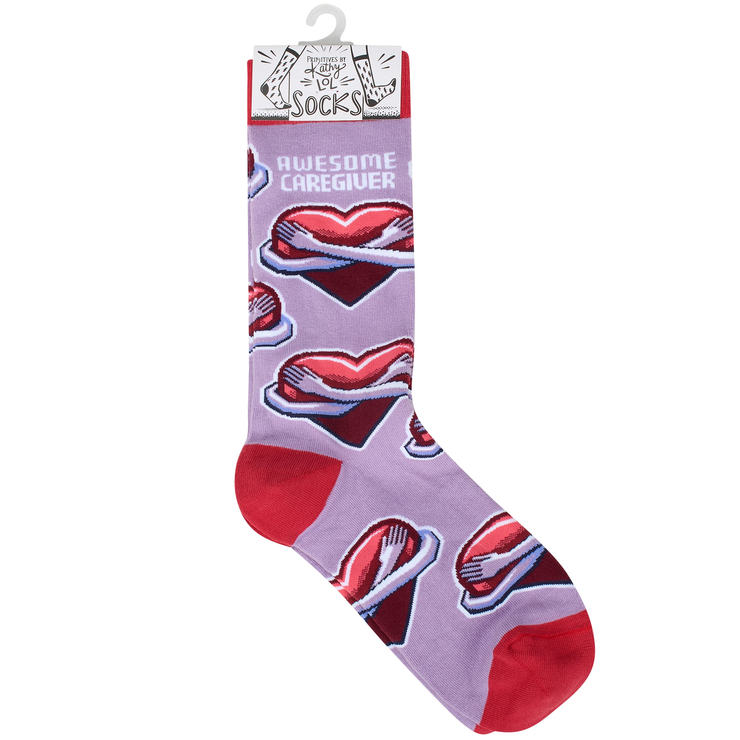 A pair of colorful socks from our LOL-Made You Smile Collection displaying playful hand illustrated designs of hearts with hugging arms and a fun caregiver inspired sentiment that reads "Awesome Caregiver." These giftable socks are made with a cotton, nylon, and spandex blend for a one size fits most design. Our Awesome Caregiver socks come with a decorative header card and a clear plastic hanger for easy rack display and gifting. A fun caregiver gift perfect for everyday self-expression.