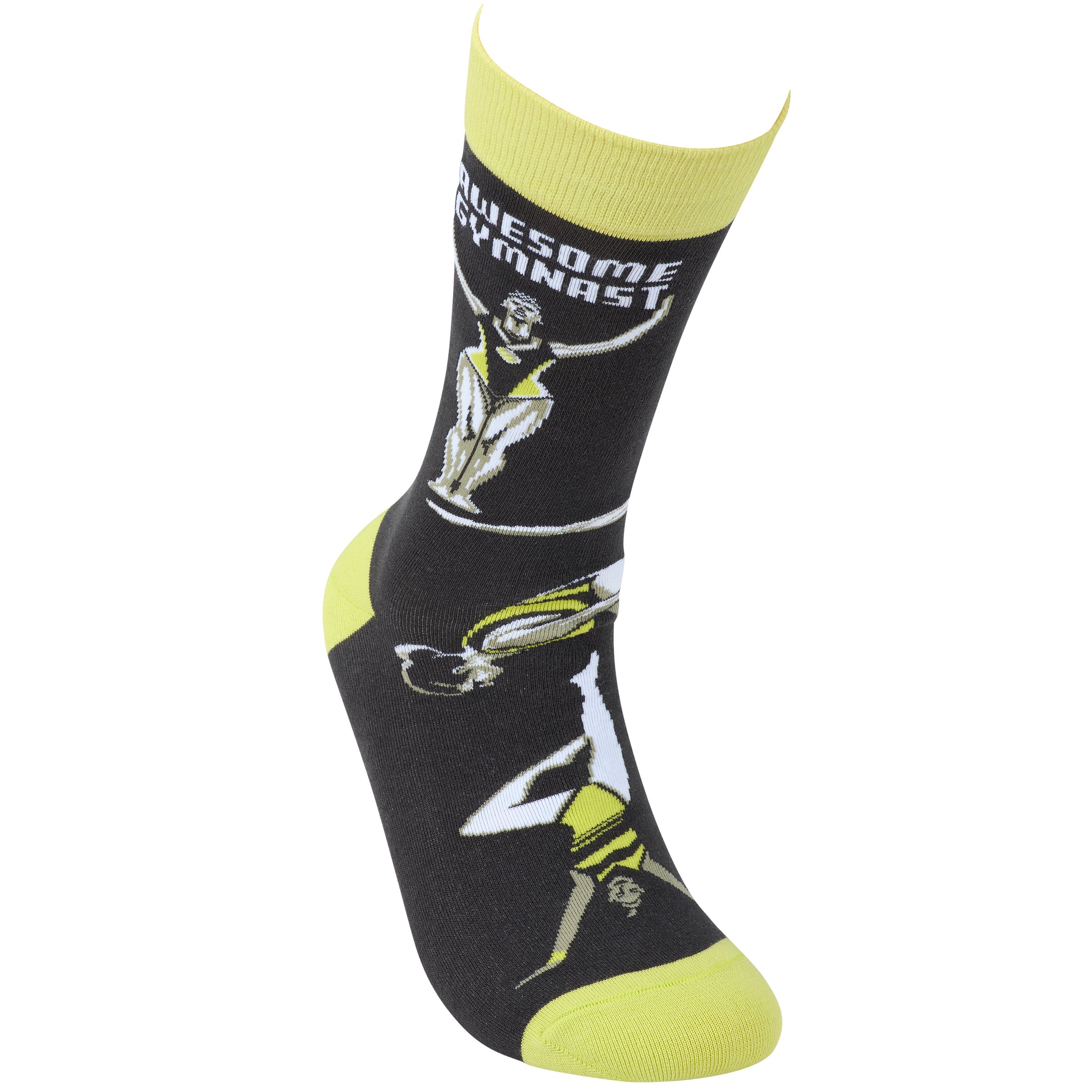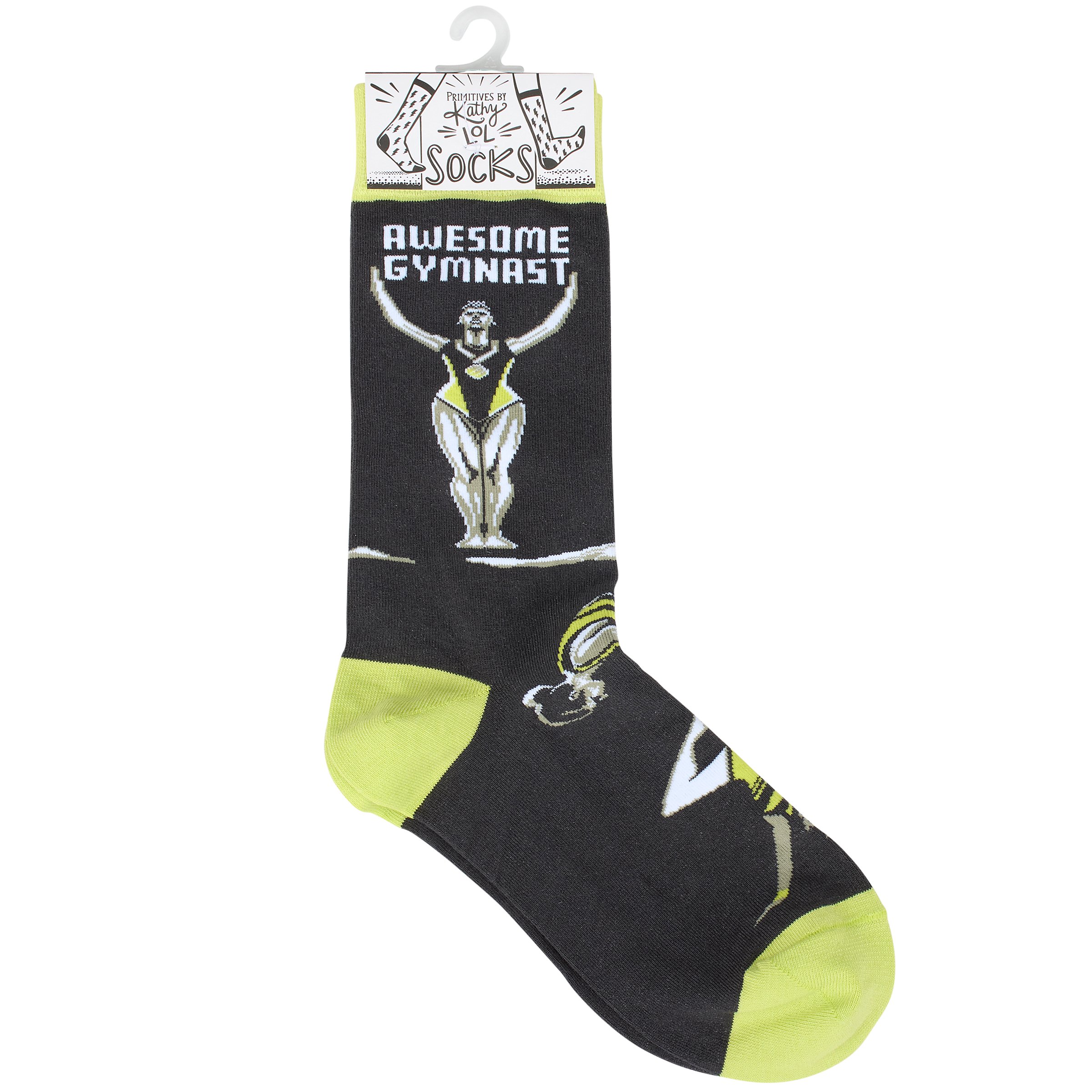 A pair of colorful socks from our LOL-Made You Smile Collection displaying a playful hand illustrated design of various gymnasts with a fun sports inspired sentiment that reads "Awesome Gymnast." These giftable socks are made with a cotton, nylon, and spandex blend for a one size fits most design. Our Awesome Gymnast socks come with a decorative header card and a clear plastic hanger for easy rack display and gifting. A fun gift for gymnasts perfect for everyday self-expression.