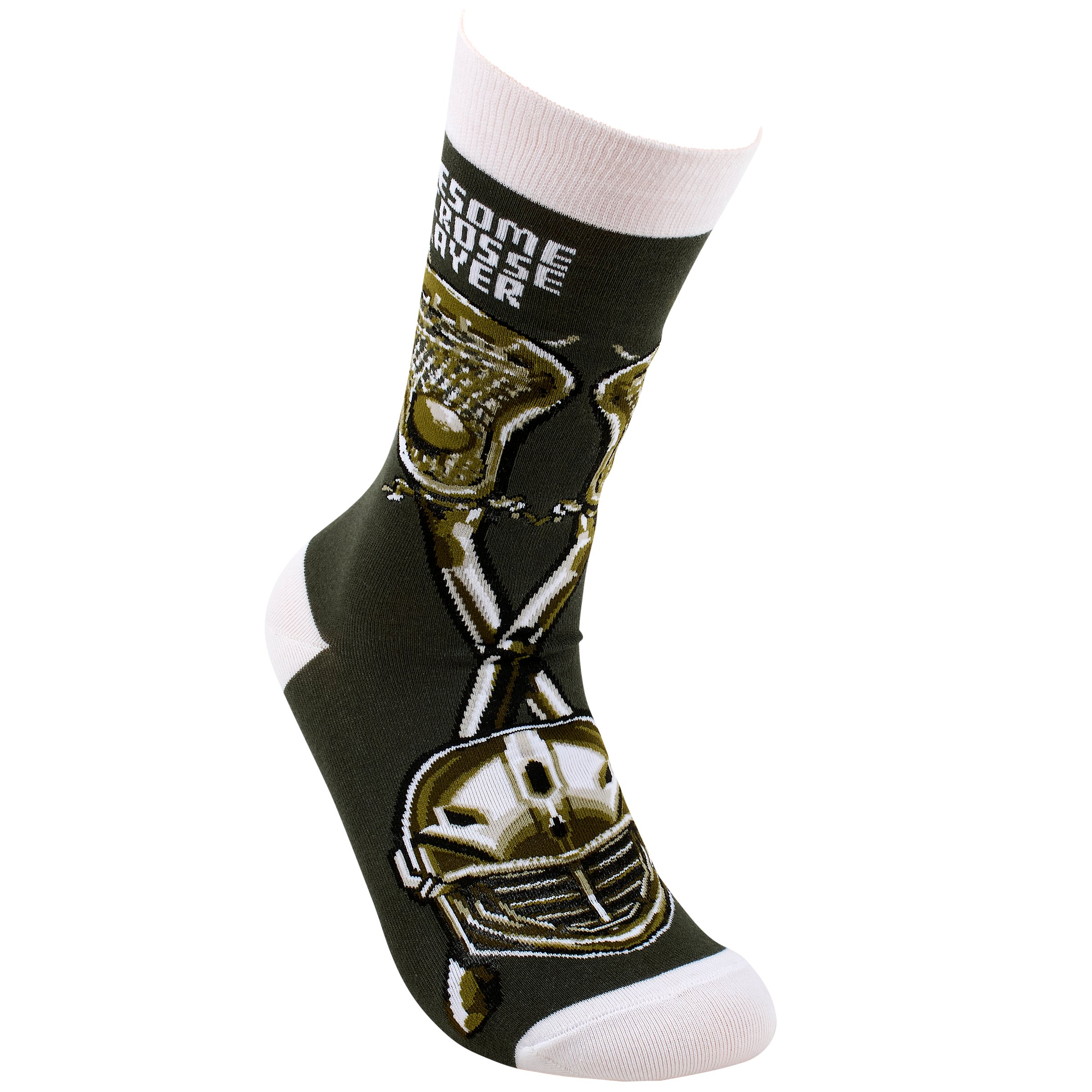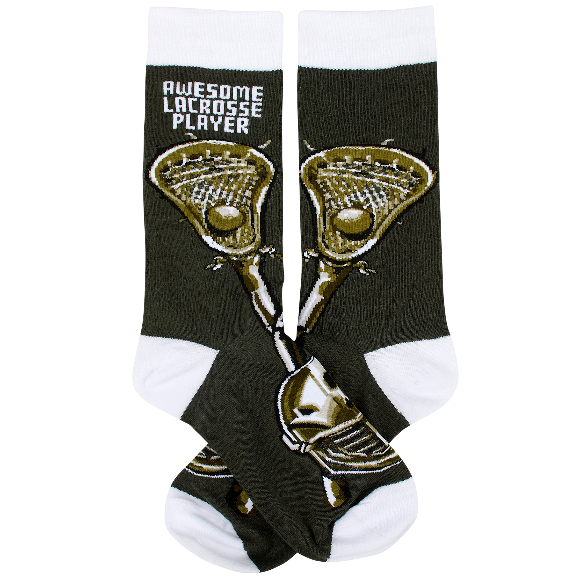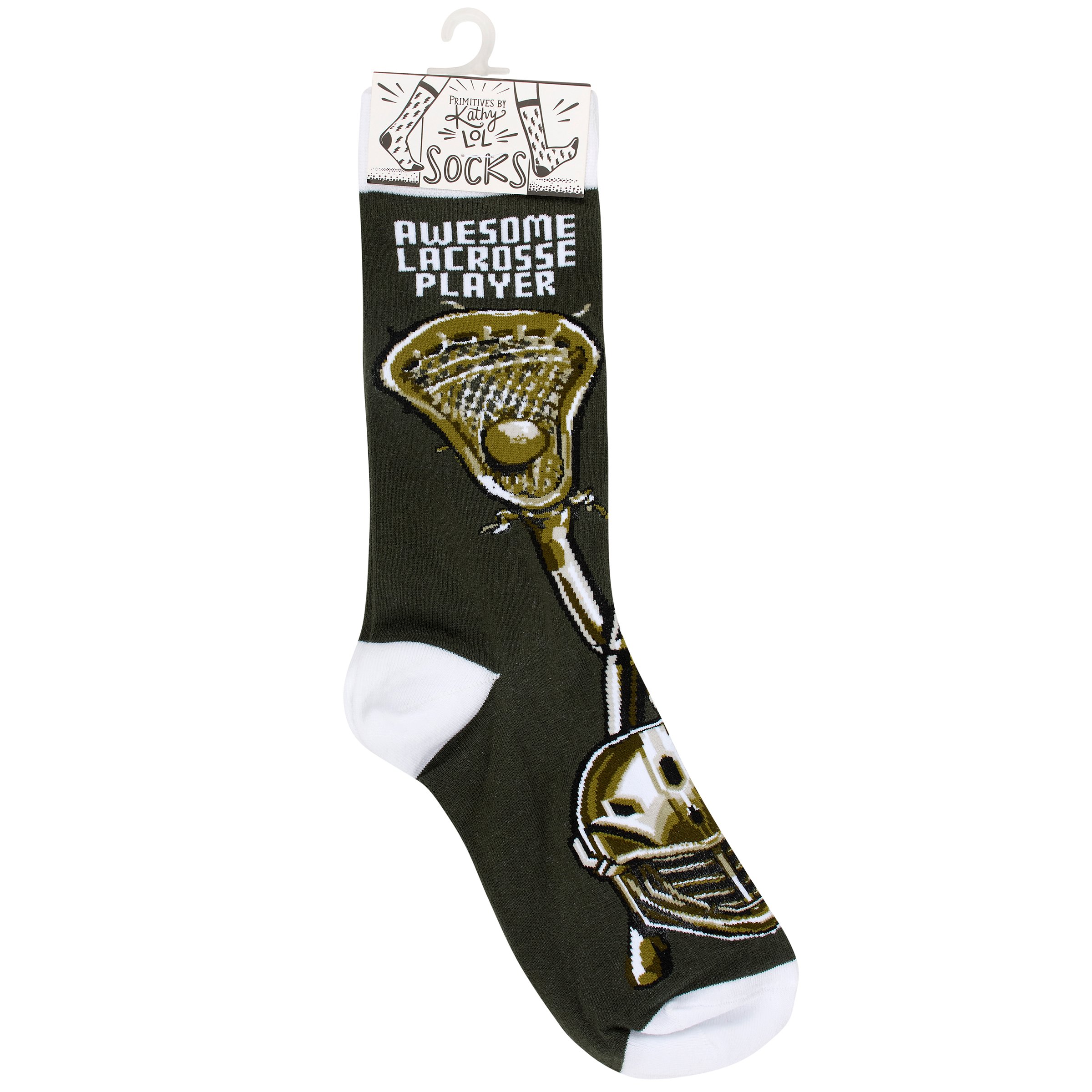 A pair of colorful socks from our LOL-Made You Smile Collection displaying a playful hand illustrated design of lacrosse gear with a fun sports inspired sentiment that reads "Awesome Lacrosse Player." These giftable socks are made with a cotton, nylon, and spandex blend for a one size fits most design. Our Awesome Lacrosse Player socks come with a decorative header card and a clear plastic hanger for easy rack display and gifting. A fun gift for lacrosse players perfect for everyday self-expression.