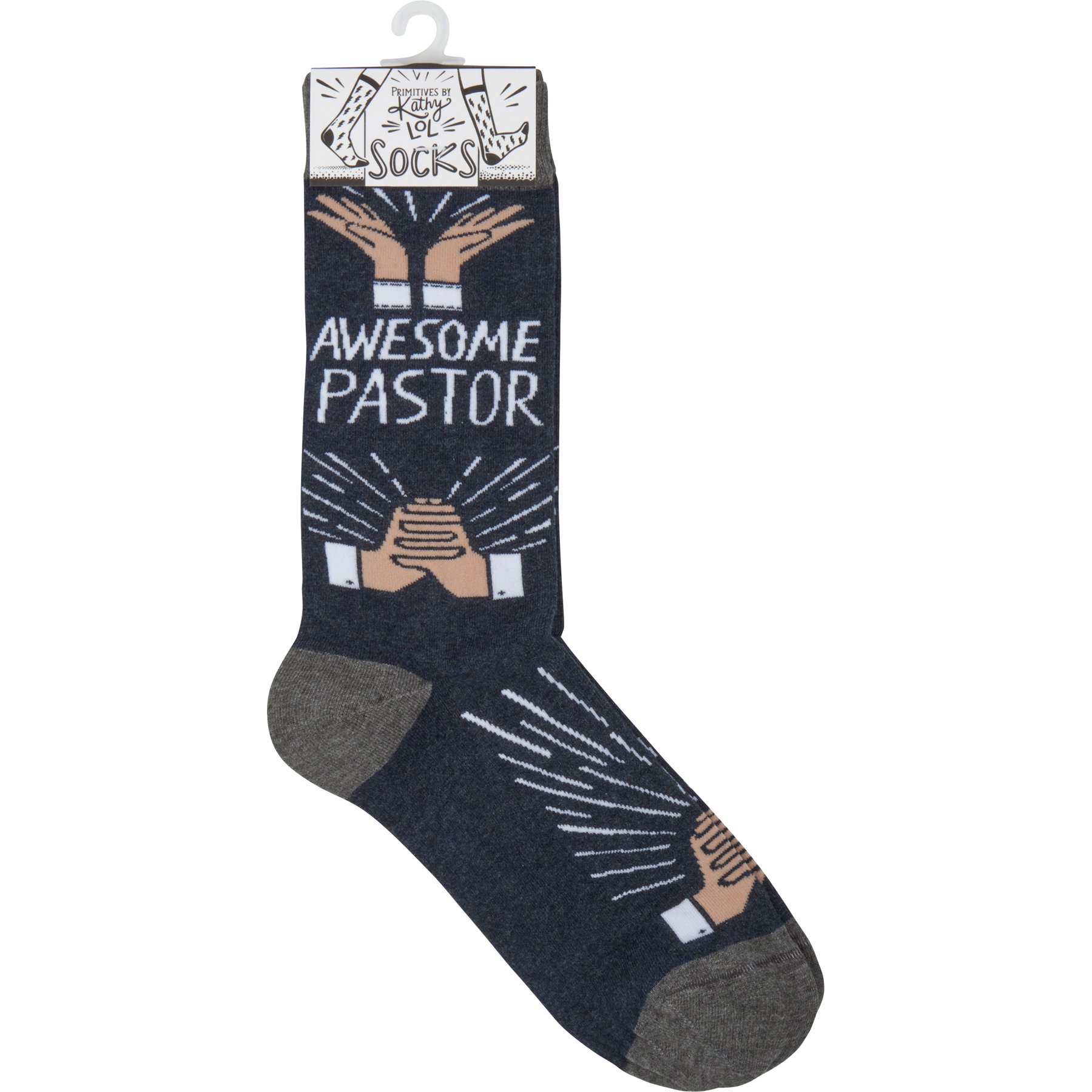 A pair of colorful woven socks from our LOL Made You Smile Collection displaying hand illustrated designs of various pastor hands with "Awesome Pastor" sentiment. Socks feature a one size fits most design made with cotton, nylon, and spandex. Our Awesome Pastor socks come with a header card and a clear plastic hanger for display. A fun everyday accessory perfect for self-expression or gifting on any occasion.