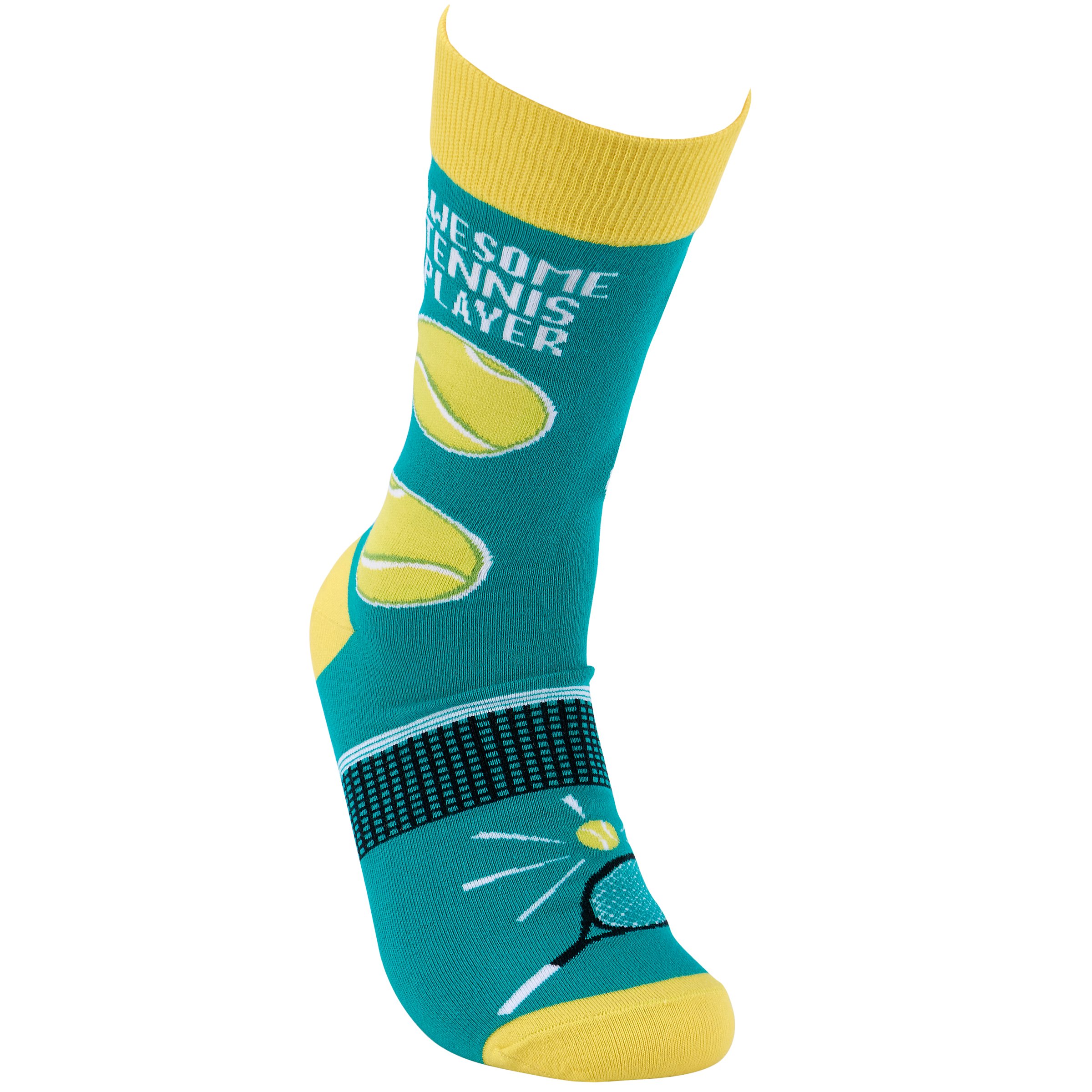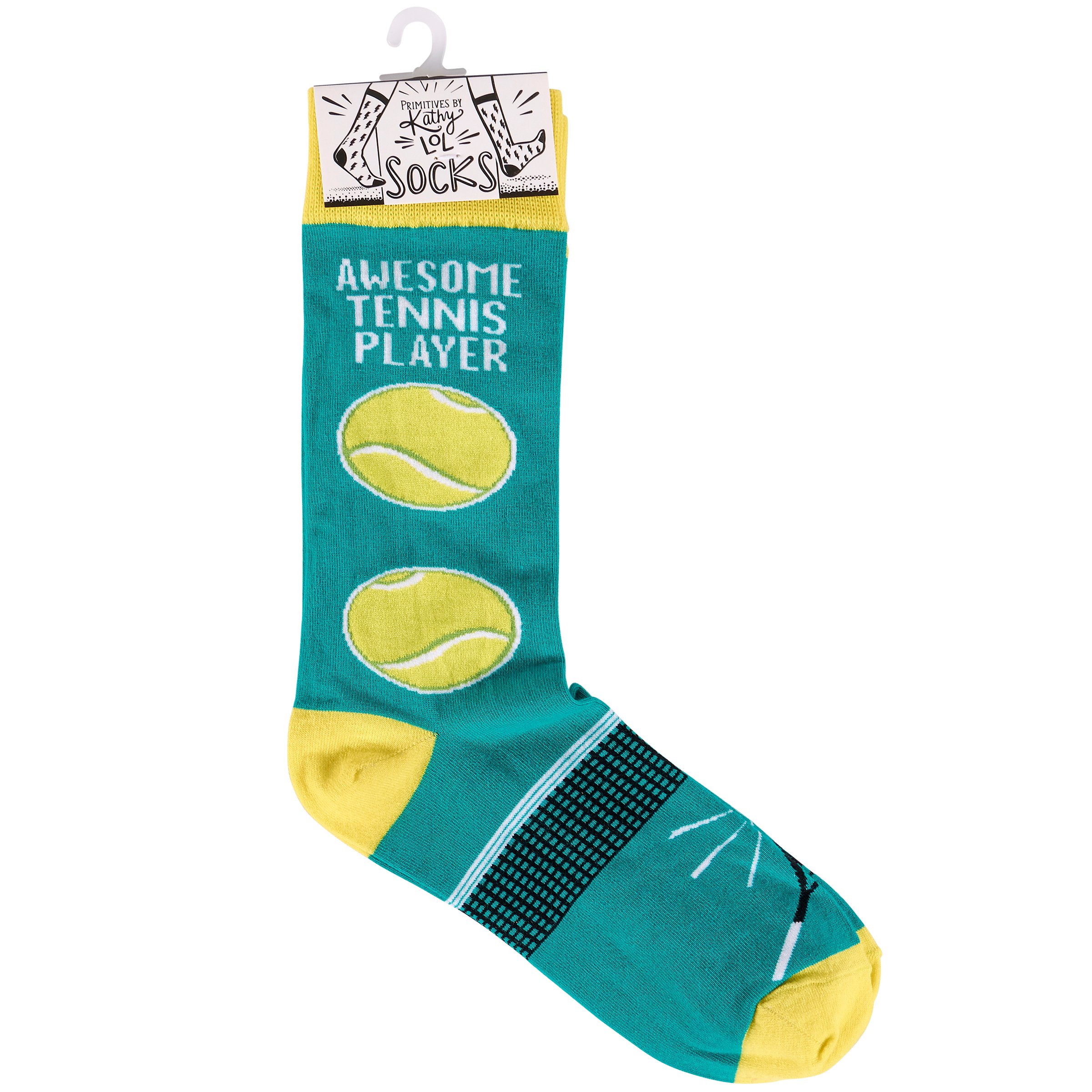 A pair of colorful socks from our LOL-Made You Smile Collection displaying playful hand illustrated designs of tennis balls and tennis racket with a fun sports inspired sentiment that reads "Awesome Tennis Player." These giftable socks are made with a cotton, nylon, and spandex blend for a one size fits most design. Our Awesome Tennis Player socks come with a decorative header card and a clear plastic hanger for easy rack display and gifting. A fun tennis-themed gift perfect for everyday self-expression.