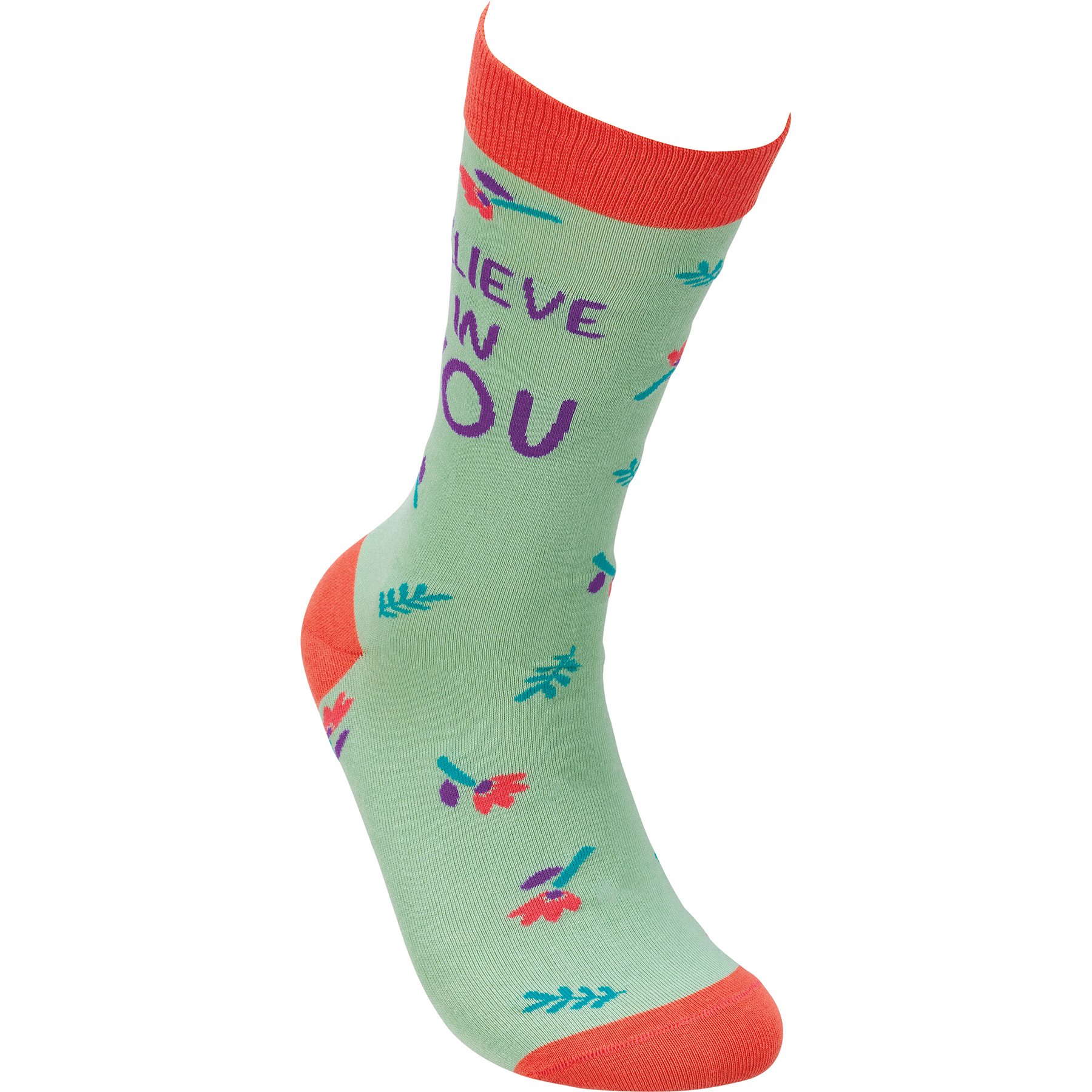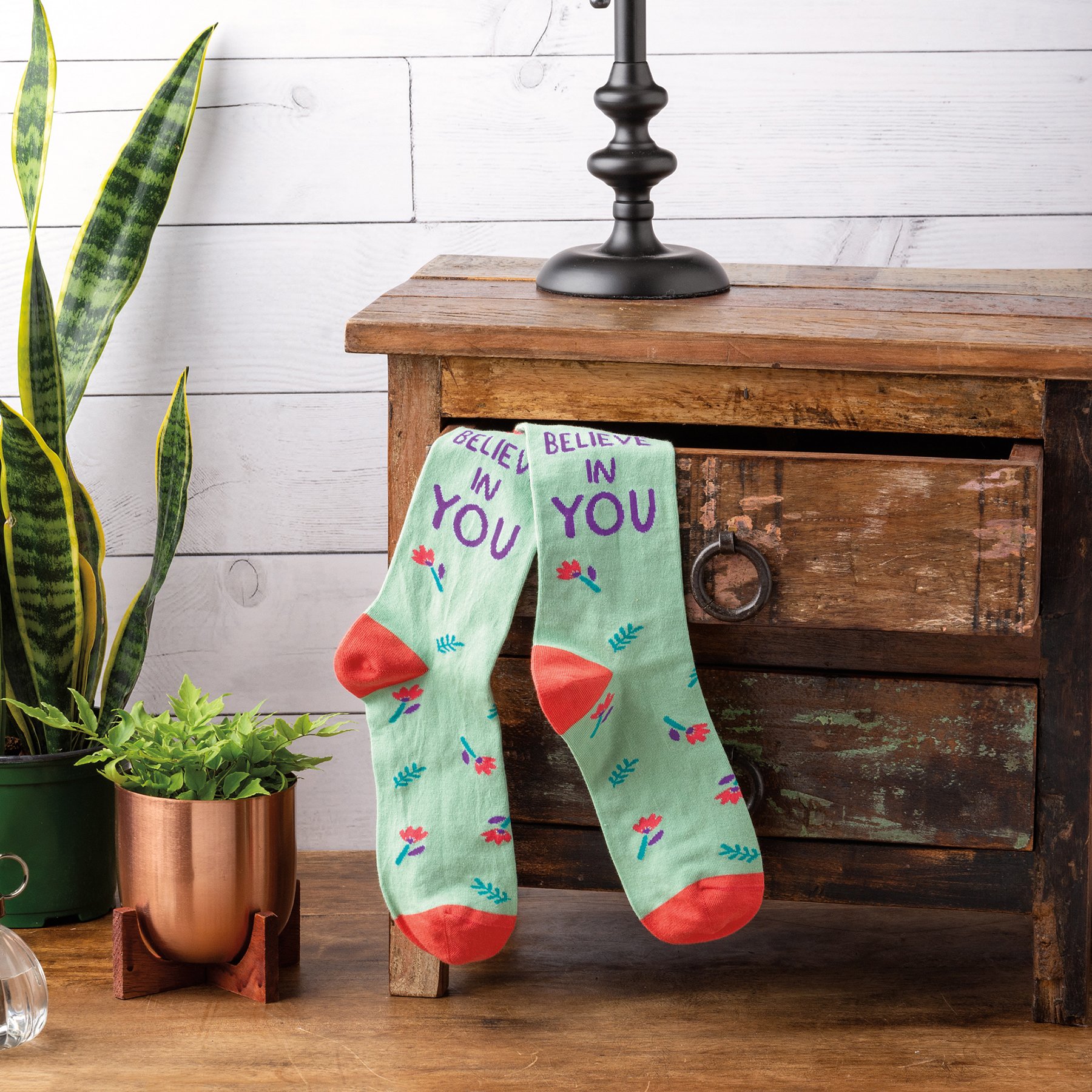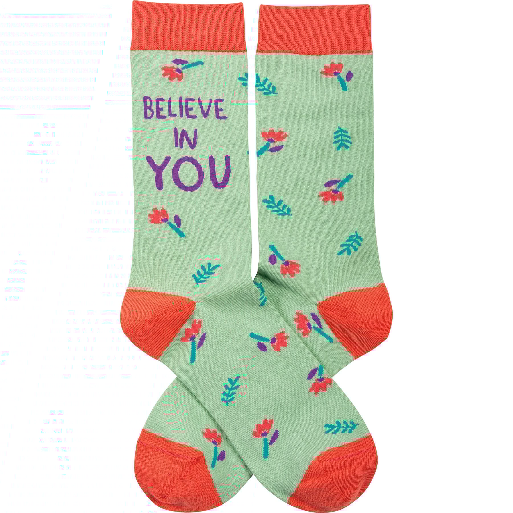 These colorful socks feature woven floral designs with coordinating "Believe In You" sentiment. Cotton, nylon, spandex. One size fits most.