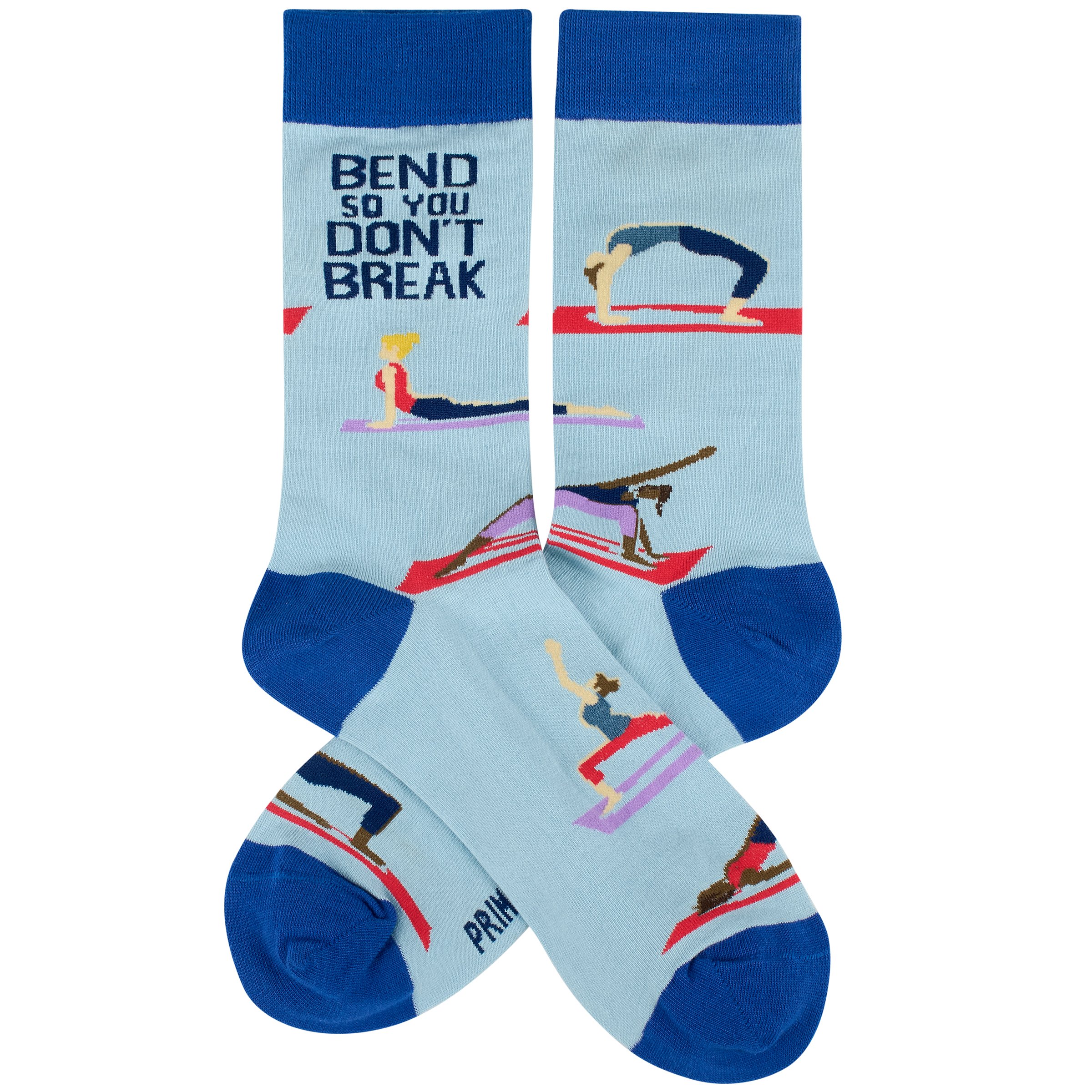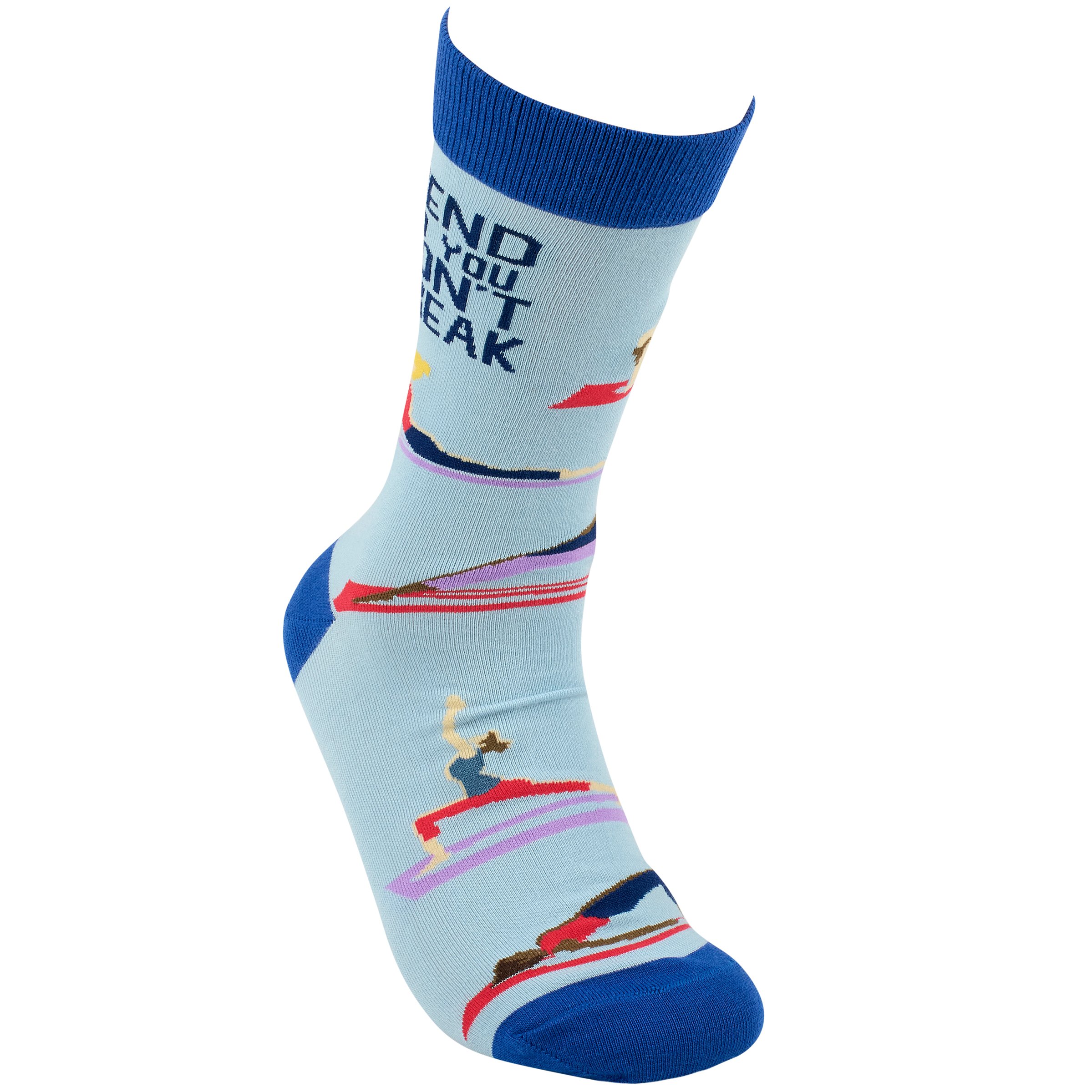 A pair of colorful socks from our LOL-Made You Smile Collection displaying a playful hand illustrated design of various people in yoga poses with a funny sentiment that reads "Bend So You Don't Break." These giftable socks are made with a cotton, nylon, and spandex blend for a one size fits most design. Our Bend So You Don't Break socks come with a decorative header card and a clear plastic hanger for easy rack display and gifting. A fun yoga gift perfect for everyday self-expression.
