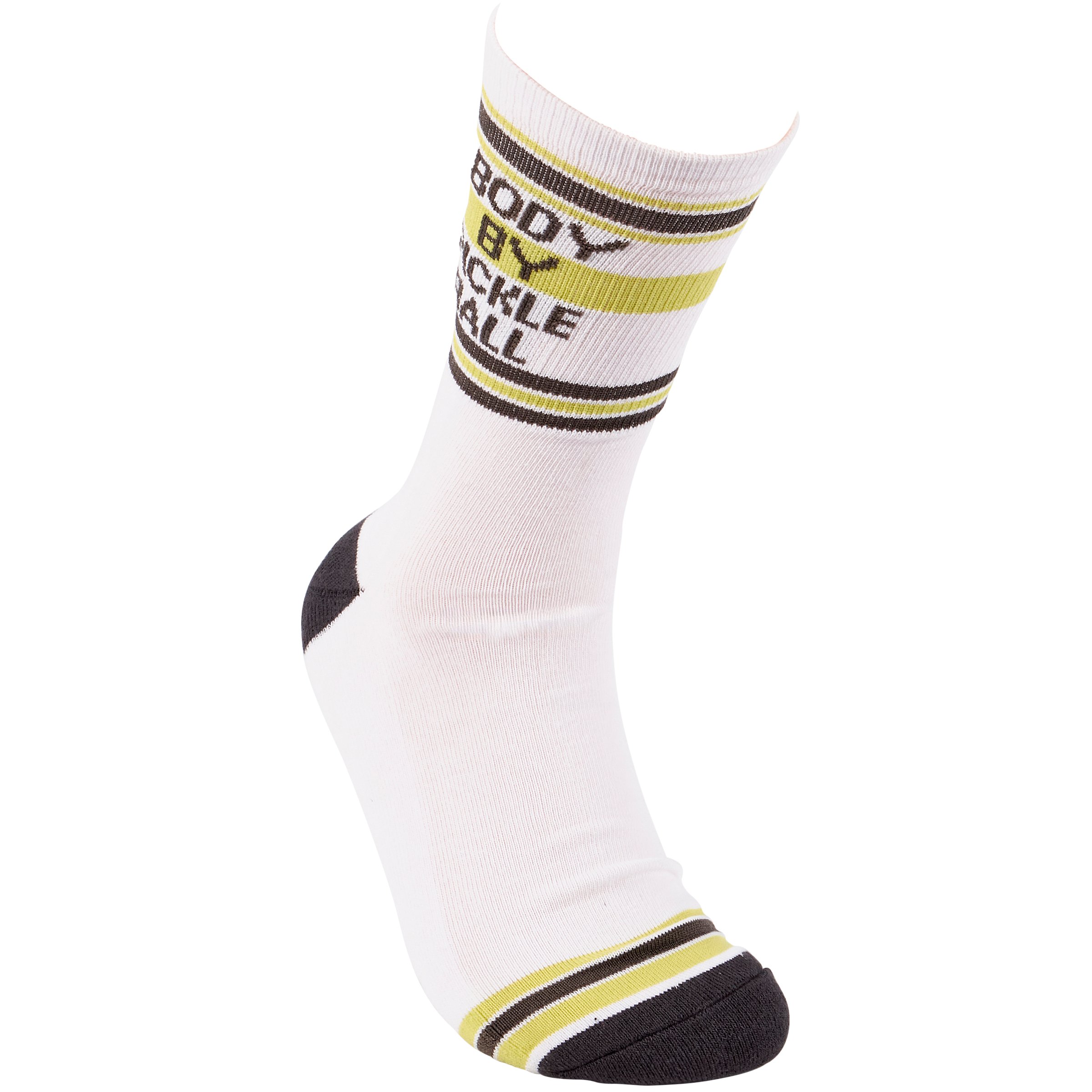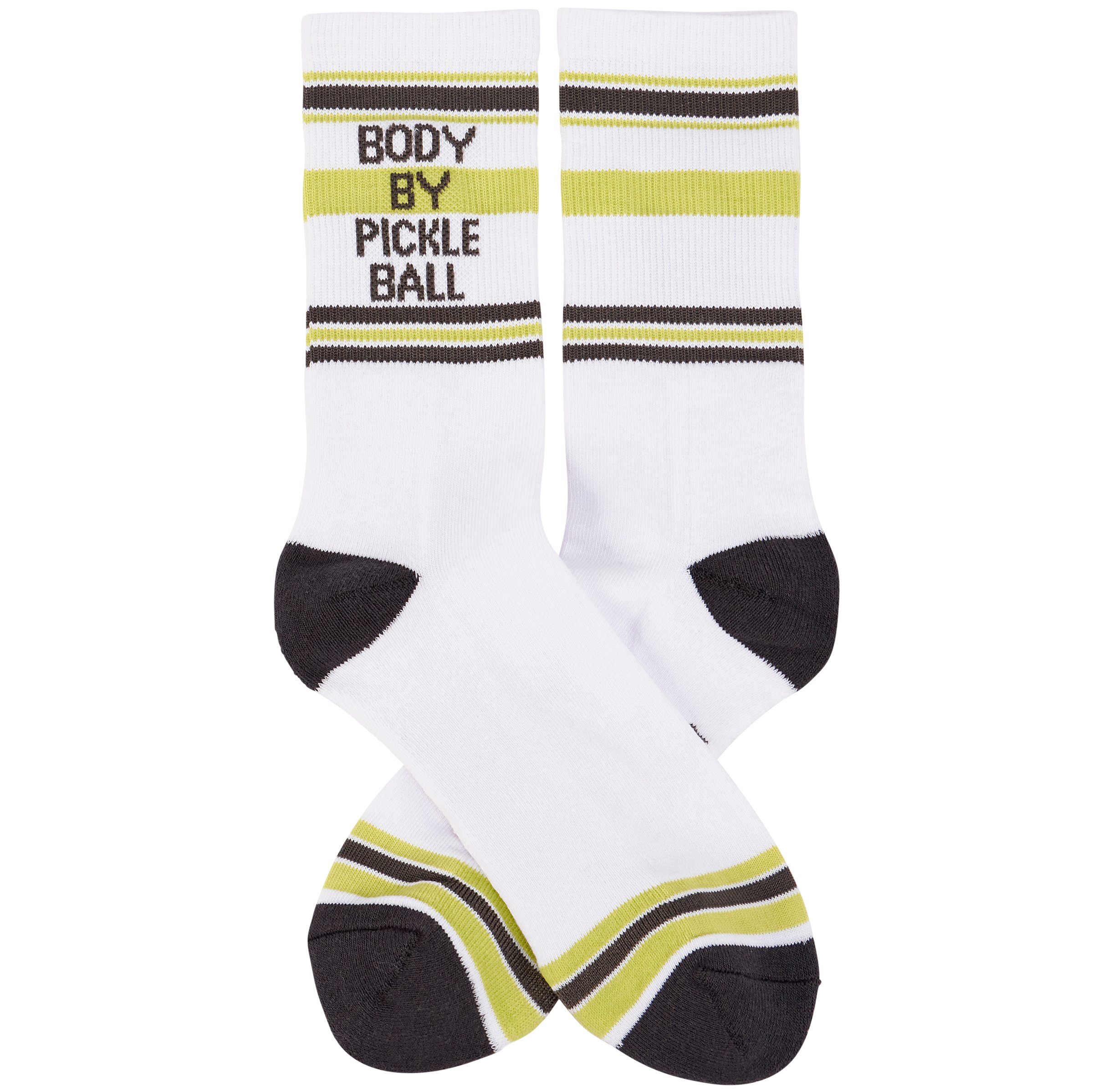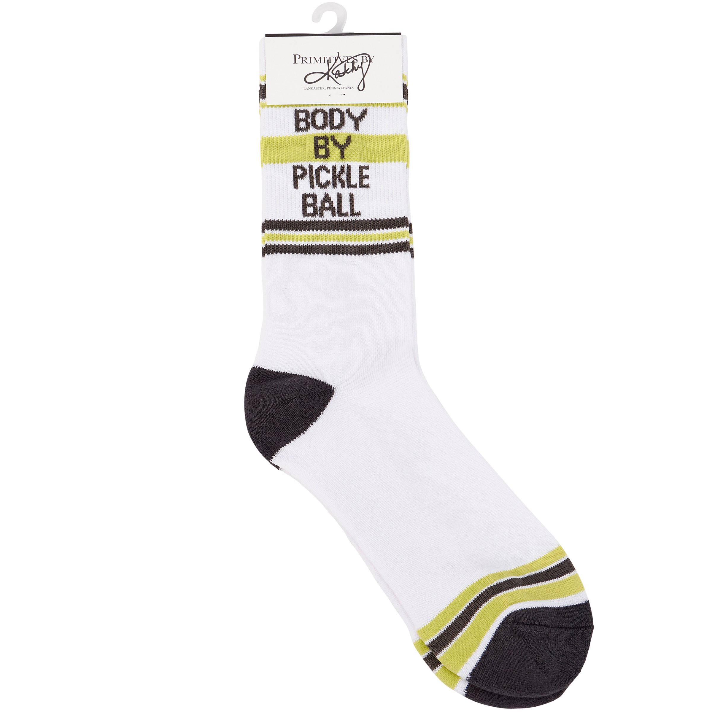 A pair of colorful socks from our Sports Collection displaying a tube sock inspired design with a fun pickleball-themed sentiment that reads "Body By Pickleball." These giftable socks are made with a cotton, nylon, and spandex blend for a one size fits most design. Our Body By Pickleball socks come with a decorative header card and a clear plastic hanger for easy rack display and gifting. A fun pickleball gift perfect for everyday self-expression.