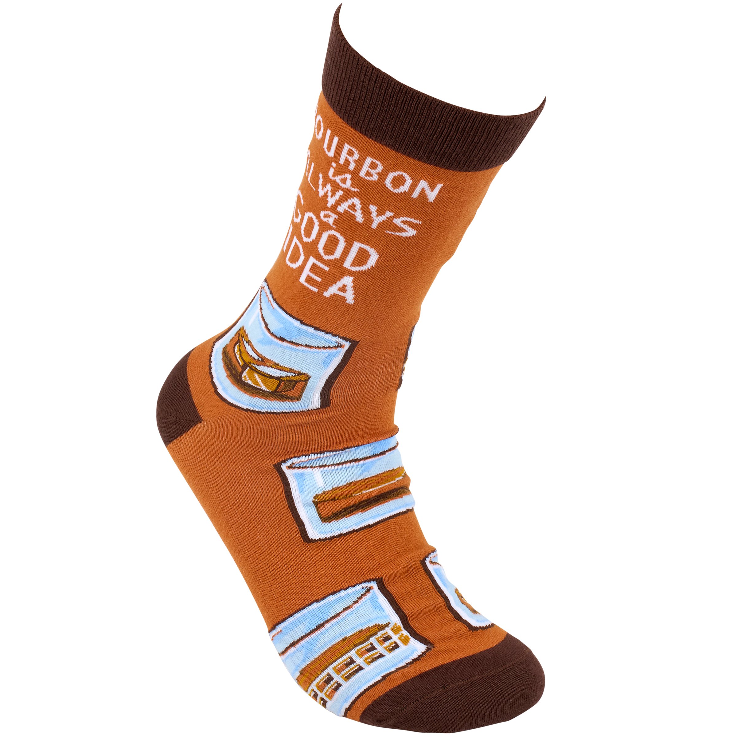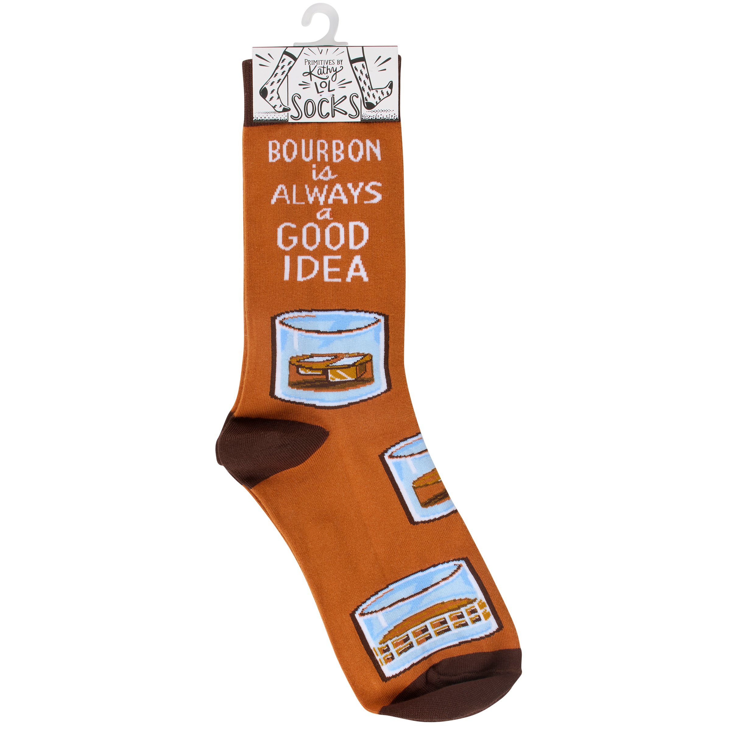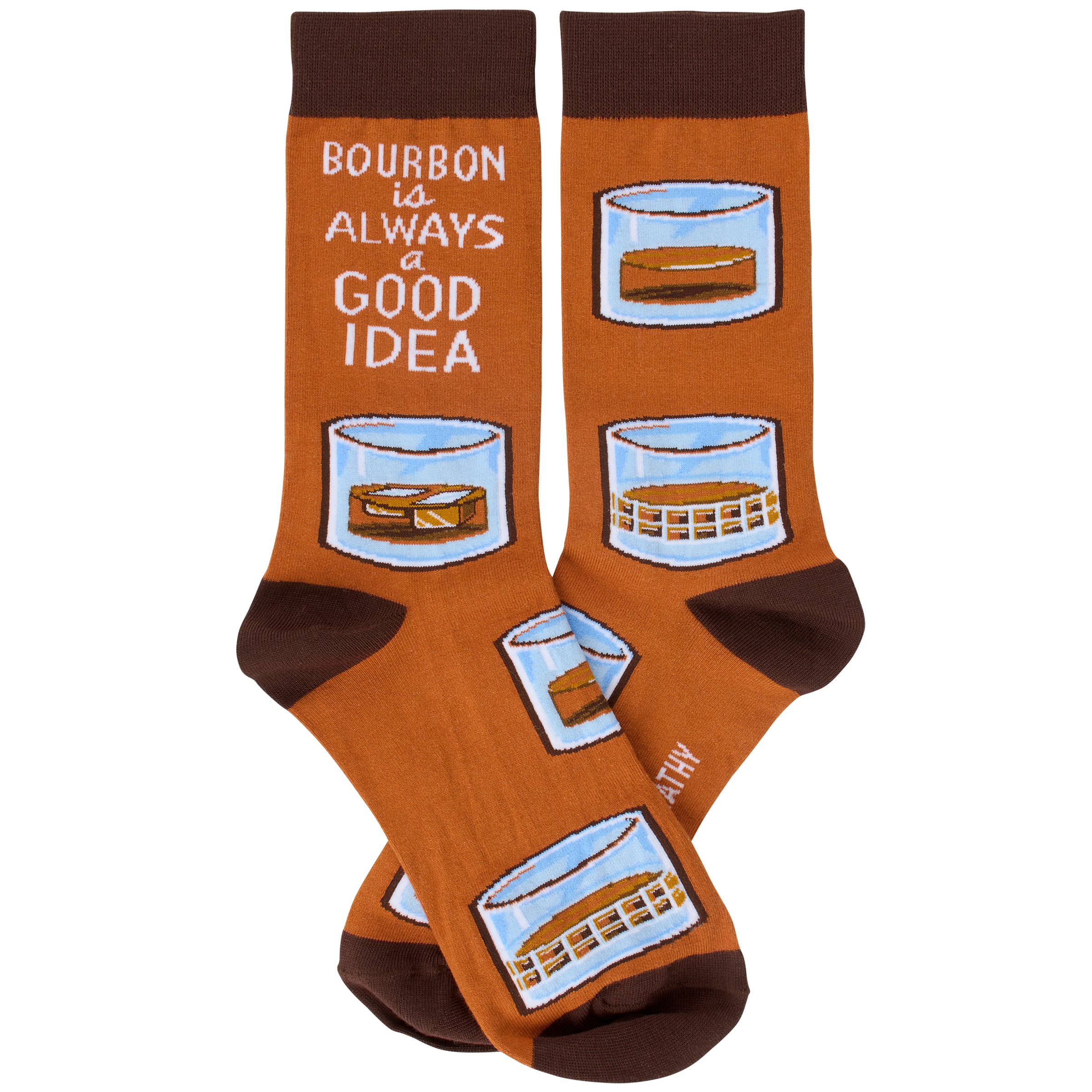 A pair of colorful socks from our LOL-Made You Smile Collection displaying playful hand illustrated designs of various bourbon drinks with a fun alcohol inspired sentiment that reads "Bourbon Is Always A Good Idea." These giftable socks are made with a cotton, nylon, and spandex blend for a one size fits most design. Our Bourbon Is A Good Idea socks come with a decorative header card and a clear plastic hanger for easy rack display and gifting. A fun alcohol themed gift perfect for everyday self-expression.