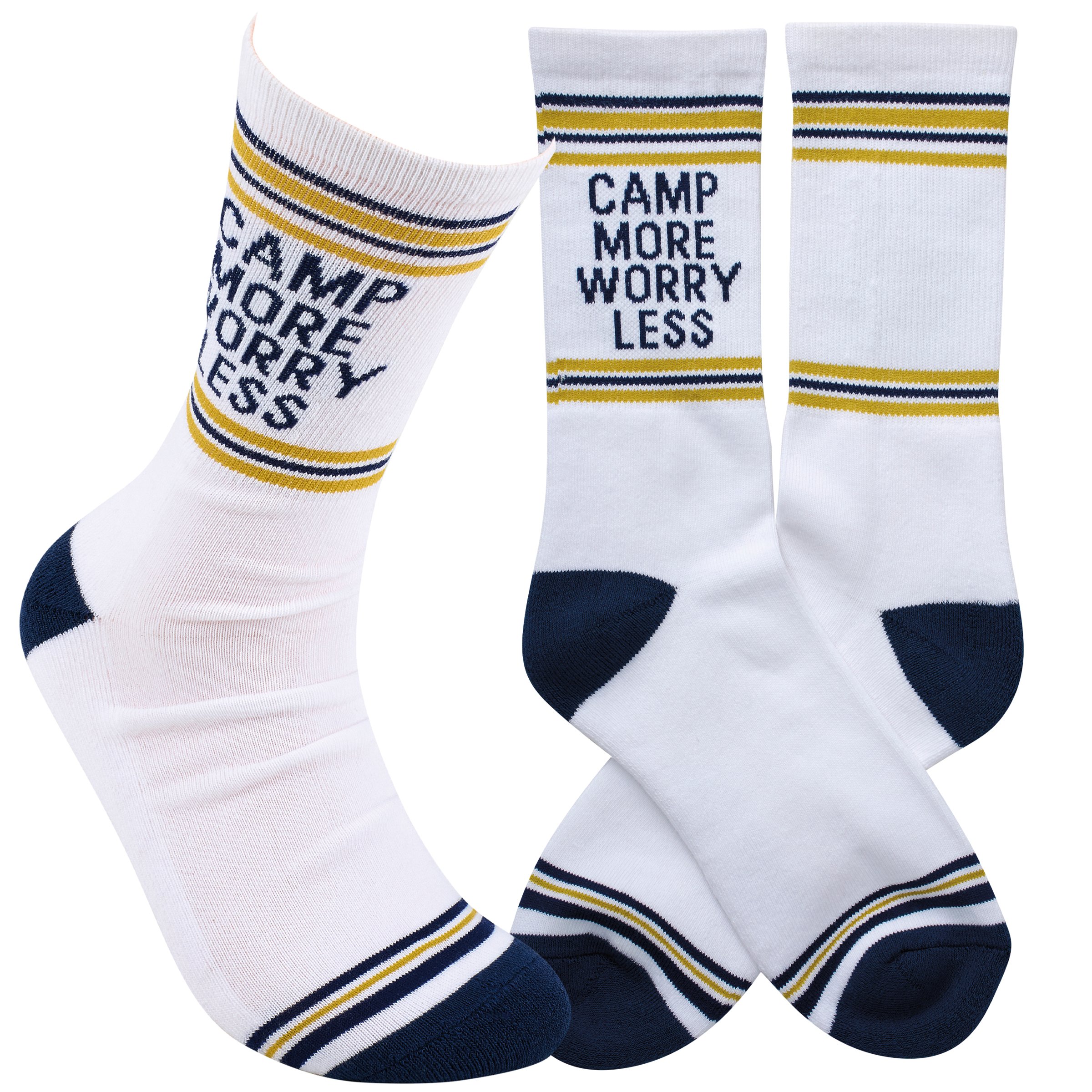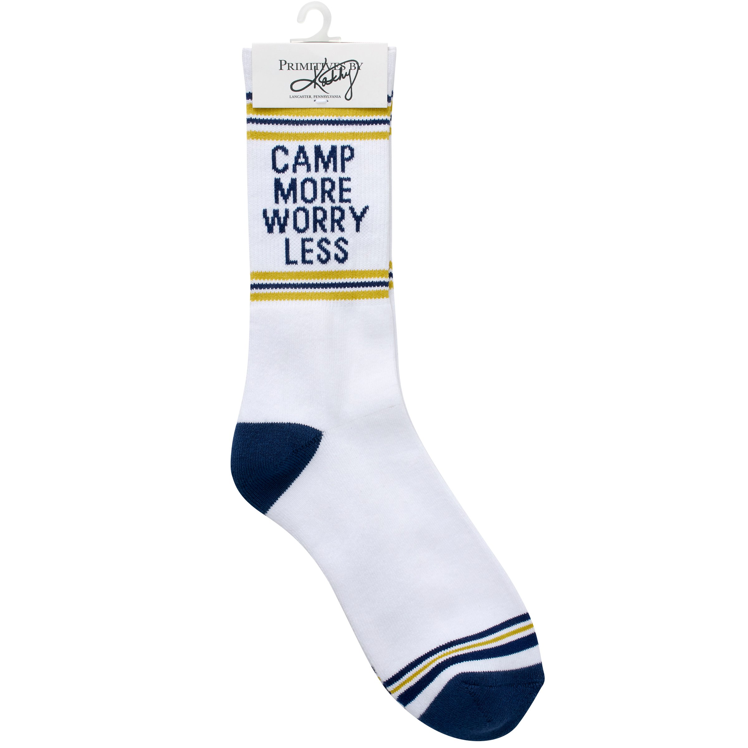 A pair of fun socks from our Lake & Cabin Collection displaying a vintage varsity sock inspired blue and yellow stripe design with a camping themed sentiment that reads "Camp More Worry Less." These giftable socks are made with a cotton, nylon, and spandex blend for a one size fits most design. Our Camp More Worry Less socks come with a decorative header card and a clear plastic hanger for easy rack display and gifting. A fun camping themed gift perfect for everyday self-expression.
