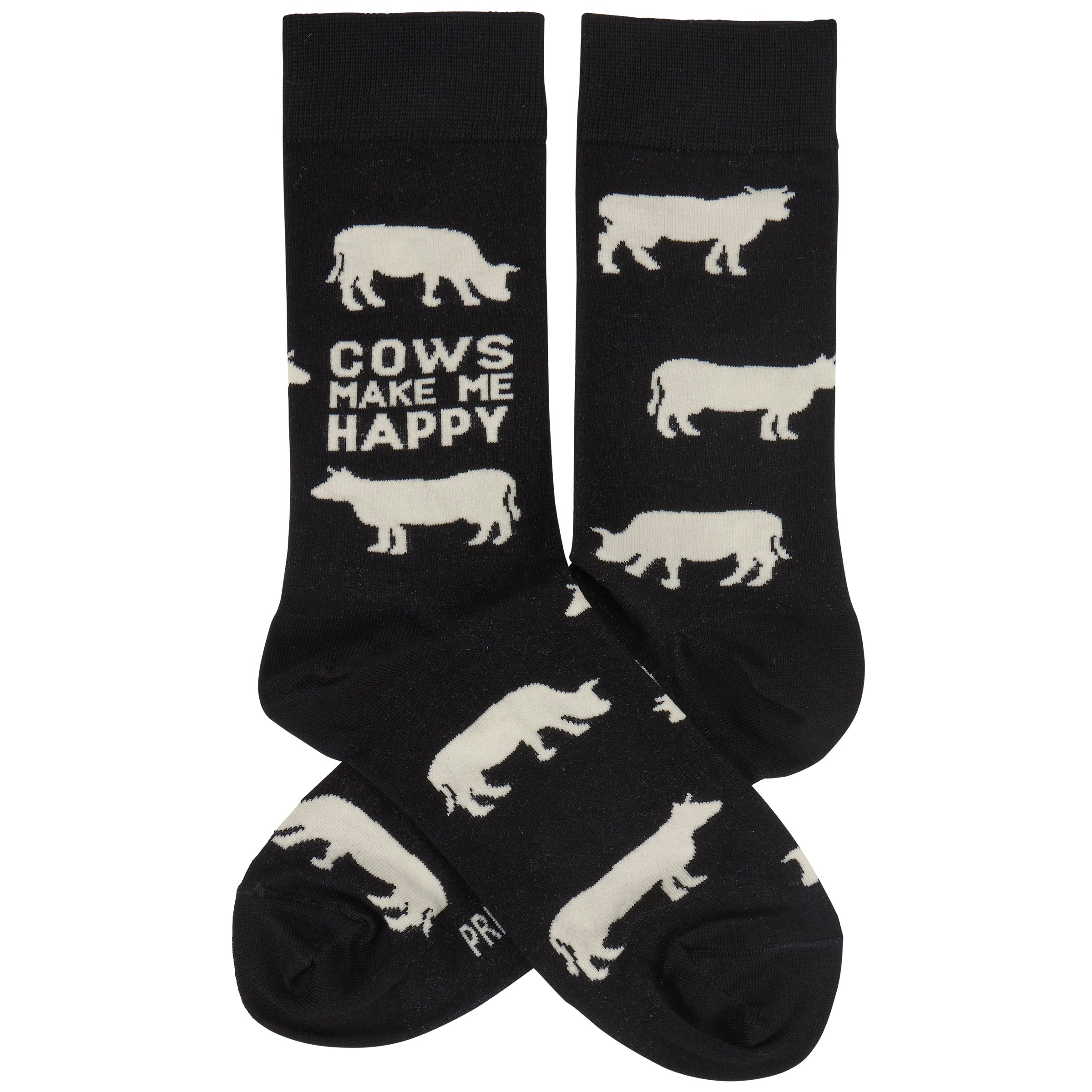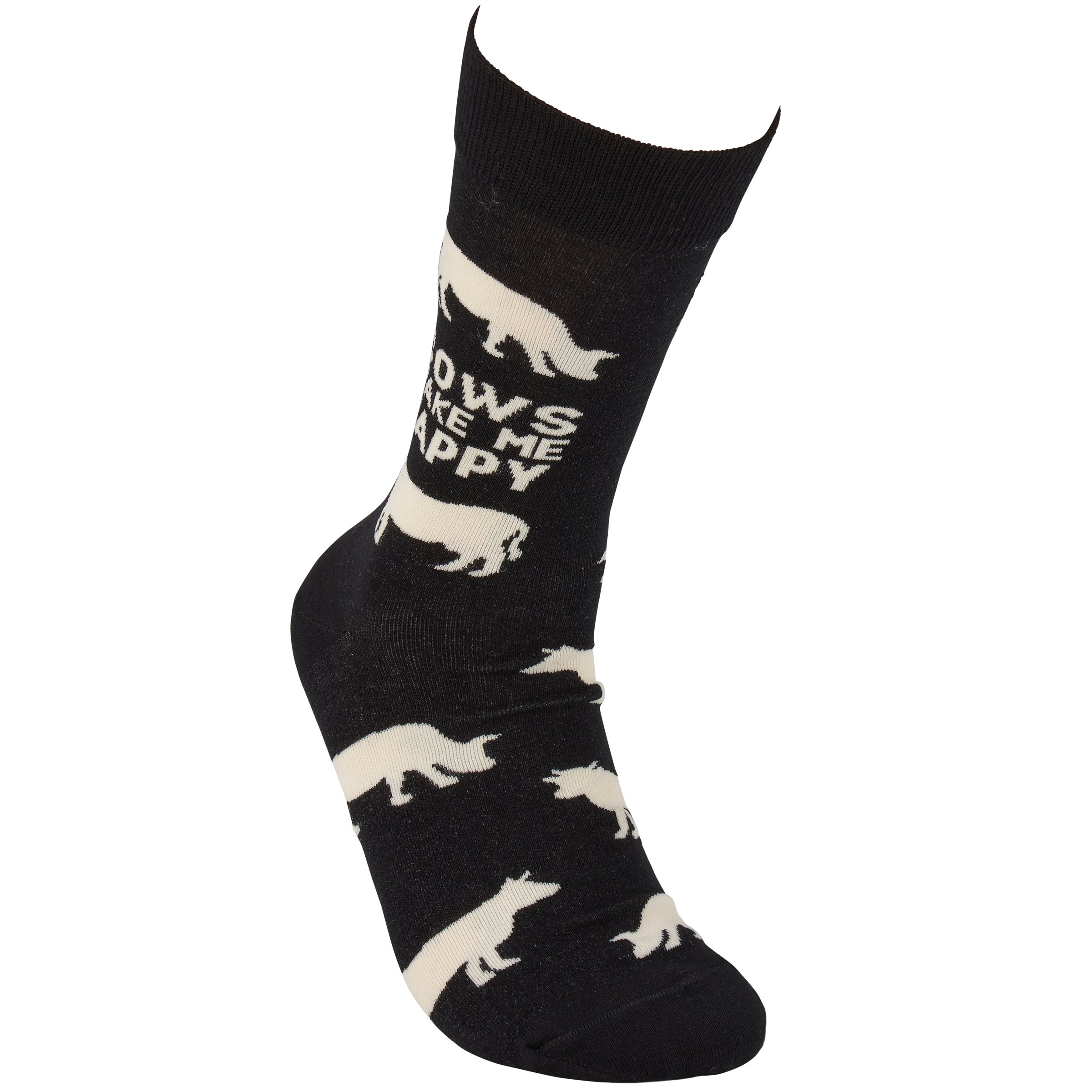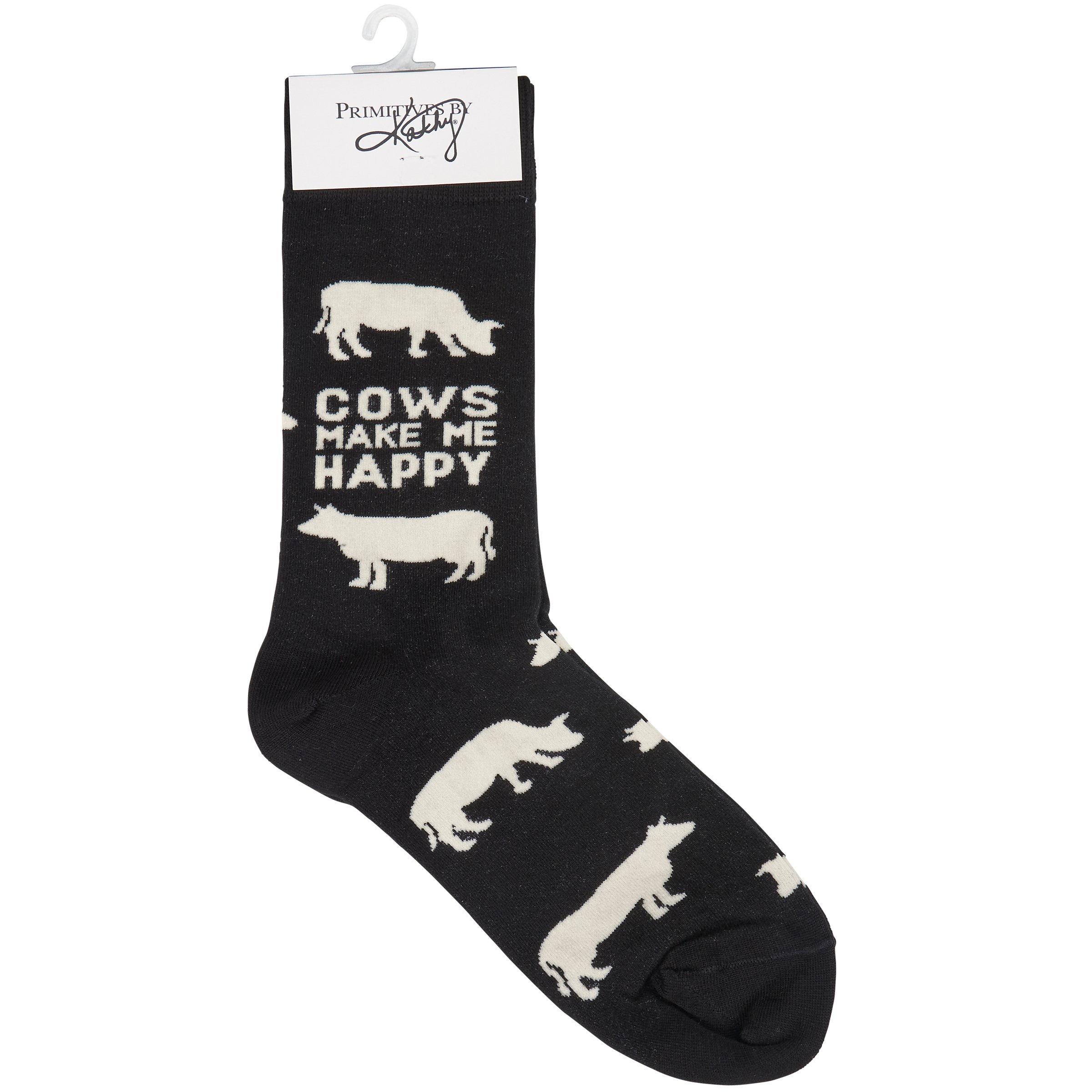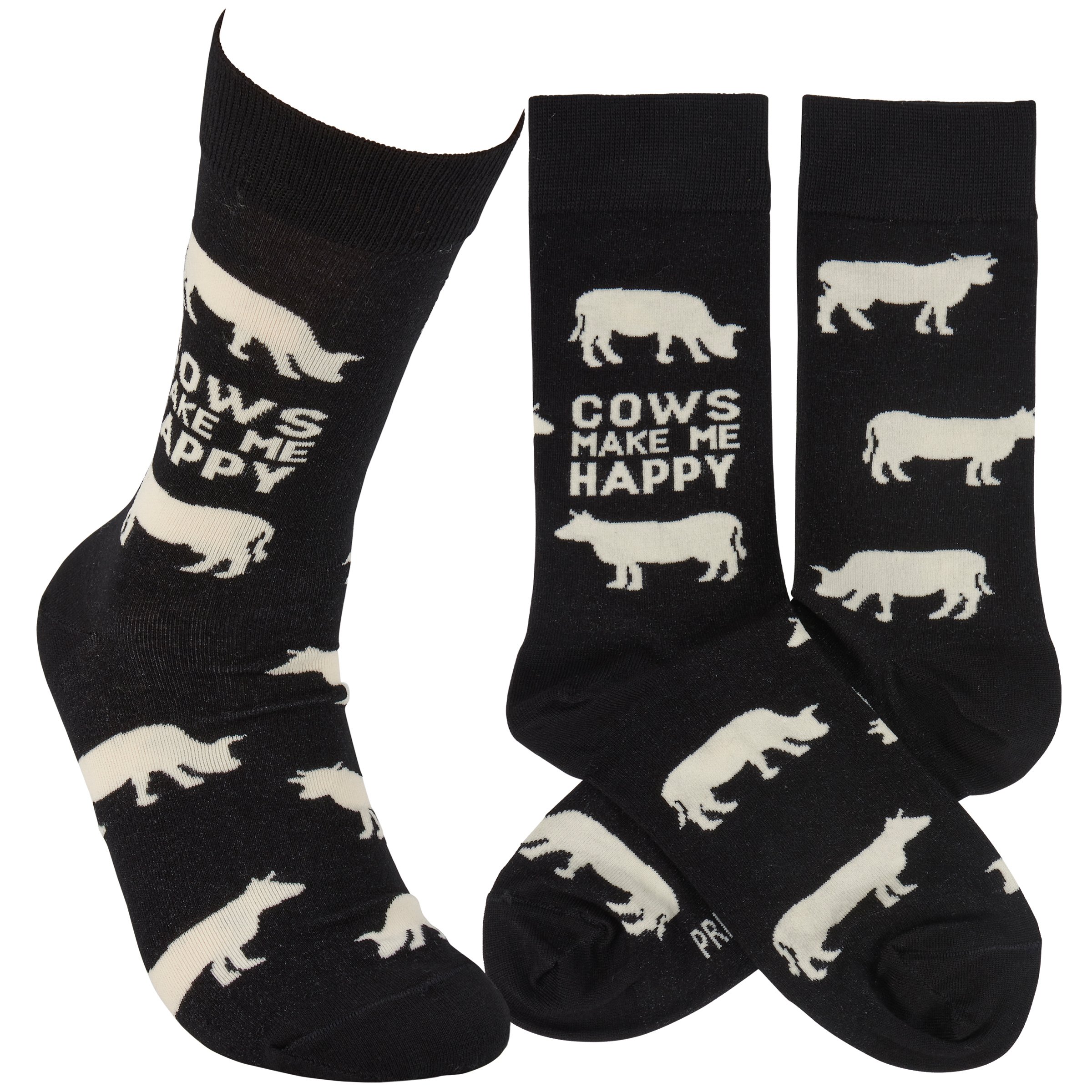 A pair of black and white socks from our Farmhouse Collection displaying various cow designs with a farm inspired sentiment that reads "Cows Make Me Happy." Socks feature a one size fits most design made with cotton, nylon, and spandex. Our Cows Make Me Happy socks come with a header card and a clear plastic hanger for display. A fun farm-themed gift perfect for everyday self-expression.