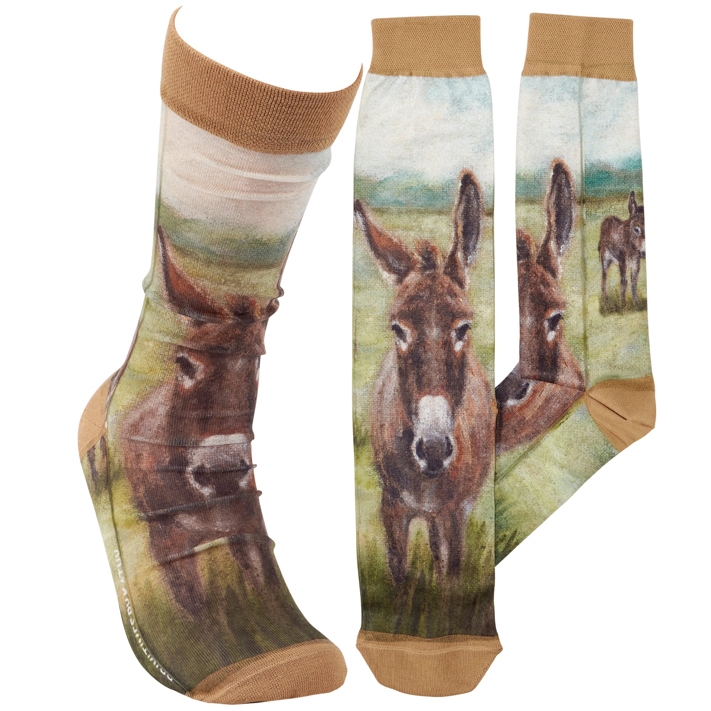 A pair of colorful knee-high socks from our Farmhouse Collection displaying a hand painted design of donkeys in a field on each sock. Donkey design is digitally printed replicating original artwork painted onto burlap canvas, giving the art a unique depth and texture. These giftable socks feature a knee-high length to easily show off the full design made with a spandex blend for a one size fits most design. Our knee-high Donkey socks come with a decorative header card and a clear plastic hanger for easy rack display and gifting. A charming farm-themed gift perfect for everyday self-expression.