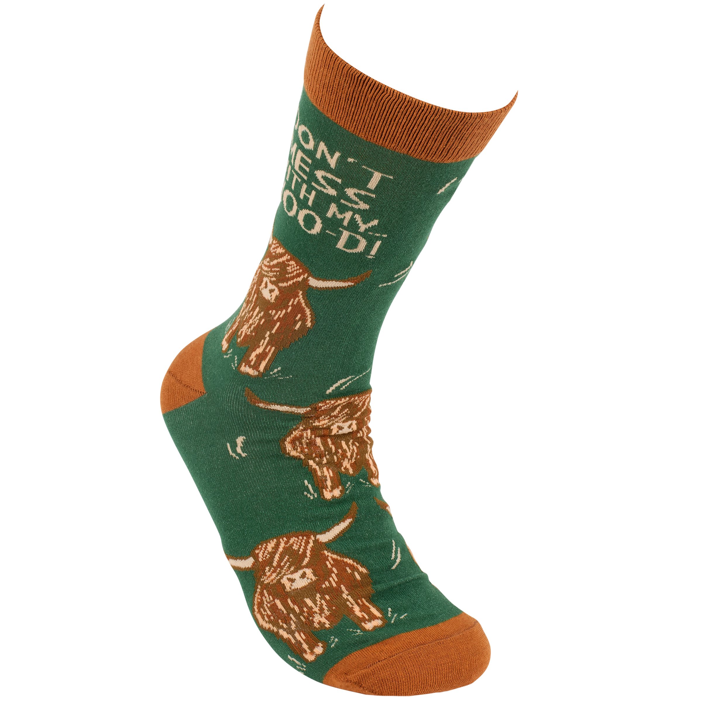 A pair of colorful socks from our Homestead Collection displaying playful hand illustrated designs of highland cows with a fun farm inspired sentiment that reads "Don't Mess With My Moo-d!" These giftable socks are made with a cotton, nylon, and spandex blend for a one size fits most design. Our Don't Mess With My Moo-d socks come with a decorative header card and a clear plastic hanger for easy rack display and gifting. A fun farm themed gift perfect for everyday self-expression.