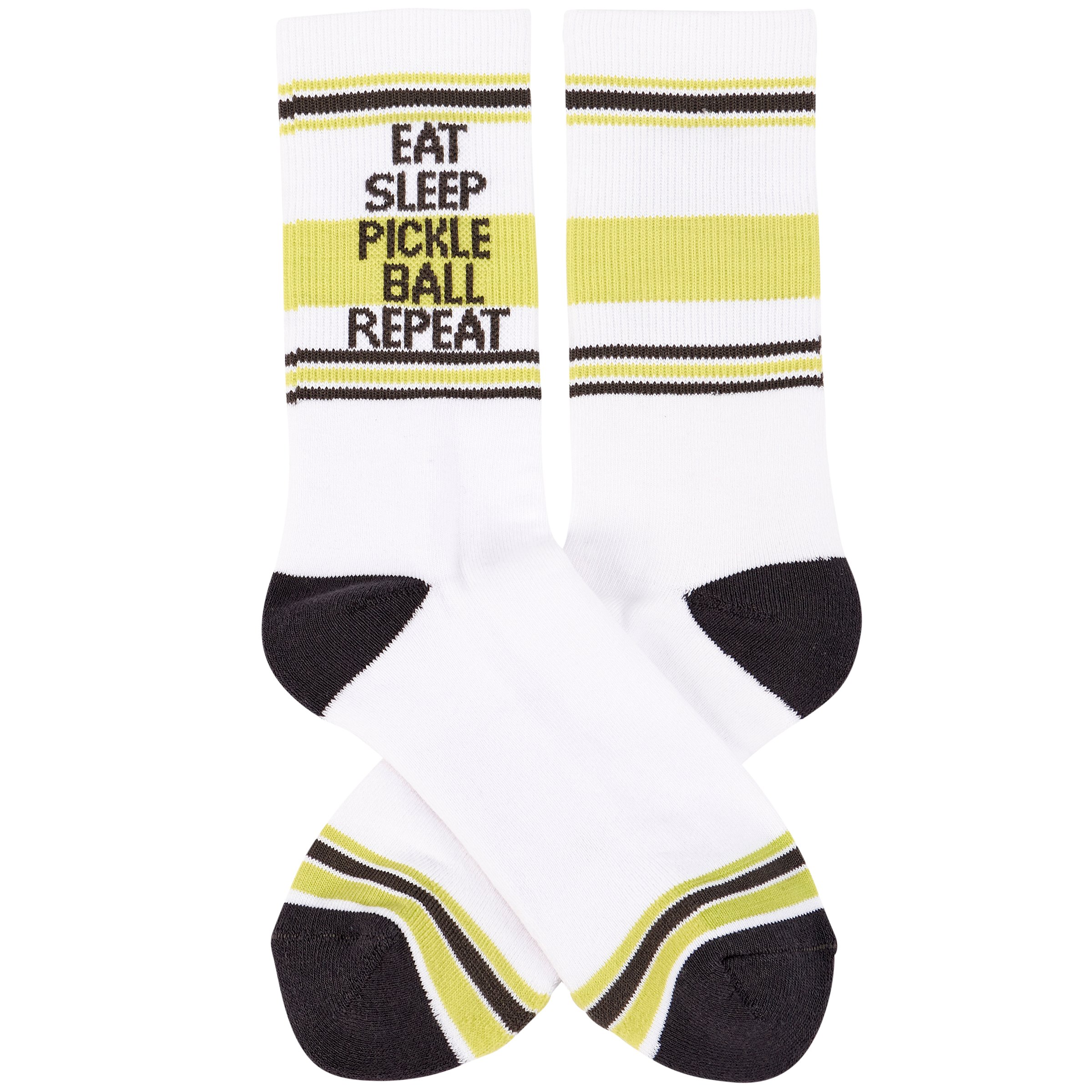 A pair of colorful socks from our Sports Collection displaying a tube sock inspired design with a fun pickleball-themed sentiment that reads "Eat Sleep Pickleball Repeat." These giftable socks are made with a cotton, nylon, and spandex blend for a one size fits most design. Our Eat Sleep Pickleball socks come with a decorative header card and a clear plastic hanger for easy rack display and gifting. A fun pickleball gift perfect for everyday self-expression.