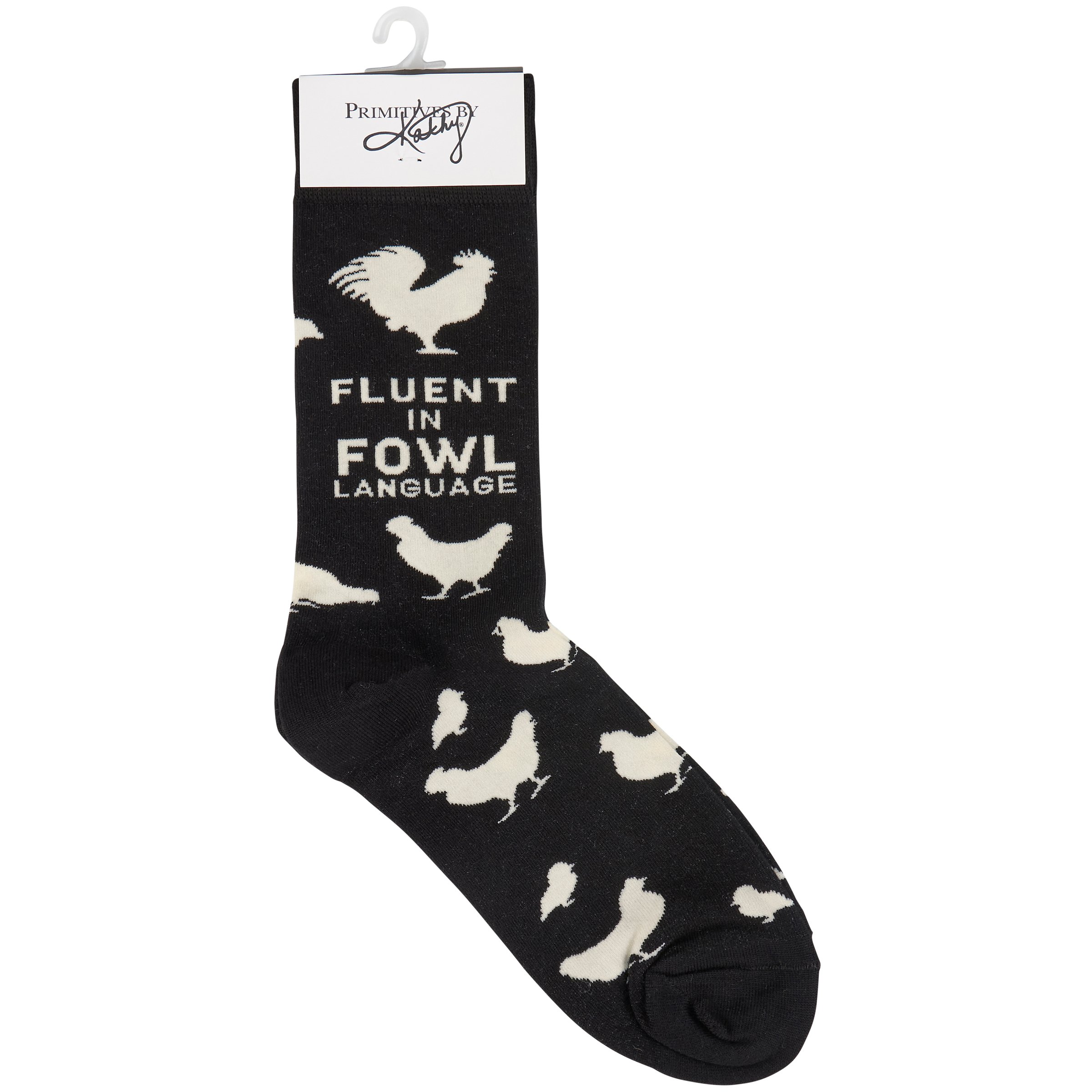 A pair of black and white socks from our Farmhouse Collection displaying various chicken and rooster designs with a farm inspired sentiment that reads "Fluent In Fowl Language." Socks feature a one size fits most design made with cotton, nylon, and spandex. Our Fluent in Fowl Language socks come with a header card and a clear plastic hanger for display. A fun farm-themed gift perfect for everyday self-expression.
