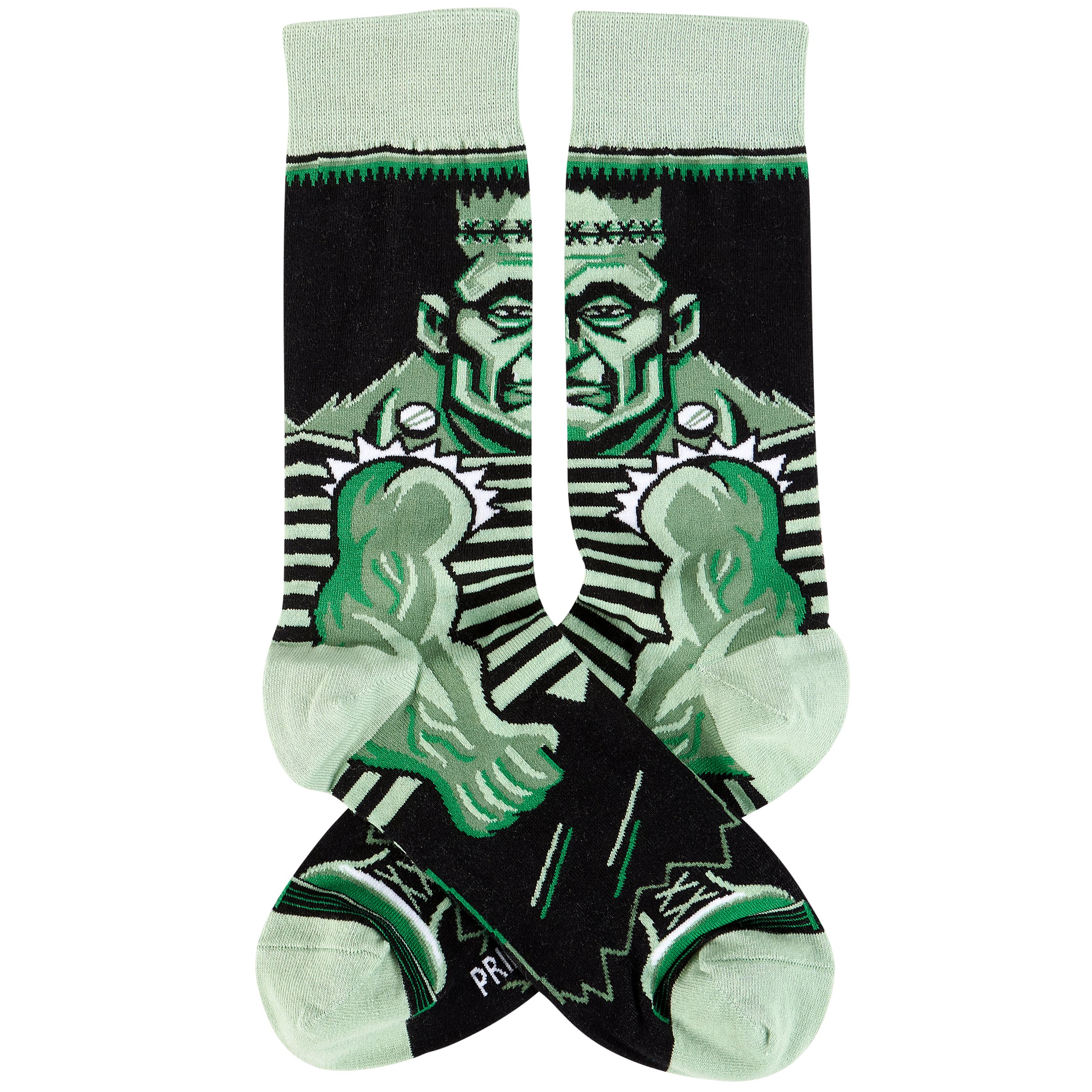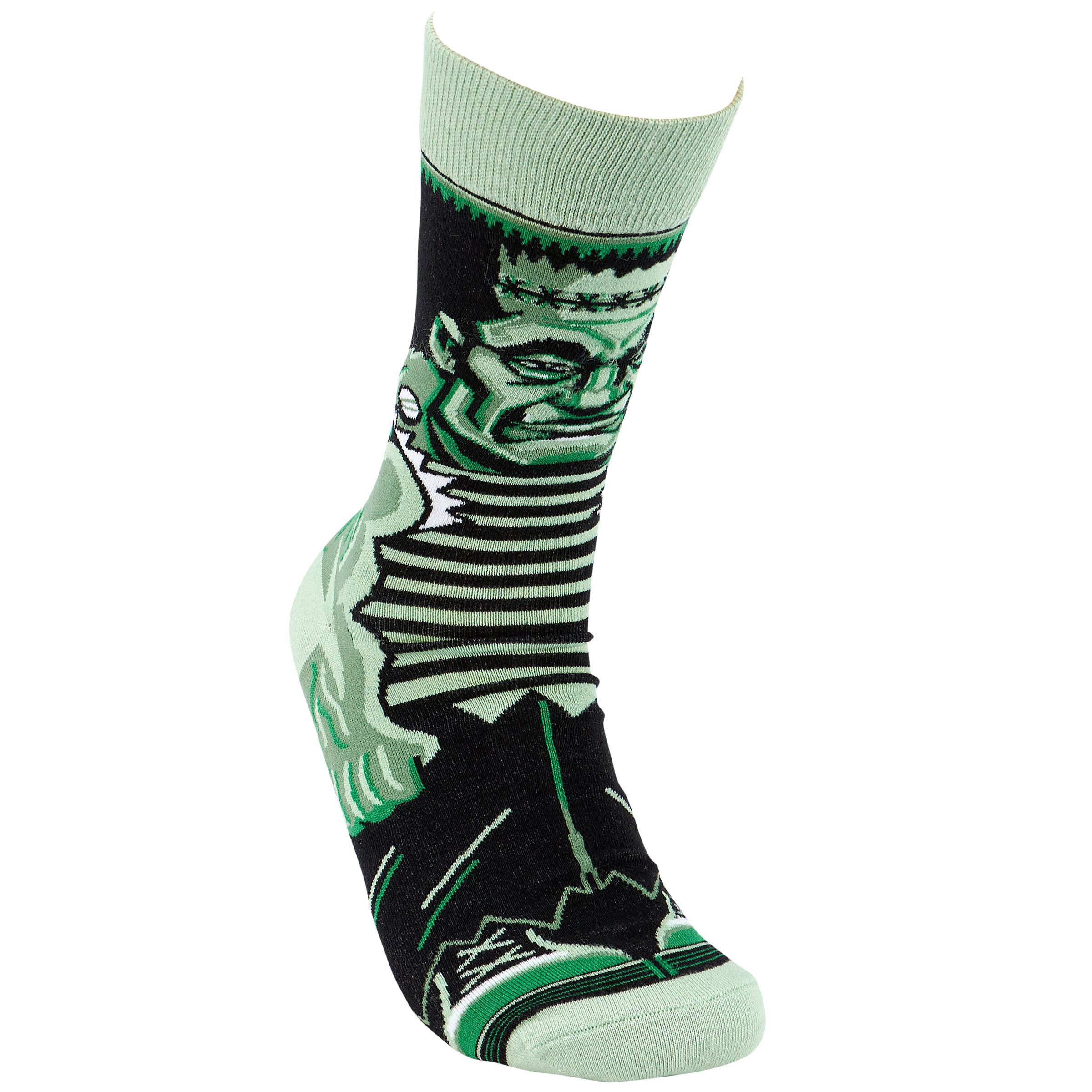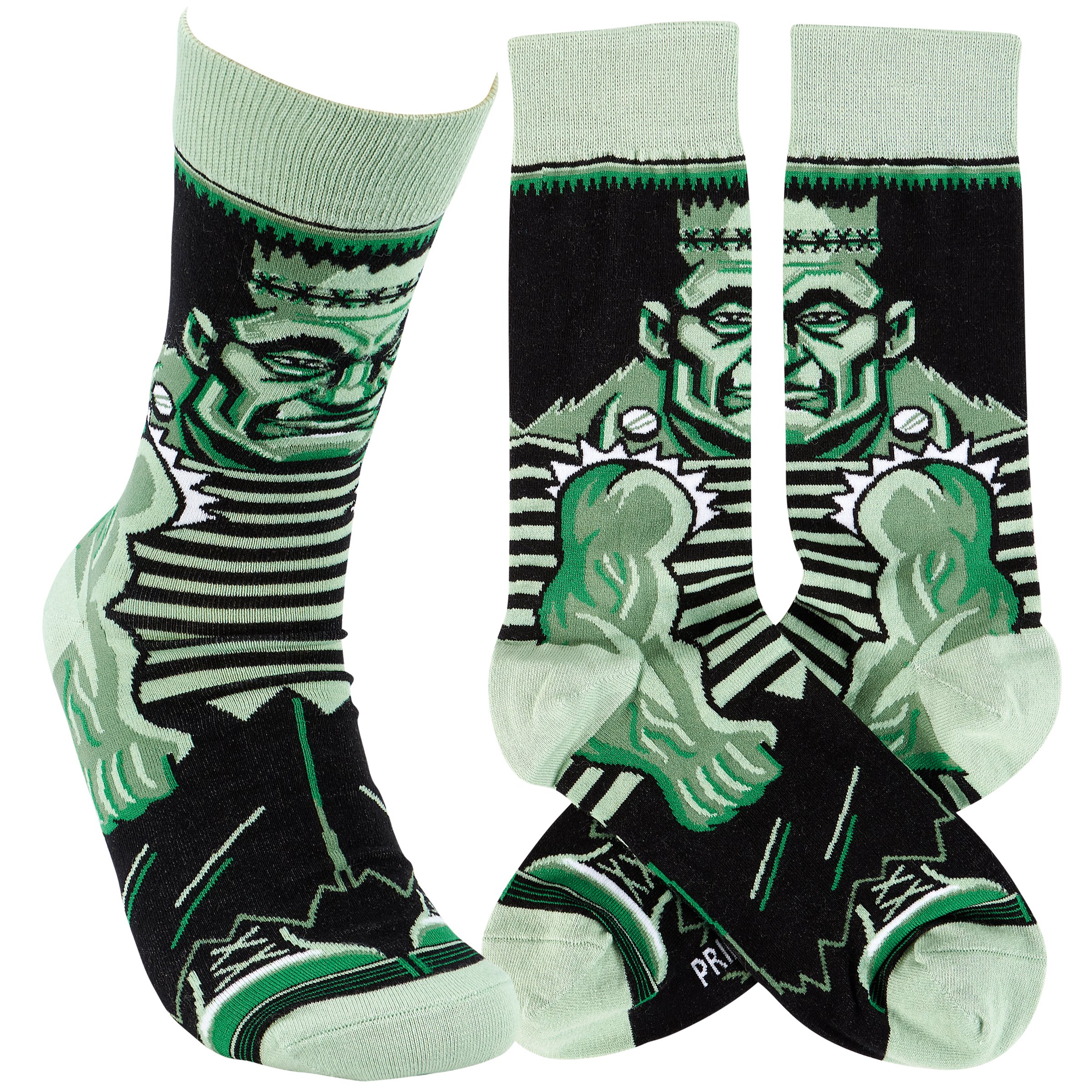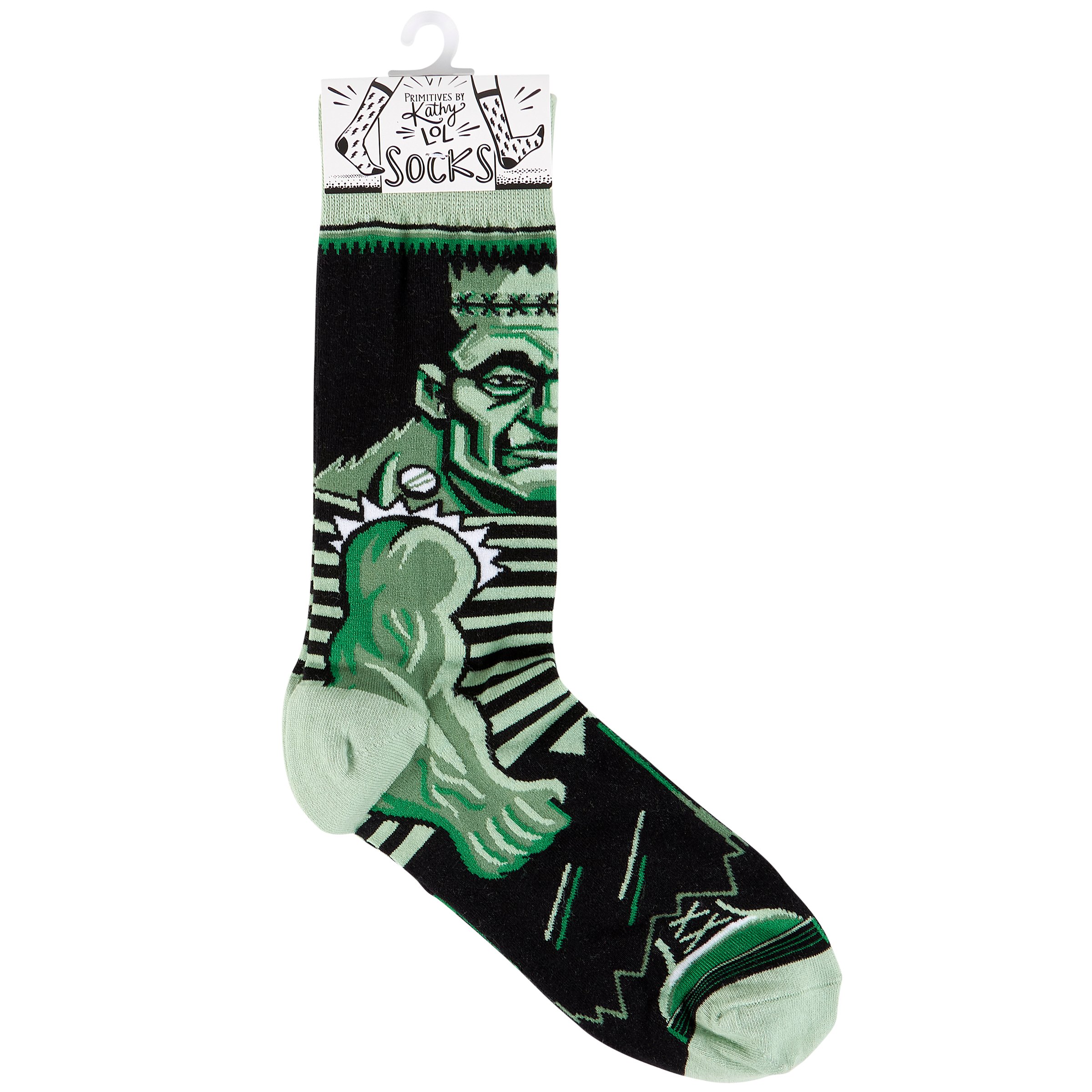 A pair of colorful socks from our Halloween Collection displaying a playful hand illustrated design of Frankenstein on each sock. These giftable socks are made with a cotton, nylon, and spandex blend for a one size fits most design. Our Frankenstein socks come with a decorative header card and a clear plastic hanger for easy rack display and gifting. A fun Halloween-themed gift perfect for seasonal self-expression.