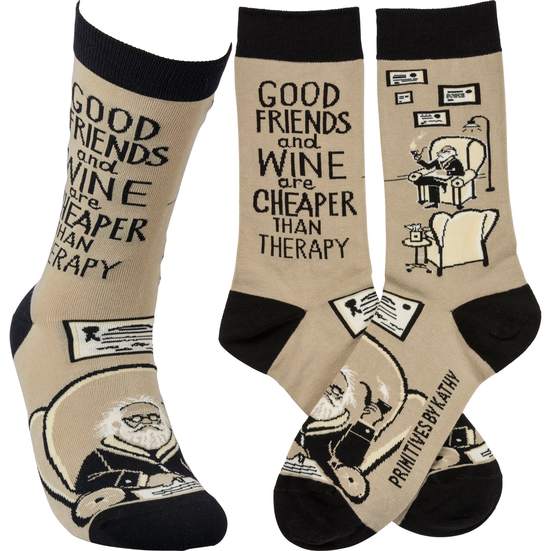 These colorful socks feature woven designs with coordinating "Good Friends And Wine Are Cheaper Than Therapy" sentiment. Cotton, nylon, spandex. One size fits most.