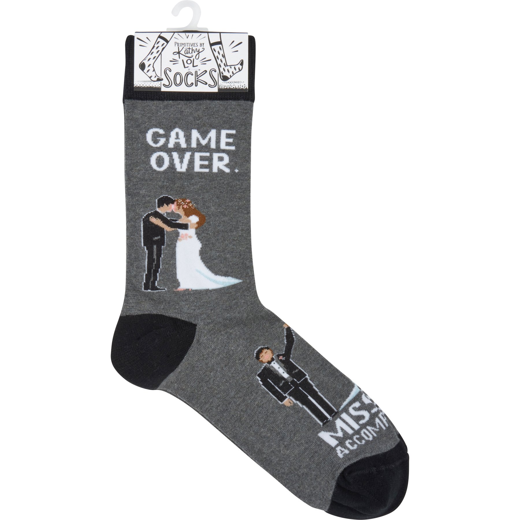 A pair of colorful woven socks from our LOL Made You Smile Collection displaying hand illustrated designs of a bride and groom with "Game Over. Mission Accomplished" sentiment. Socks feature a one size fits most design made with cotton, nylon, and spandex. Our Game Over Mission Accomplished socks come with a header card and a clear plastic hanger for display. A fun everyday accessory perfect for self-expression or gifting on any occasion.