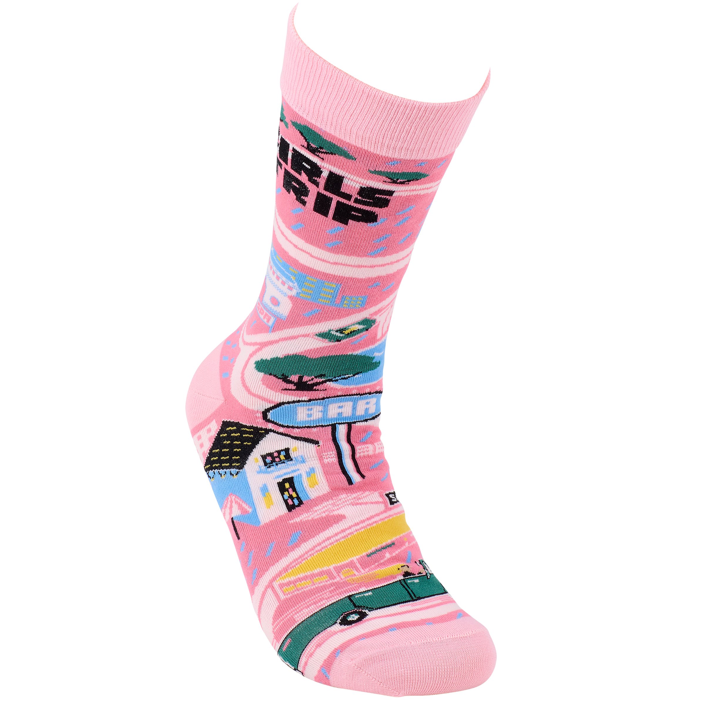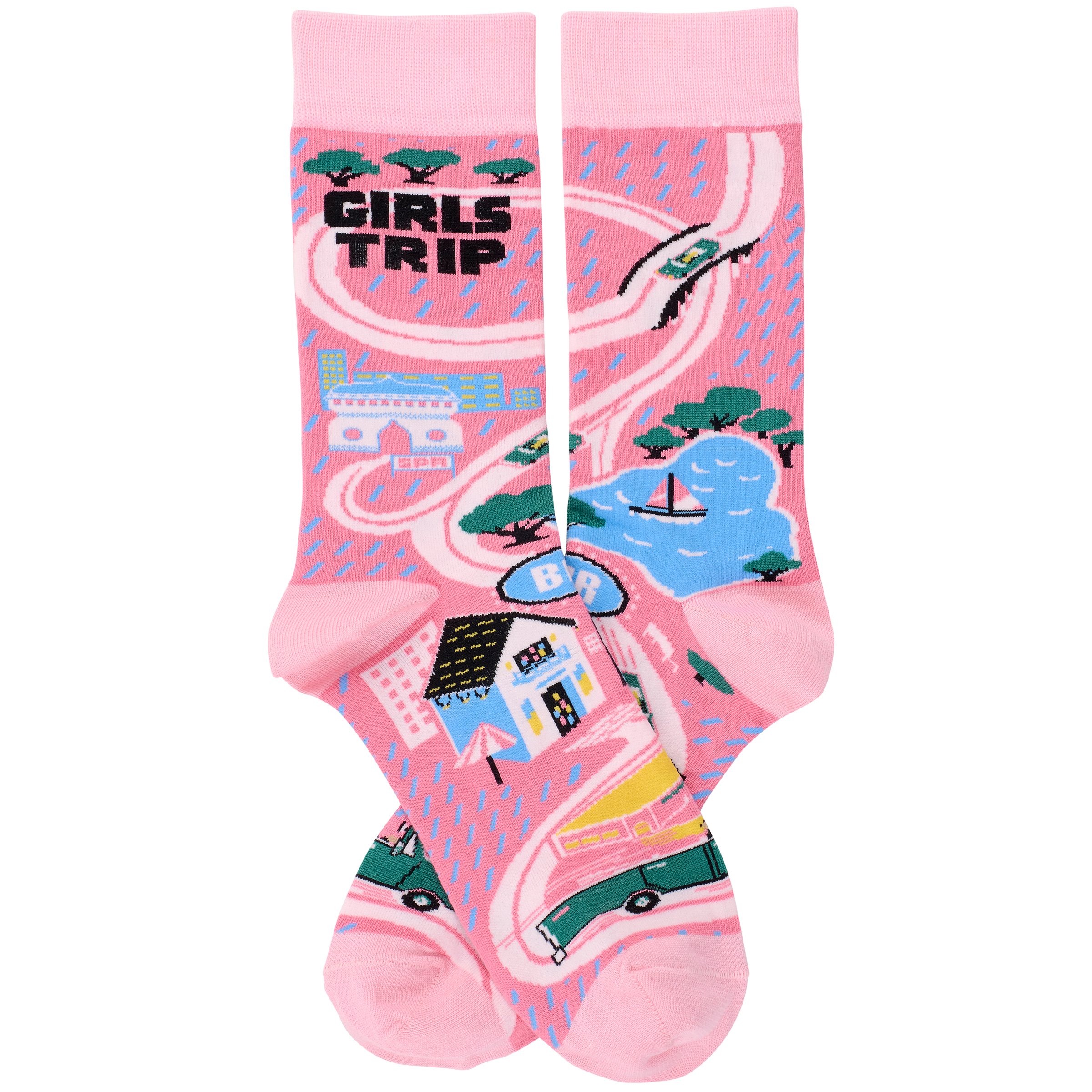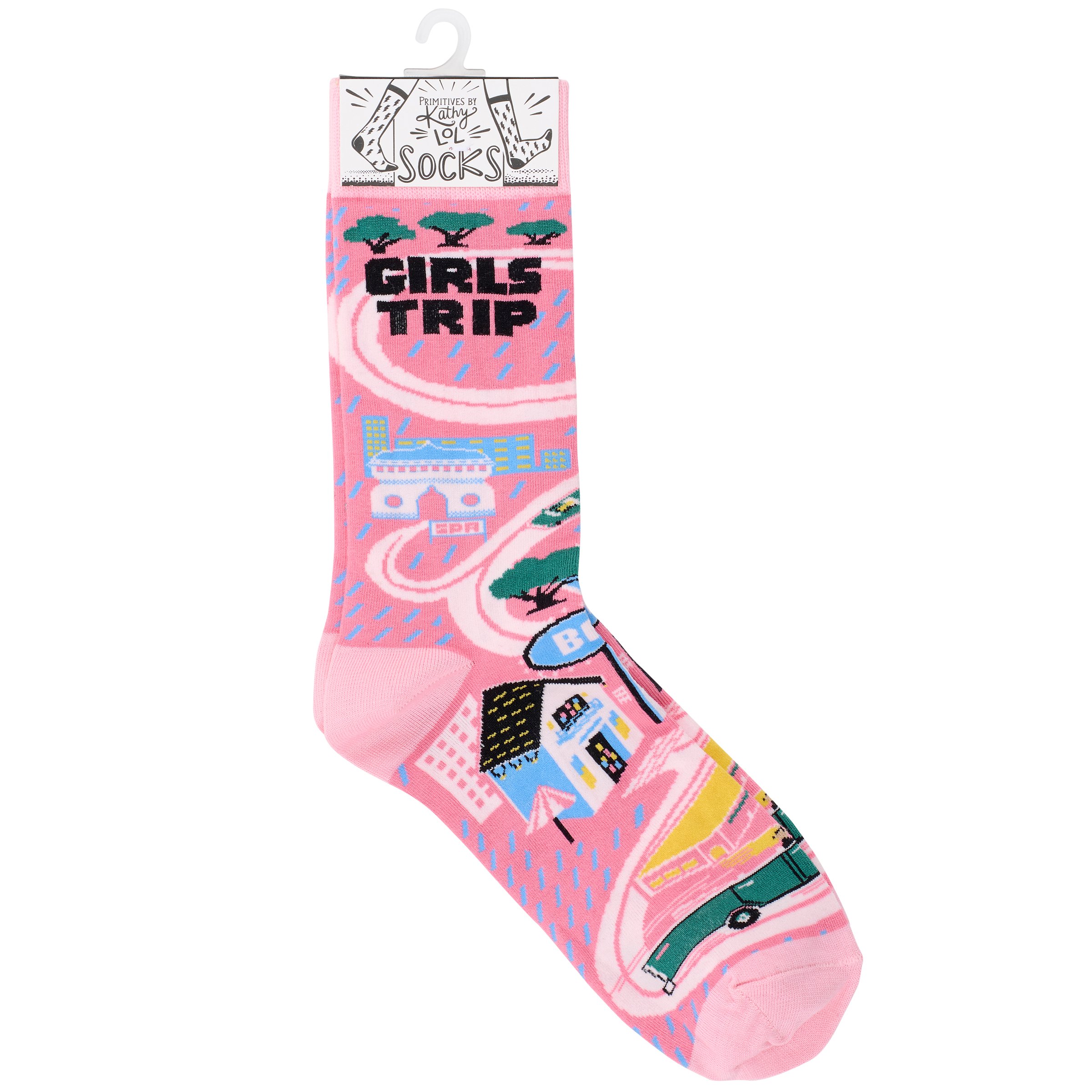 A pair of colorful socks from our LOL Made You Smile Collection displaying a playful hand illustrated design of a road trip map featuring a spa, sailboat on a lake, bar, and more with a with a fun "Girls Trip" sentiment on top. These giftable socks are made with a cotton, nylon, and spandex blend for a one size fits most design. Our Girls Trip socks come with a decorative header card and a clear plastic hanger for easy rack display and gifting. A fun travel themed gift perfect for a road trip accessory.