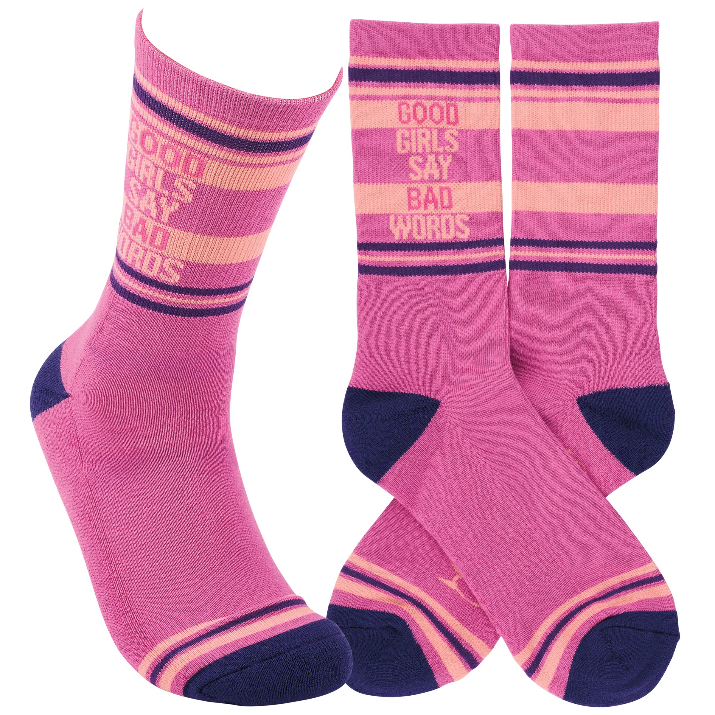 Our mid-calf varsity inspired socks are knitted with ribbed and striped designs for a comfy athleisure style and then finished with a questionable phrase. This fun pair of expressive socks displays a sassy sentiment that reads "Good Girls Say Bad Words" letting others know no matter who you are, some words are just too fun not to use. Questionables socks are made with cotton, nylon, and spandex to create a one-size-fits-most design. Each pair of socks is packaged on a clear plastic hanger with header card for graceful display in store. Our Good Girls Say Bad Words socks call back to a retro style but with modern mentality, perfect for making a statement while getting a giggle out of others. Colorful and cozy socks always make a great gift for everyday self-expression.