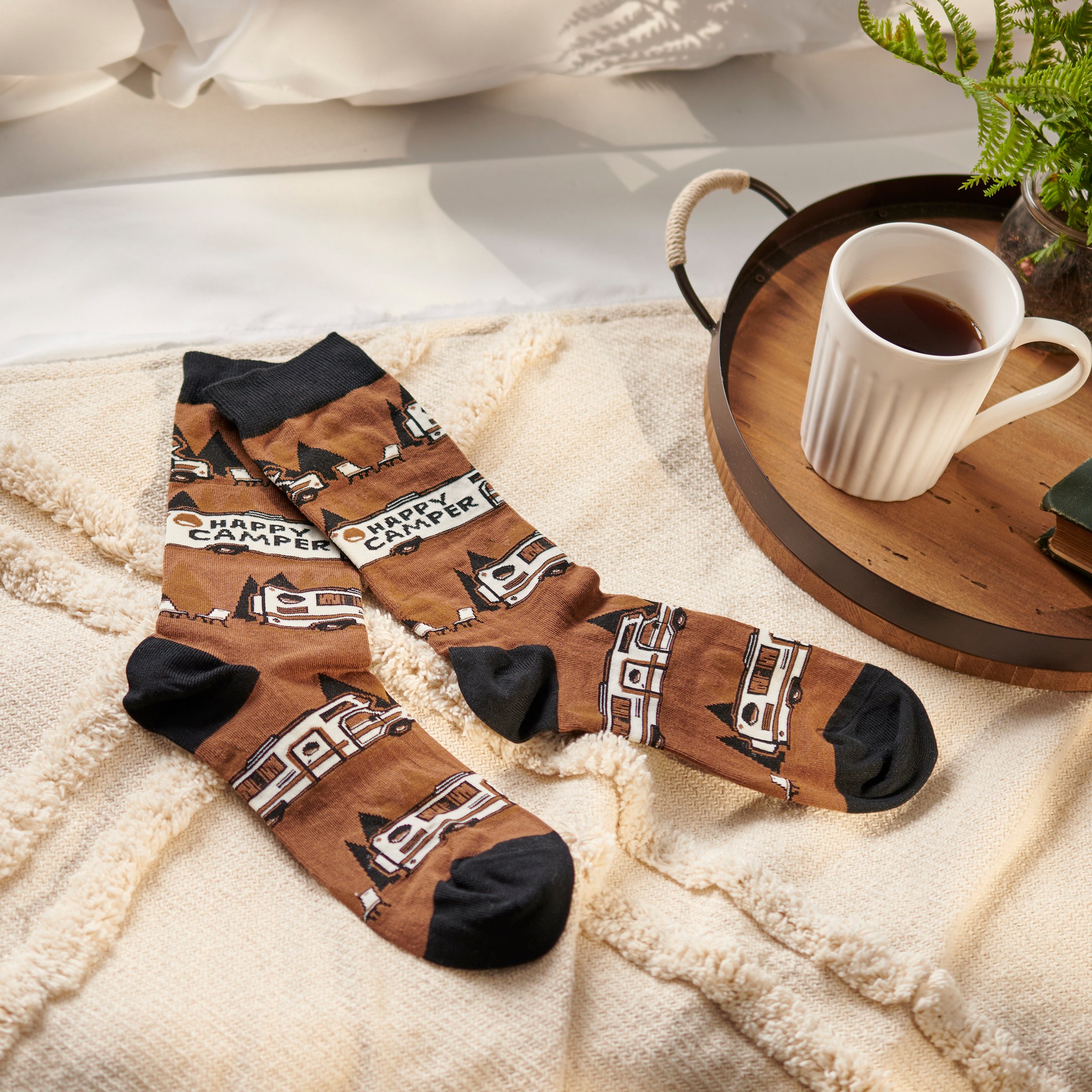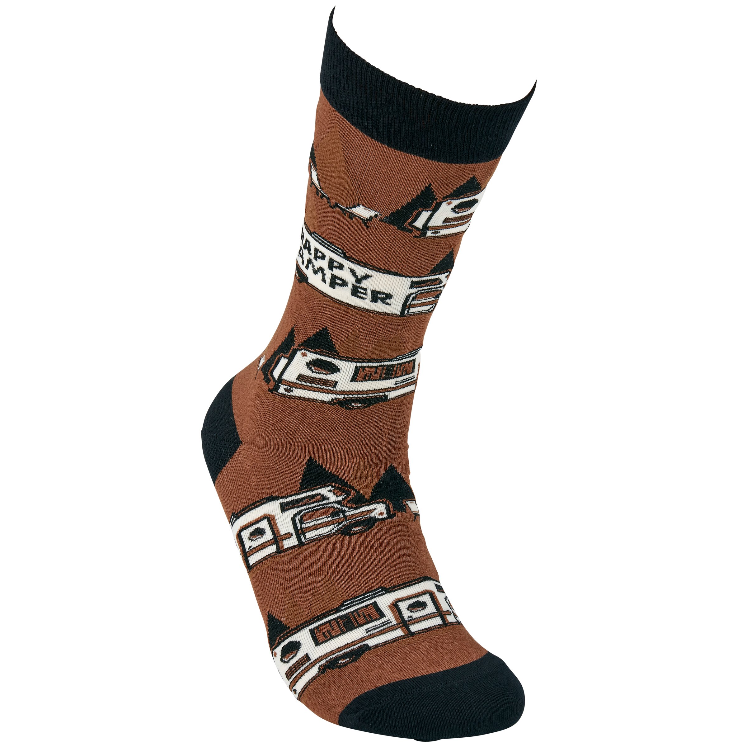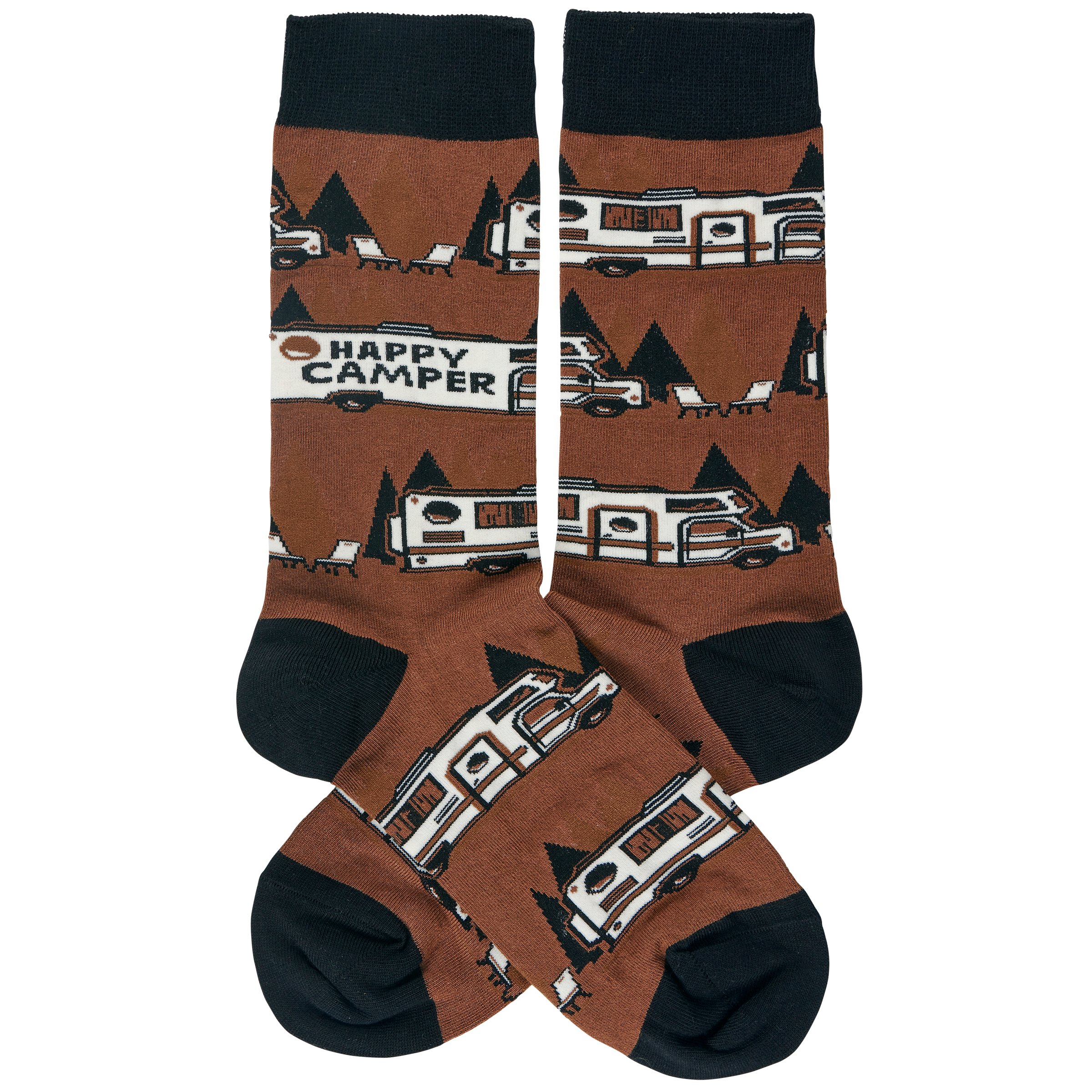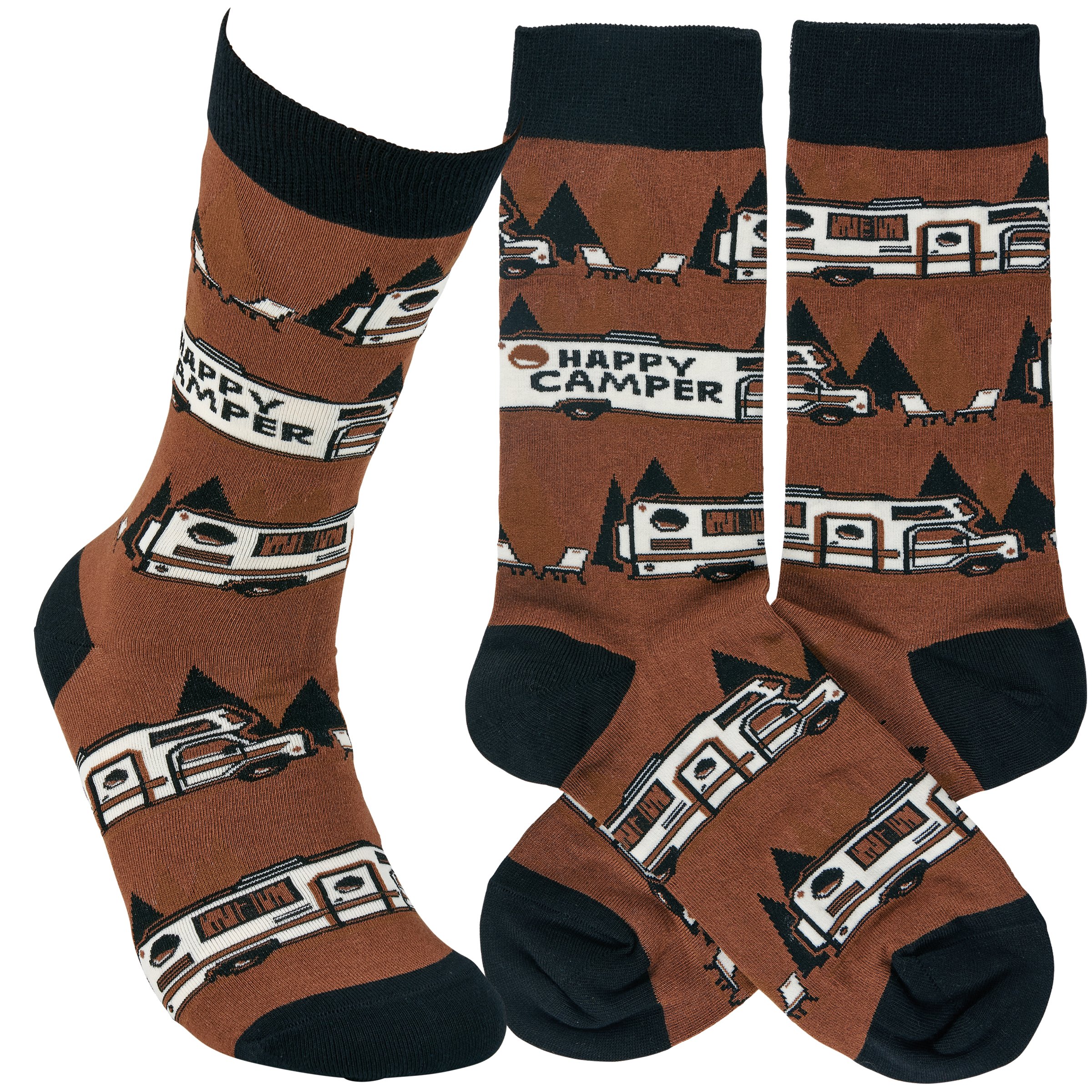 A pair of colorful socks from our Lake & Cabin Collection displaying unique hand illustrated designs of campers with a fun camping-themed sentiment that reads "Happy Camper." Socks feature a one size fits most design made with cotton, nylon, and spandex. Our Happy Camper socks come with a header card and a clear plastic hanger for display. A fun camping-themed gift perfect for everyday self-expression.