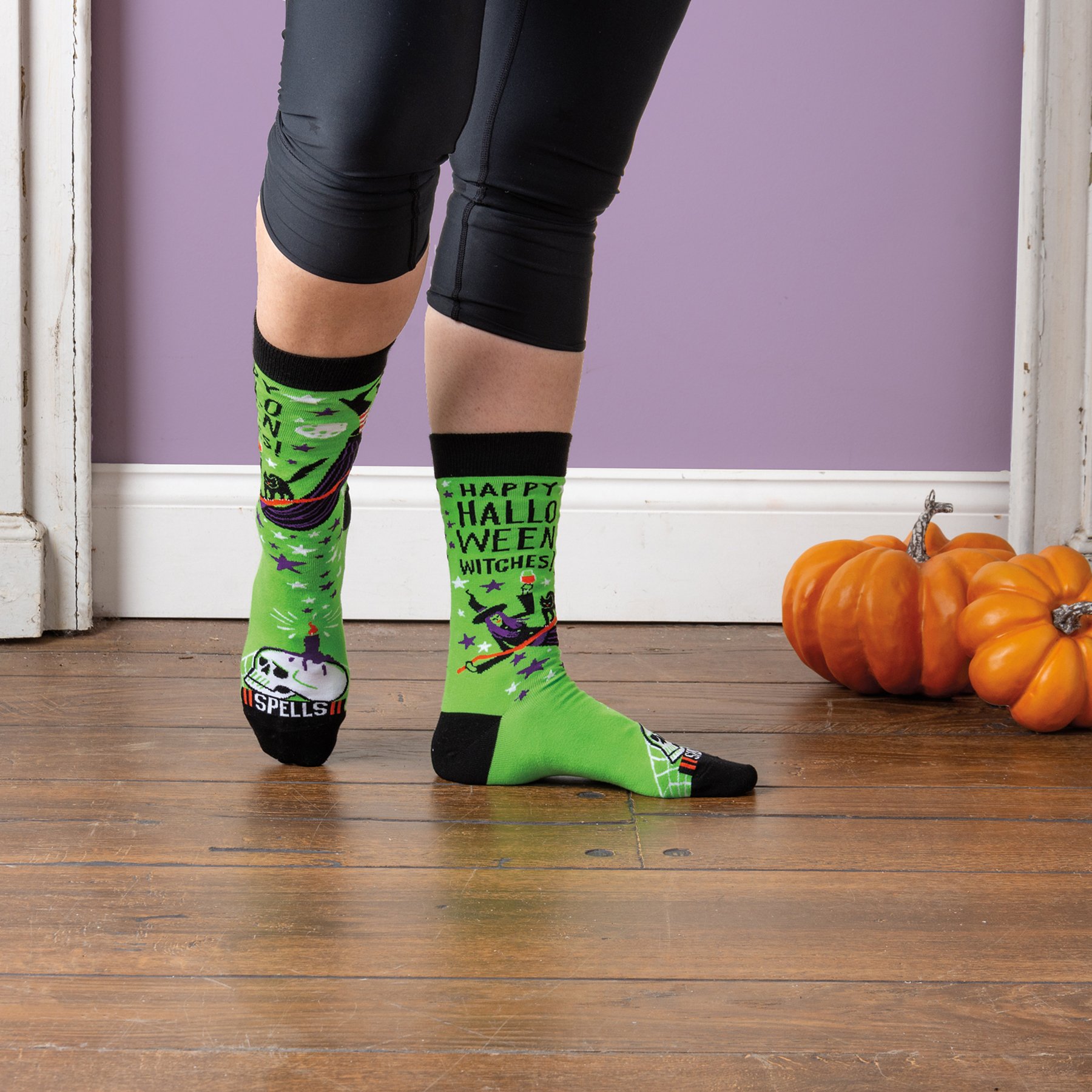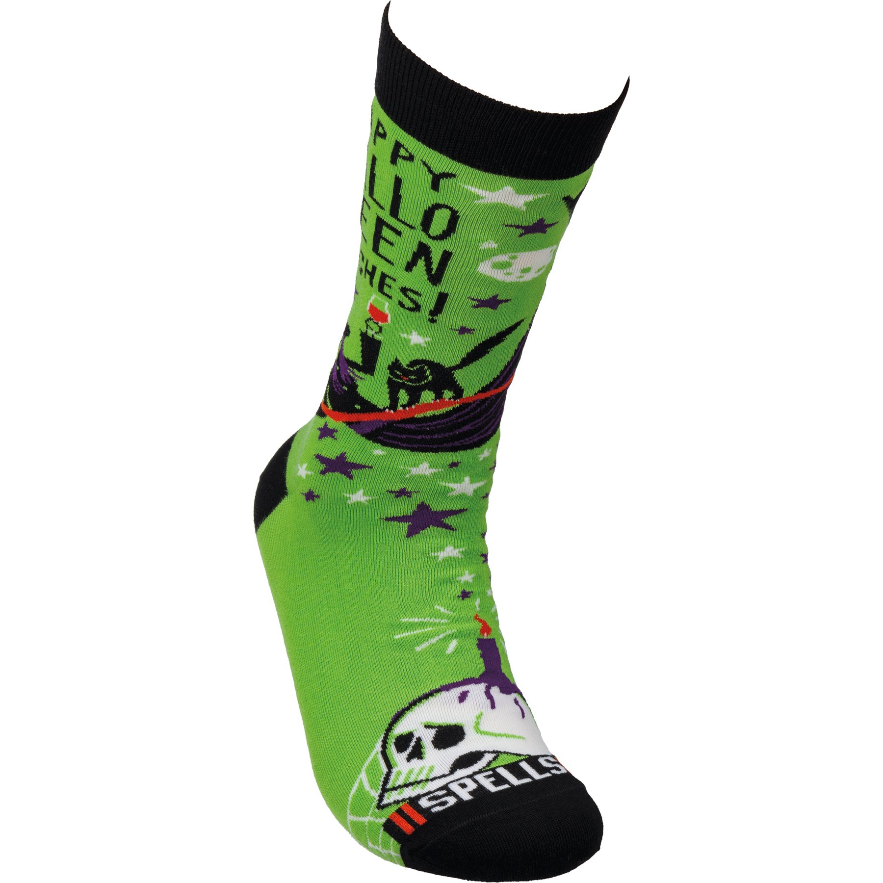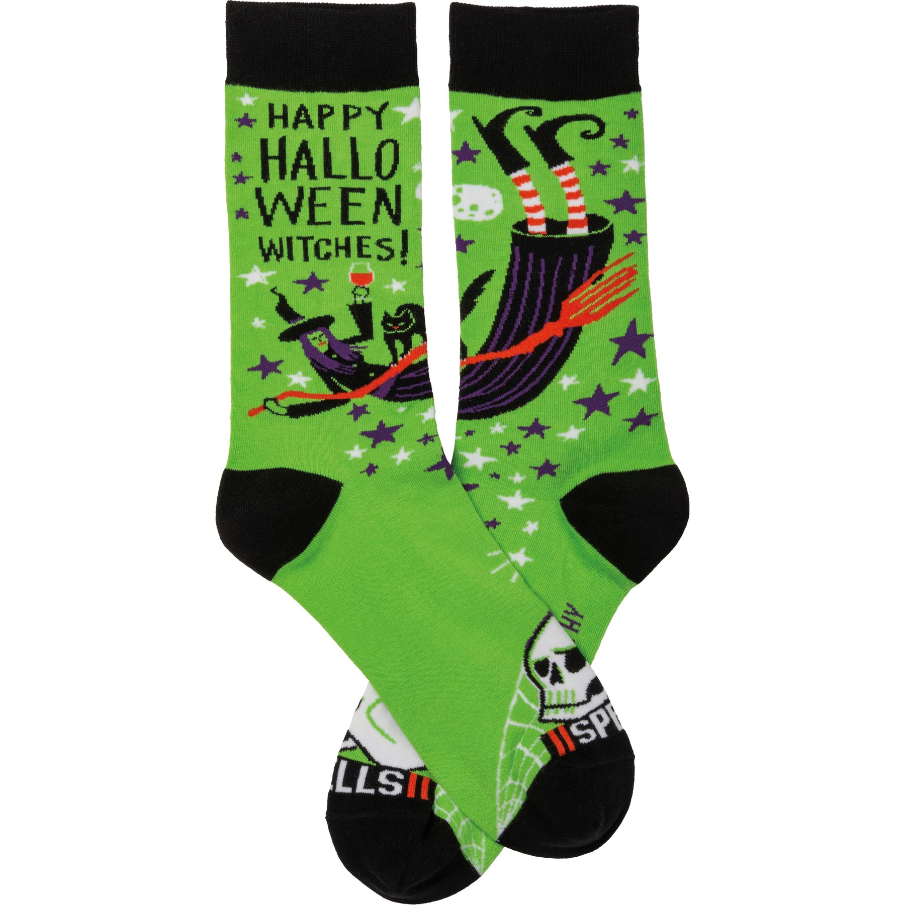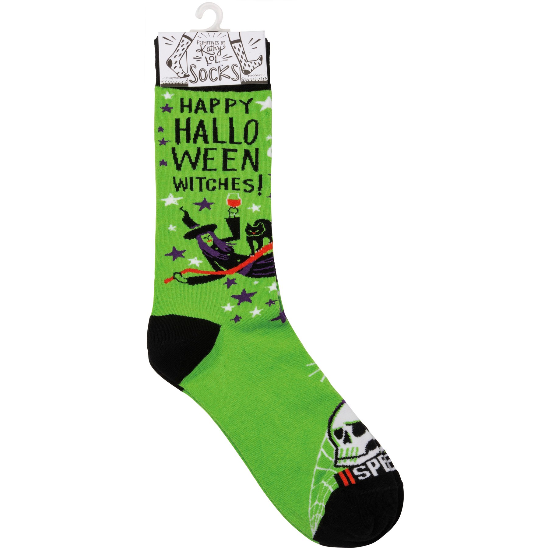 These colorful socks feature woven designs with coordinating "Happy Halloween Witches!" sentiment. Cotton, nylon, spandex. One size fits most.