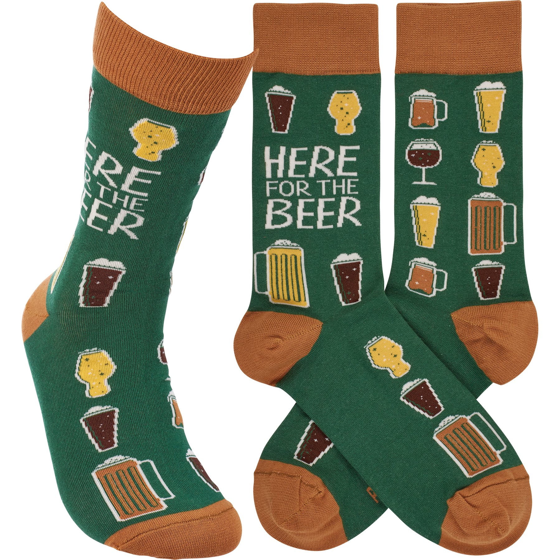 A pair of colorful woven socks from our Grilling & Chilling Collection displaying coordinating beer glass themed designs on each with humorous "Here For The Beer" sentiment. One size fits most design made with cotton, nylon, and spandex. Our Here For The Beer socks come with a header card and a clear plastic hanger for display.
