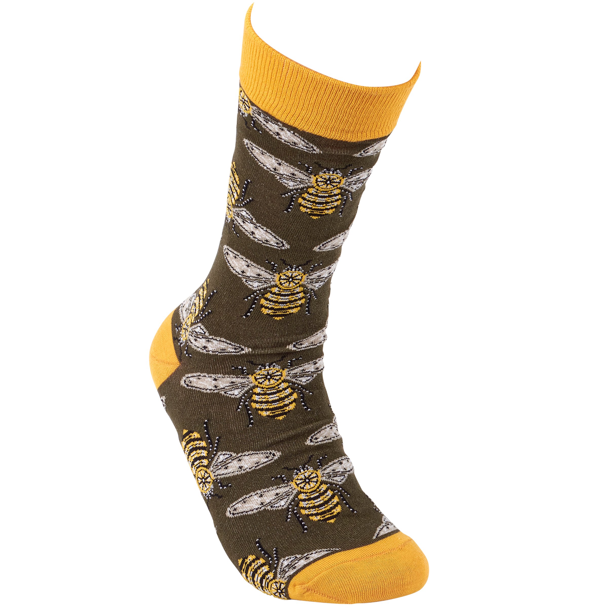 A pair of colorful socks from our Garden Collection displaying hand illustrated designs of honey bees with floral details. Socks feature a one size fits most design made with cotton, nylon, and spandex. Our Honey Bee socks come with a header card and a clear plastic hanger for display. A rustic garden-themed gift perfect for everyday self-expression.