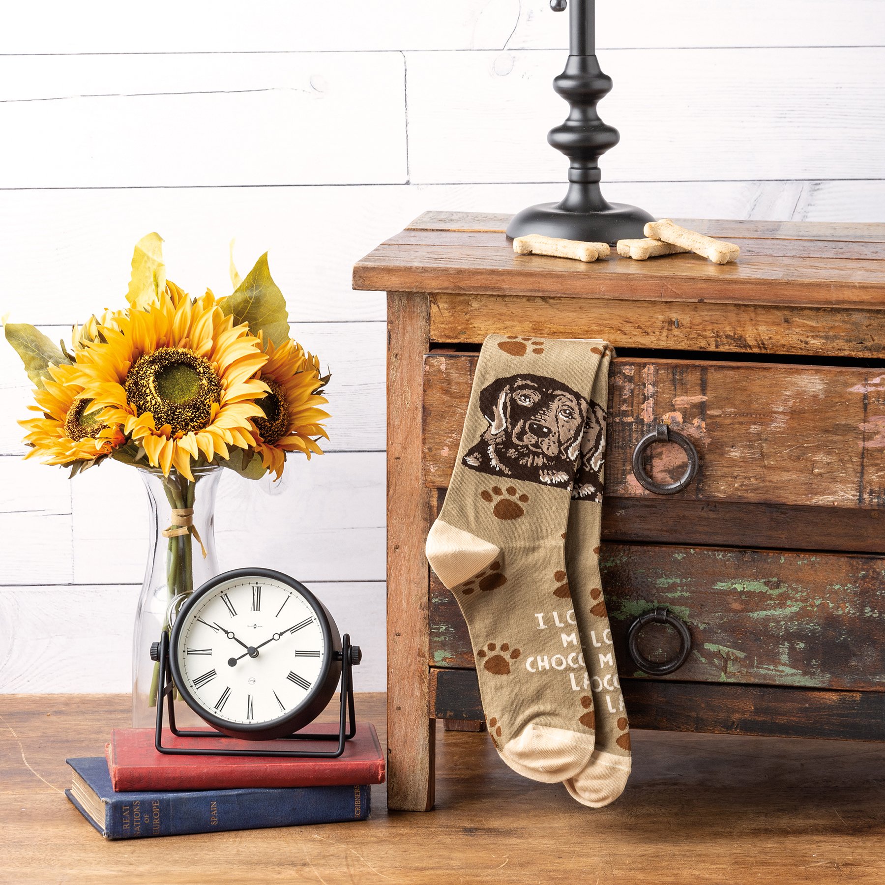 These colorful socks feature woven block print designs with coordinating "I Love My Chocolate Lab" sentiment. Cotton, nylon, spandex. One size fits most.