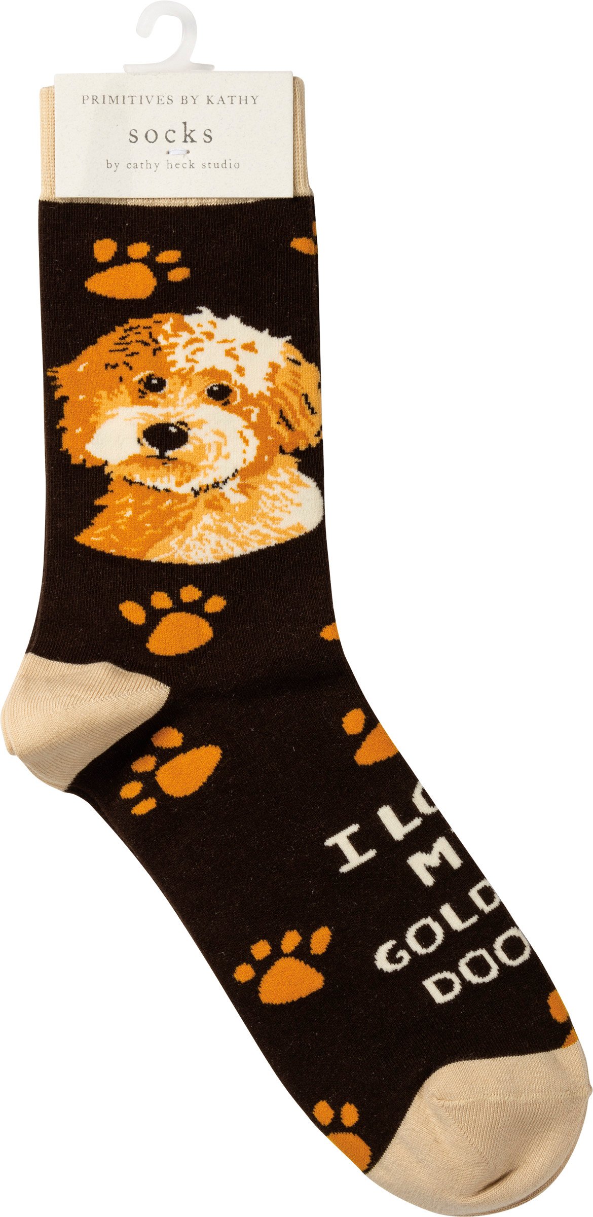 A pair of socks from our Pet Collection featuring "I Love My Goldendoodle" sentiment with block print goldendoodle portrait and all-over paw print design. Our Goldendoodle socks are one size fits most. Cotton, nylon and spandex. These Goldendoodle socks come attached to header card with plastic hanger for ease of display.