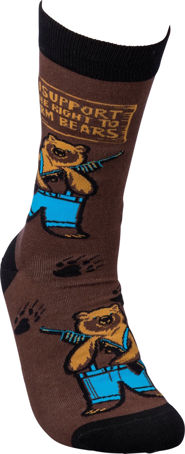 These colorful socks https://www.primitivesbykathy.com/products/collection/lol/ feature woven designs with coordinating "I Support The Right To Arm Bears" sentiment. Cotton, nylon, spandex. These Right To Bear Arms socks are one size fits most.