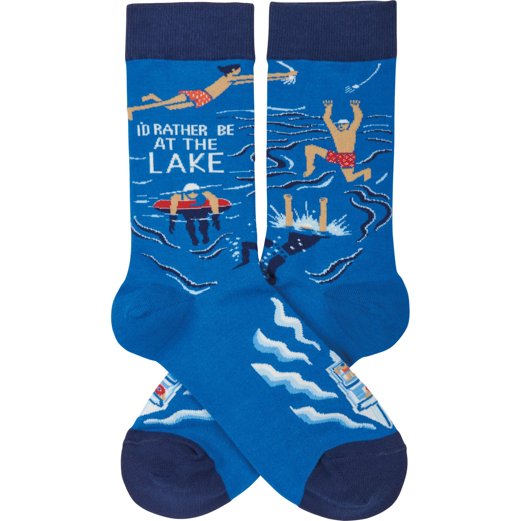 A pair of colorful woven socks from our LOL Made You Smile Collection displaying hand illustrated designs of people having fun in water with "I'd Rather Be At The Lake" sentiment. Socks feature a one size fits most design made with cotton, nylon, and spandex. Our I'd Rather Be At The Lake socks come with a header card and a clear plastic hanger for display. A fun everyday accessory perfect for self-expression or gifting on any occasion.