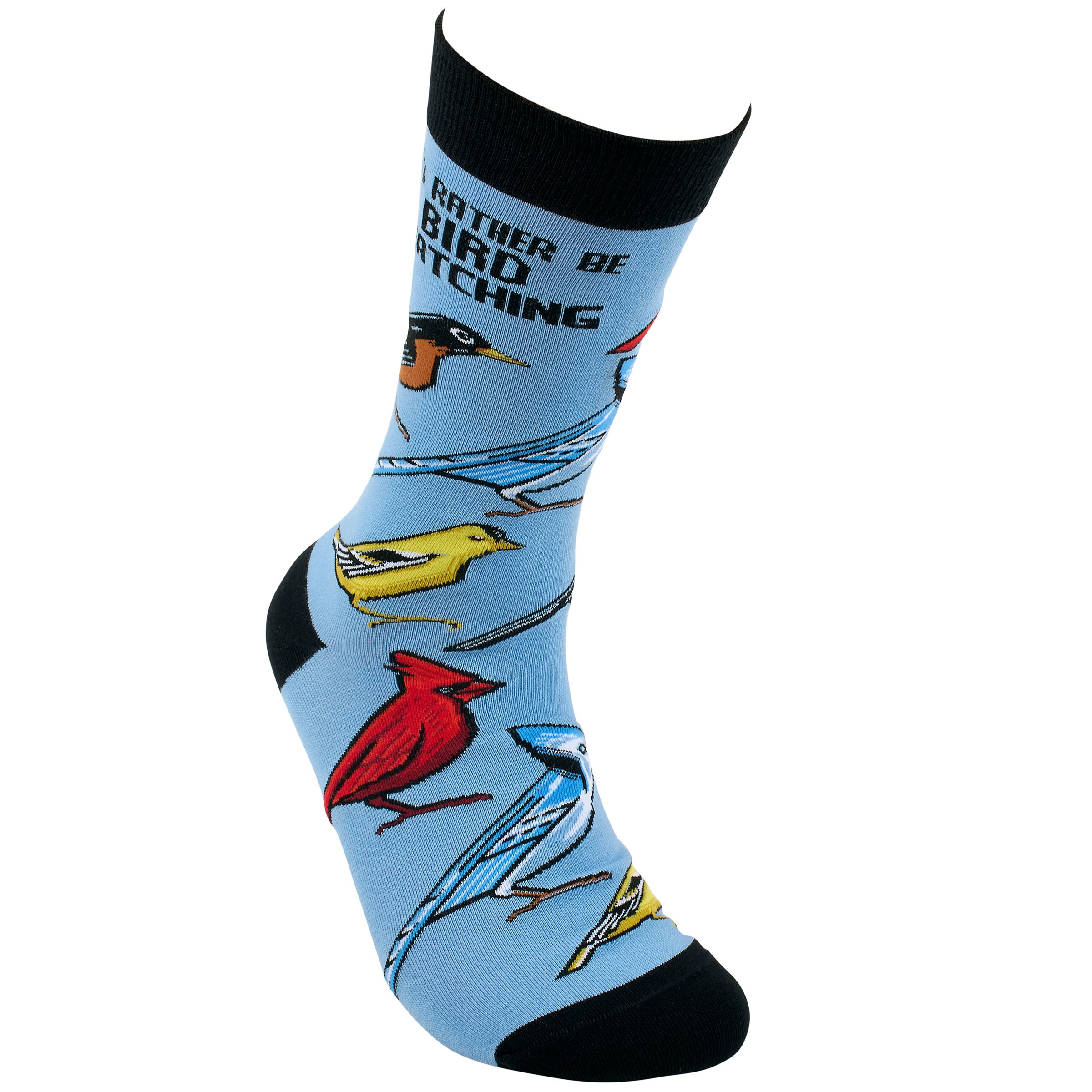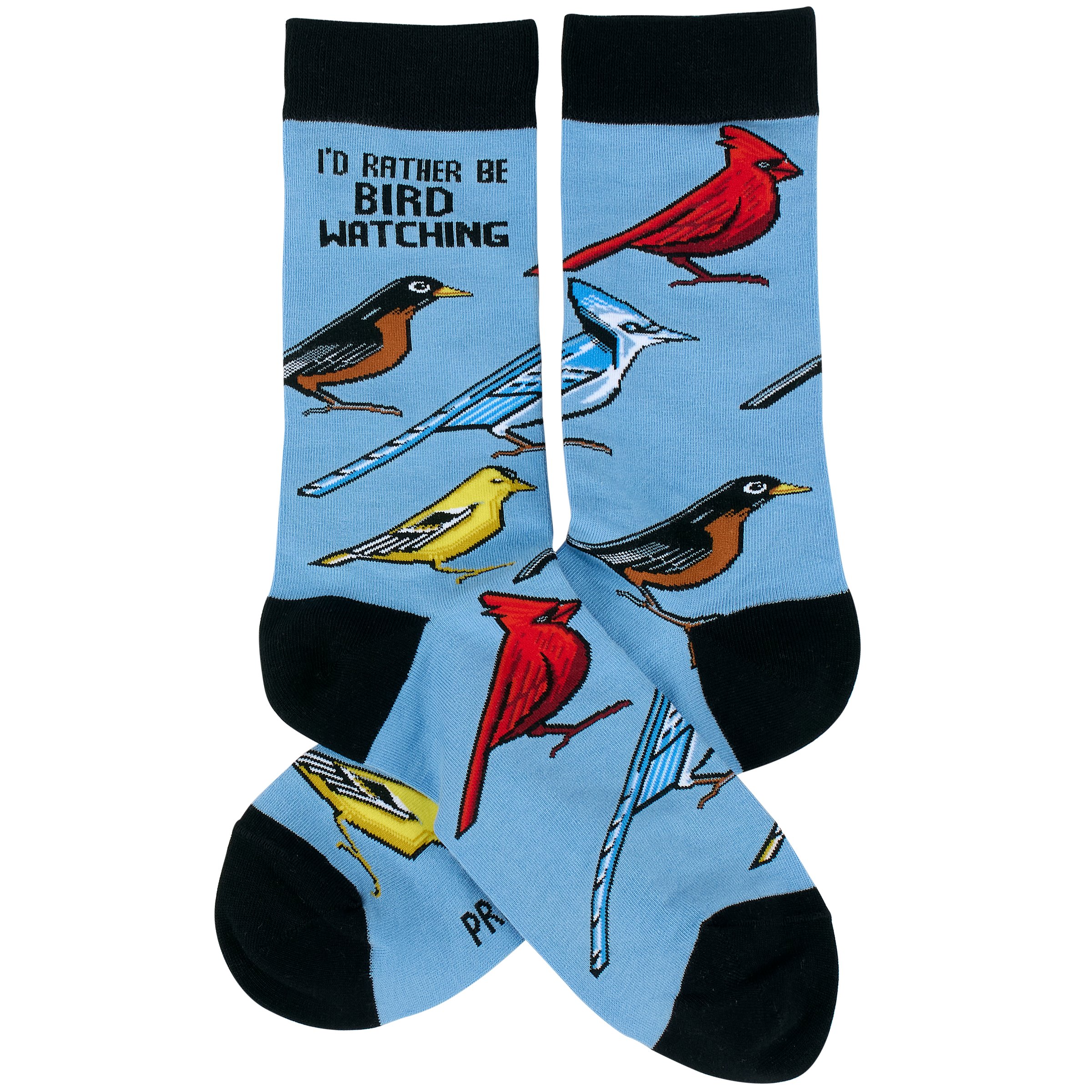 A pair of colorful socks from our LOL-Made You Smile Collection displaying playful hand illustrated designs of various birds with a fun bird inspired sentiment that reads "I'd Rather Be Bird Watching." These giftable socks are made with a cotton, nylon, and spandex blend for a one size fits most design. Our I'd Rather Be Bird Watching socks come with a decorative header card and a clear plastic hanger for easy rack display and gifting. A fun gift for bird watchers perfect for everyday self-expression.