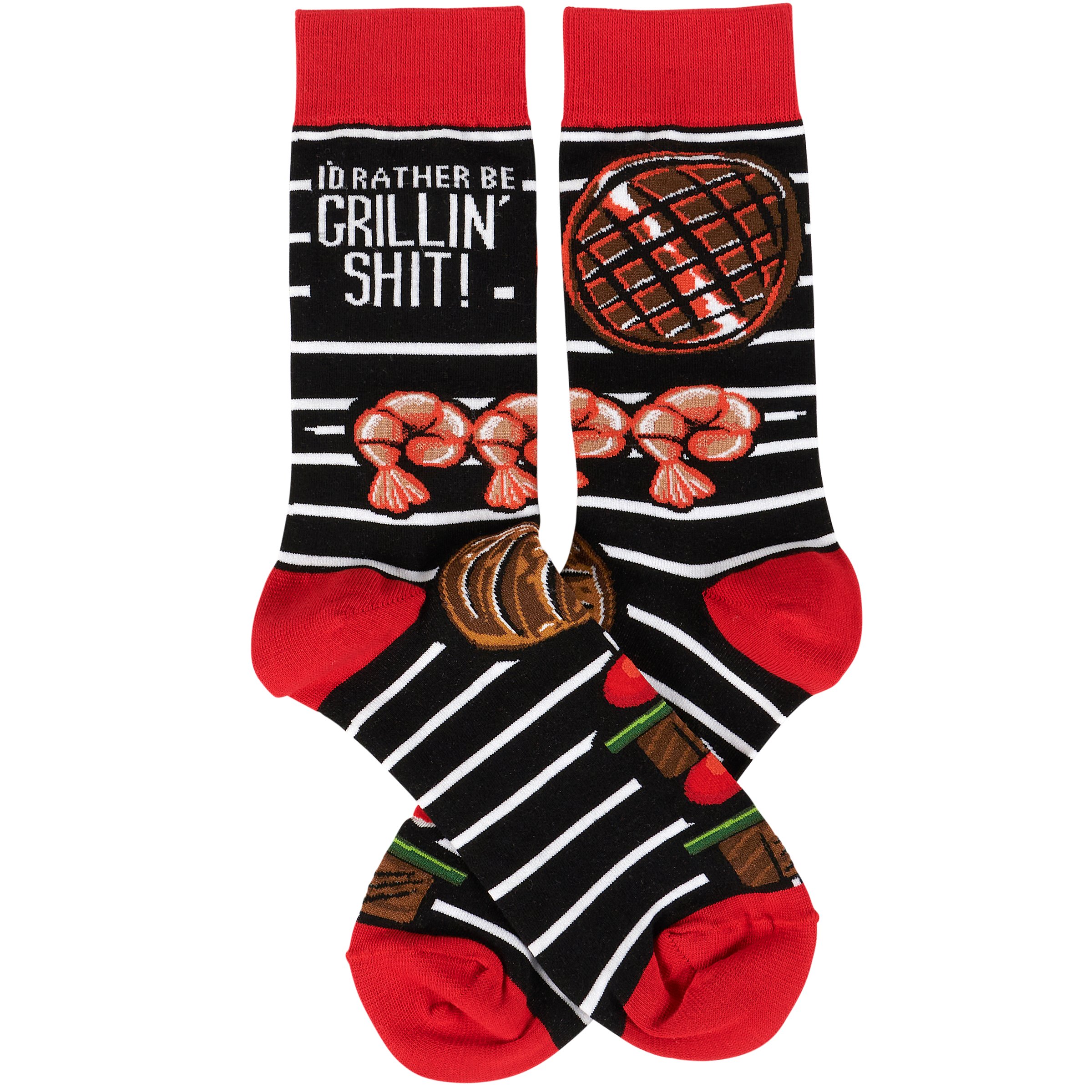 A pair of colorful socks from our LOL-Made You Smile Collection displaying playful hand illustrated designs of various food on a grill with a fun grilling inspired sentiment that reads "I'd Rather Be Grillin'." These giftable socks are made with a cotton, nylon, and spandex blend for a one size fits most design. Our I'd Rather Be Grillin' socks come with a decorative header card and a clear plastic hanger for easy rack display and gifting. A fun grilling-themed gift perfect for everyday self-expression.