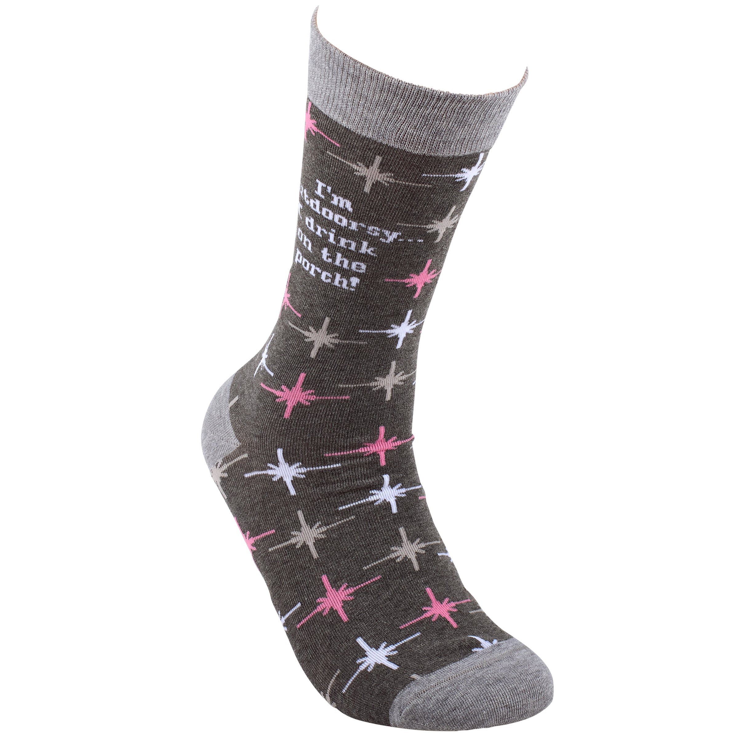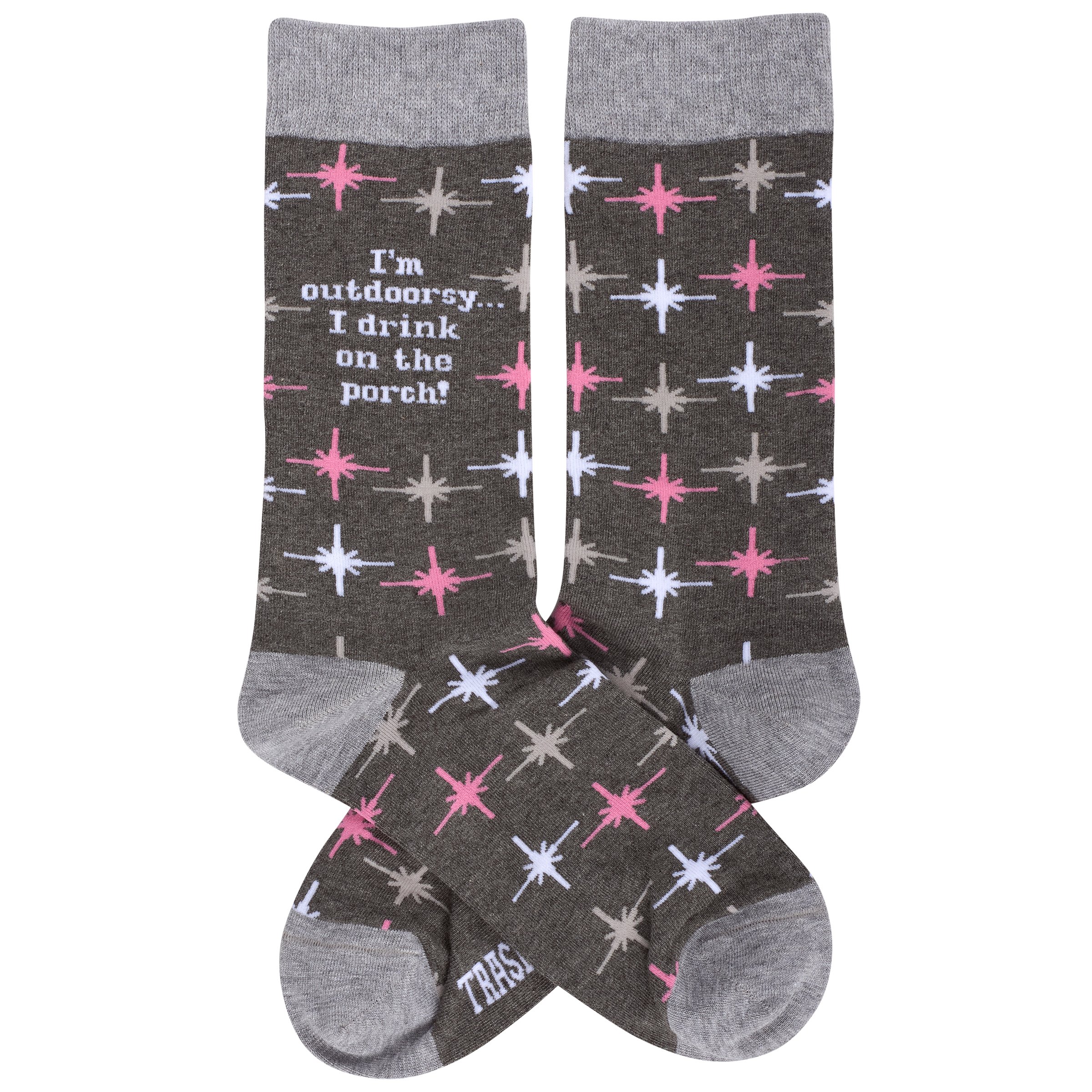 A pair of retro socks from our Trash Talk By Annie Collection flaunting a classy pink and gray pattern with a sassy sentiment that reads "I'm Outdoorsy... I Drink On The Porch!" These cozy socks are made with cotton, nylon, and spandex to create a one-size-fits-most design. Each pair of socks is packaged on a clear plastic hanger with header card for graceful display in store. Our I'm Outdoorsy socks call back to a vintage style with modern sassy sentiments, perfect for making a statement while getting a giggle out of others. Colorful and cozy socks always make a great gift for everyday self-expression.