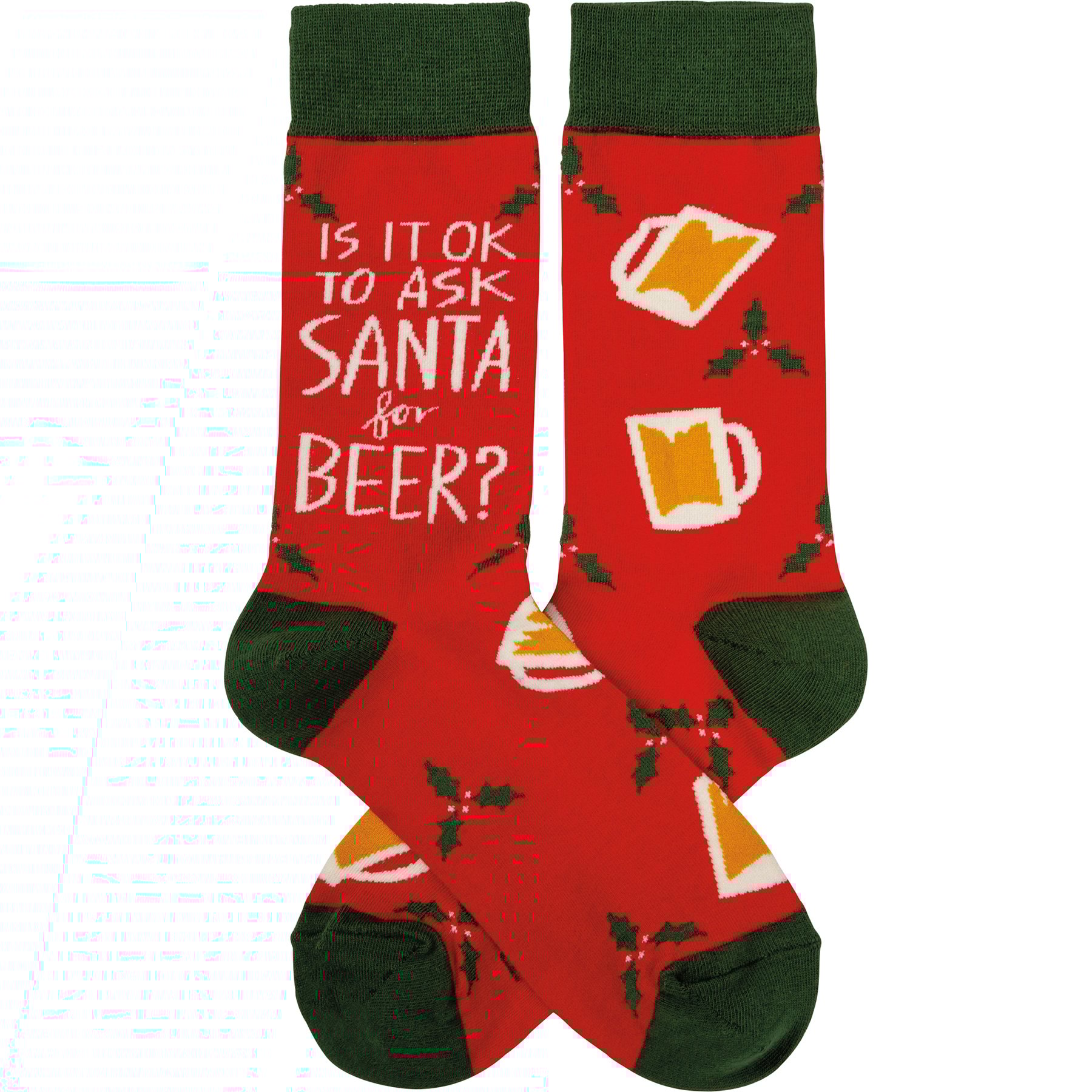 These colorful socks feature woven designs with coordinating "Is It Ok To Ask Santa For Beer?" sentiment. Cotton, nylon, spandex. One size fits most.