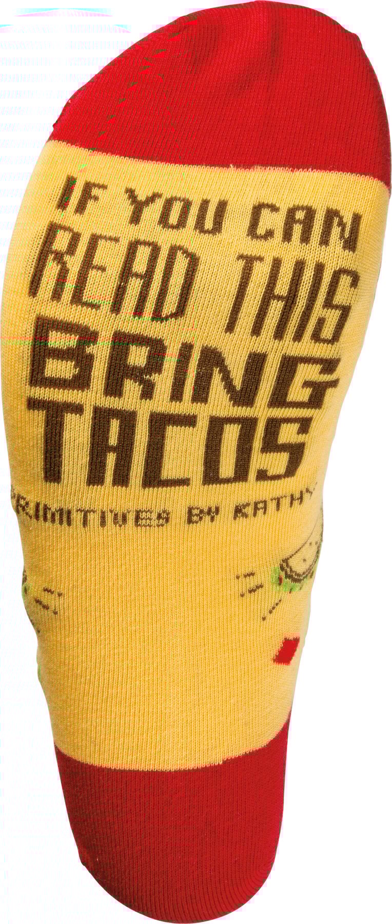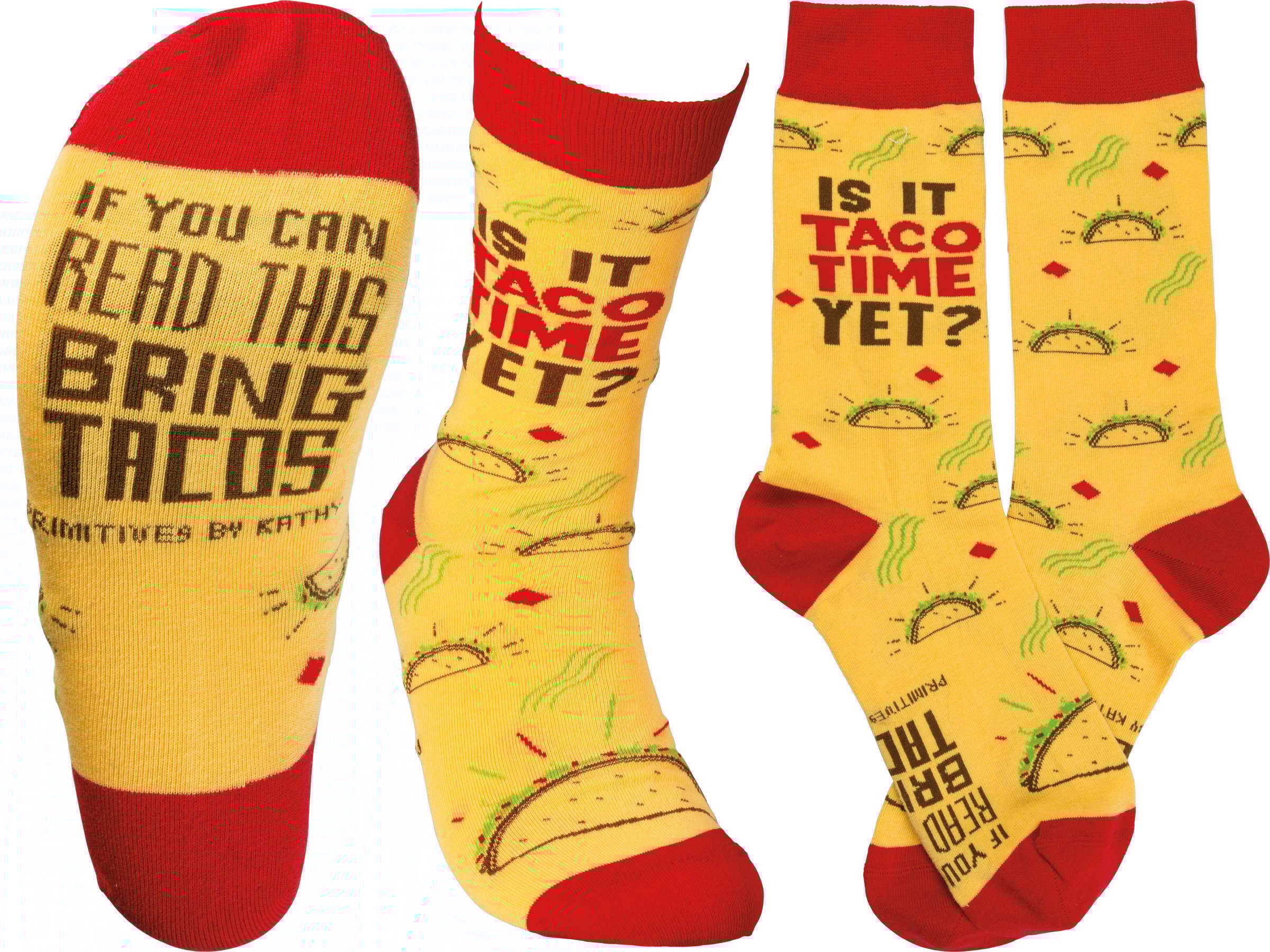 These colorful socks from our LOL Made You Smile Collection feature woven designs with coordinating "Is It Taco Time Yet?" sentiment on top and "If You Can Read This Bring Tacos" sentiment on bottom of foot. Cotton, nylon, spandex. These funny taco socks are one size fits most.