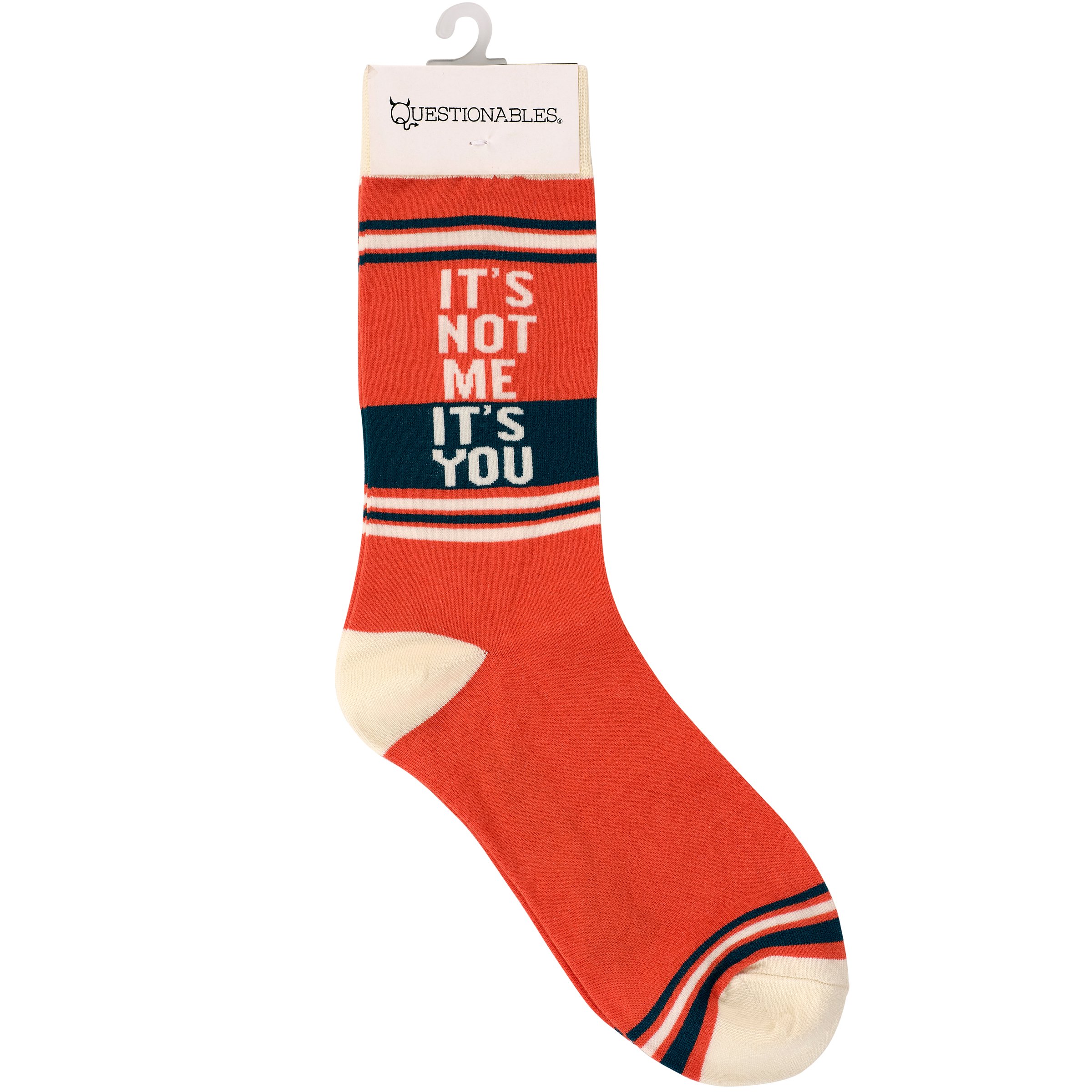 Before they attempt to throw shade your way, they'll have to read this pair of colorful socks flaunting a stylish pattern with a sassy sentiment that reads "It's Not Me - It's You." Questionables socks are made with a cotton, nylon, and spandex blend for a one size fits most design and packaged on a clear plastic hanger with header card for graceful display in store. Our It's Not Me It's You socks are perfect for standing out and making a statement while getting a giggle out of others. Colorful and cozy socks always make a great gift that offer new ways to express themselves every day.