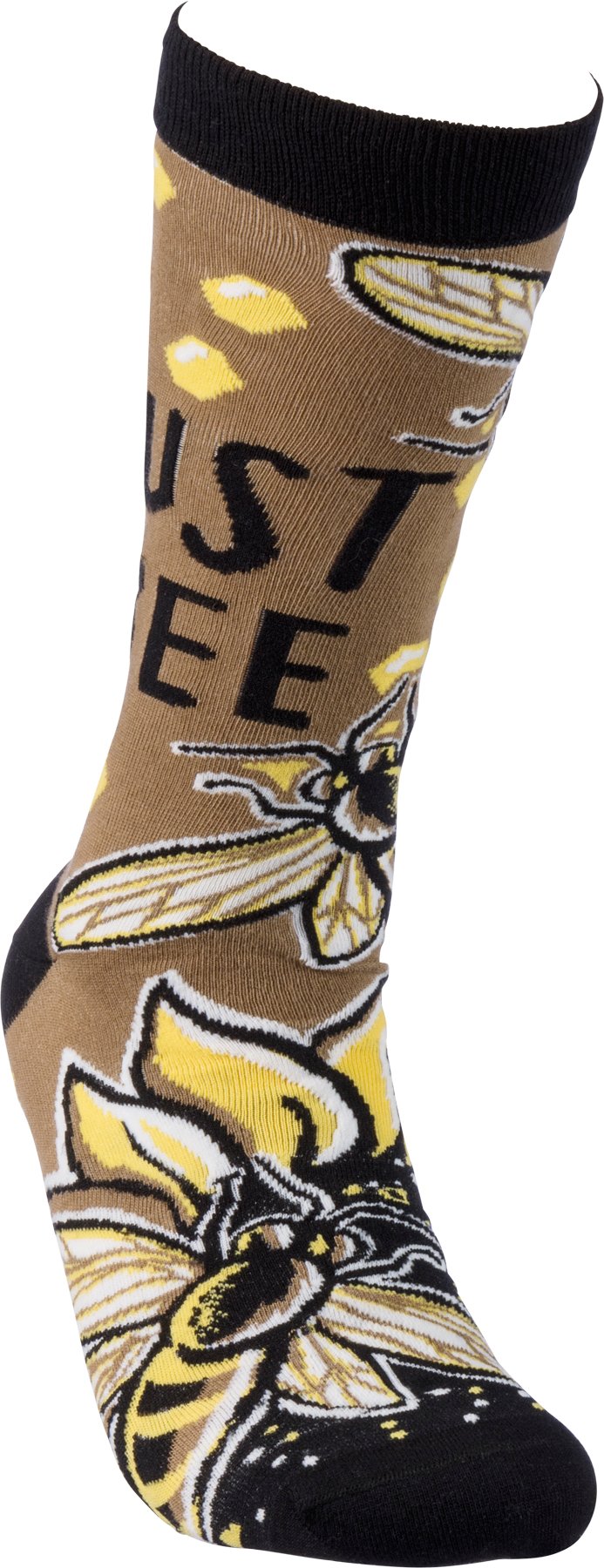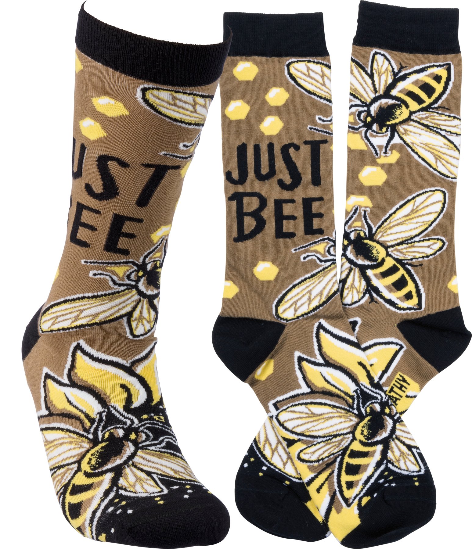 These colorful socks feature woven designs with coordinating "Just Bee" sentiment. Cotton, nylon, spandex. One size fits most.