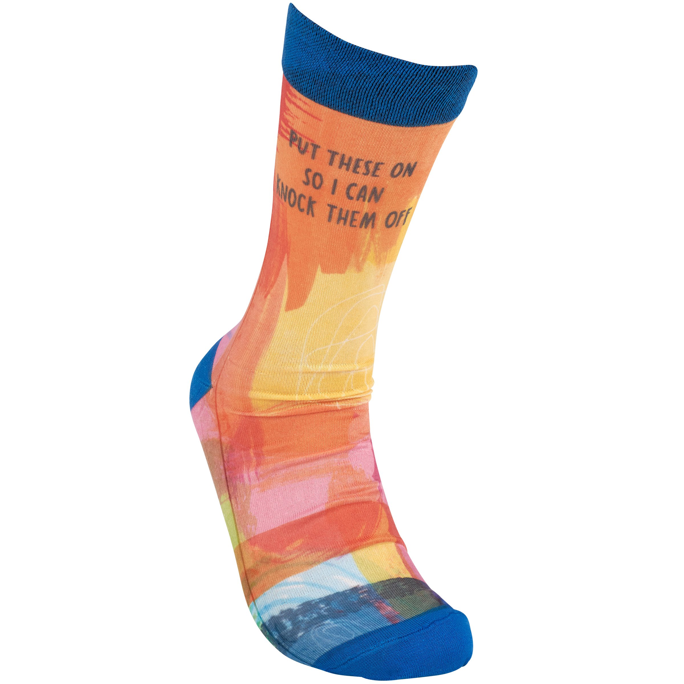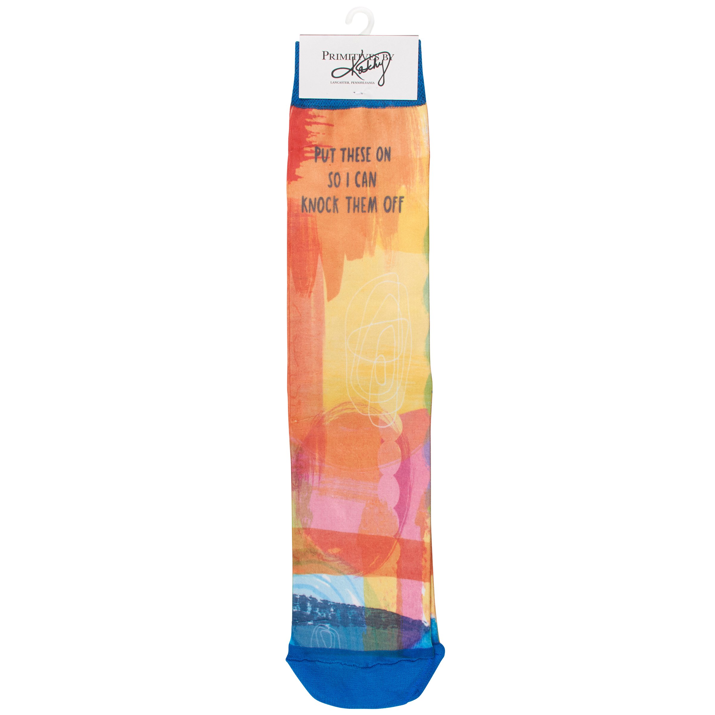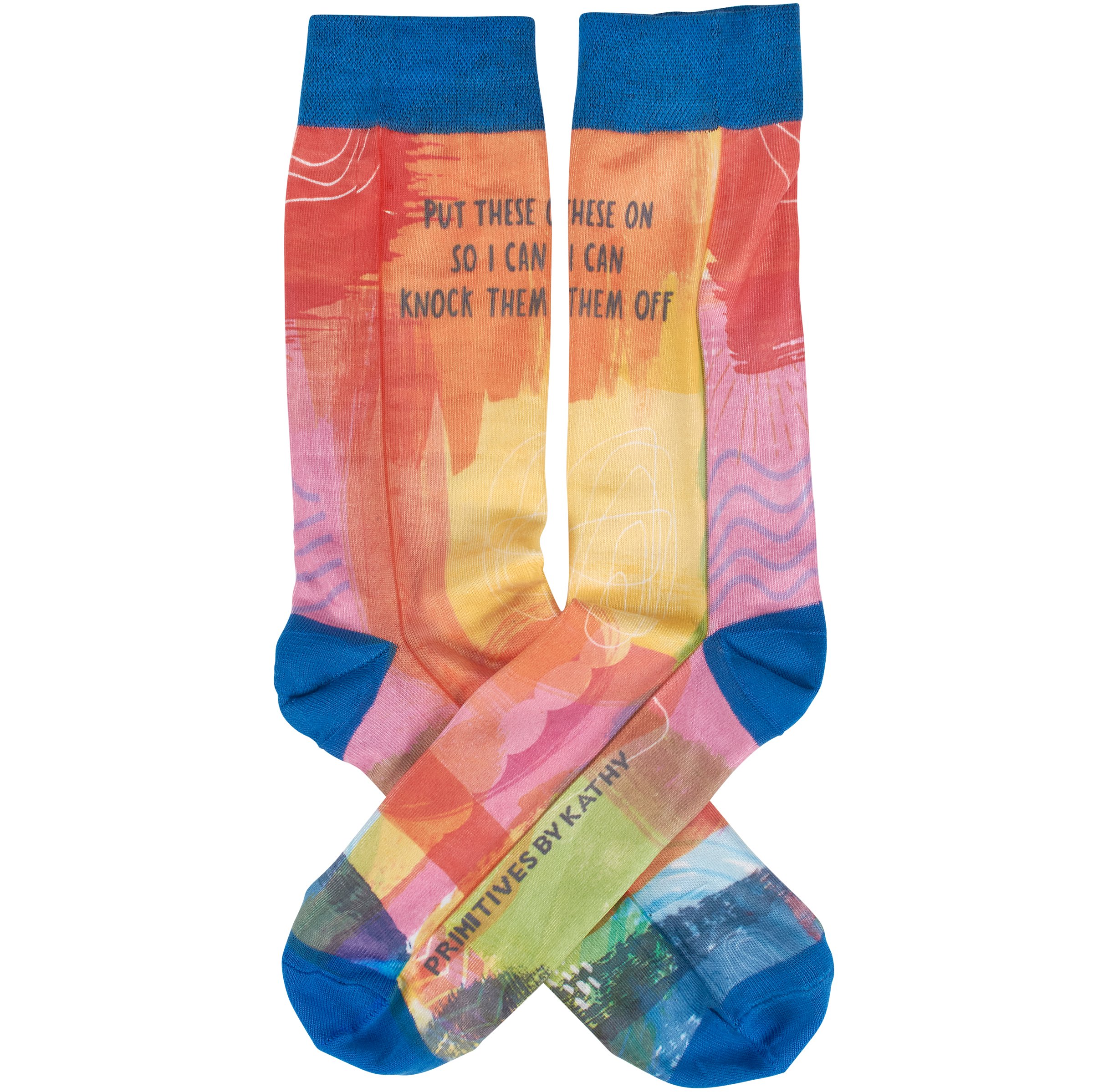 A pair of colorful socks from our Inspiration & Blooms Collection displaying a hand illustrated abstract design in a warm color palette with playful sentiment that reads "Put These On So I Can Knock Them Off." Socks feature a one size fits most design made with cotton, nylon, and spandex. Our Knock Them Off socks come with a header card and a clear plastic hanger for display. A fun gift to give to a best friend or loved one.