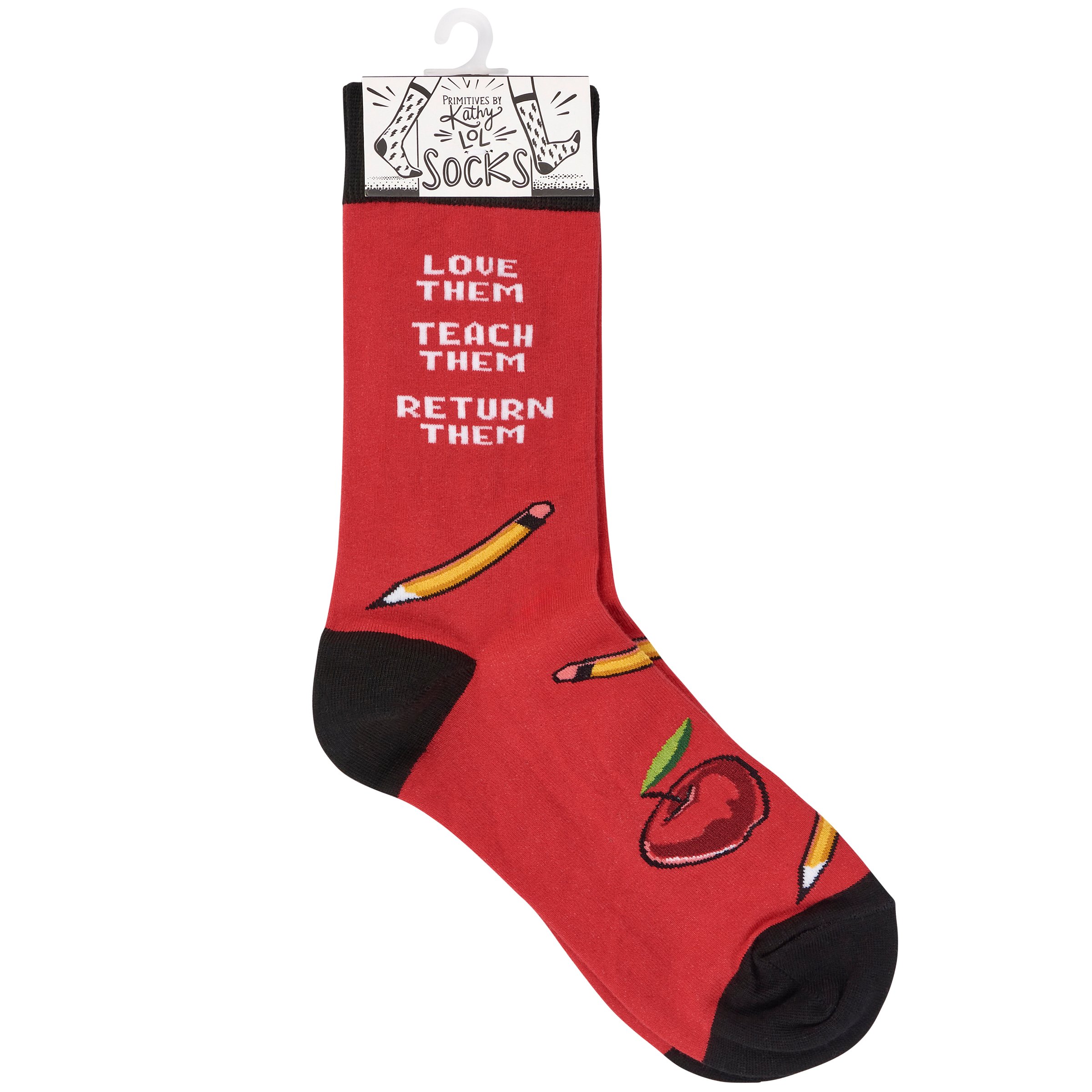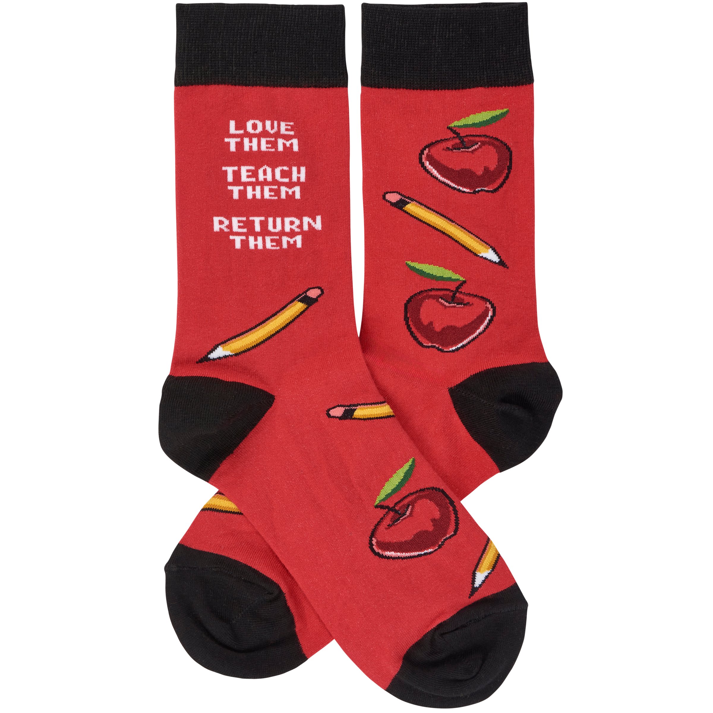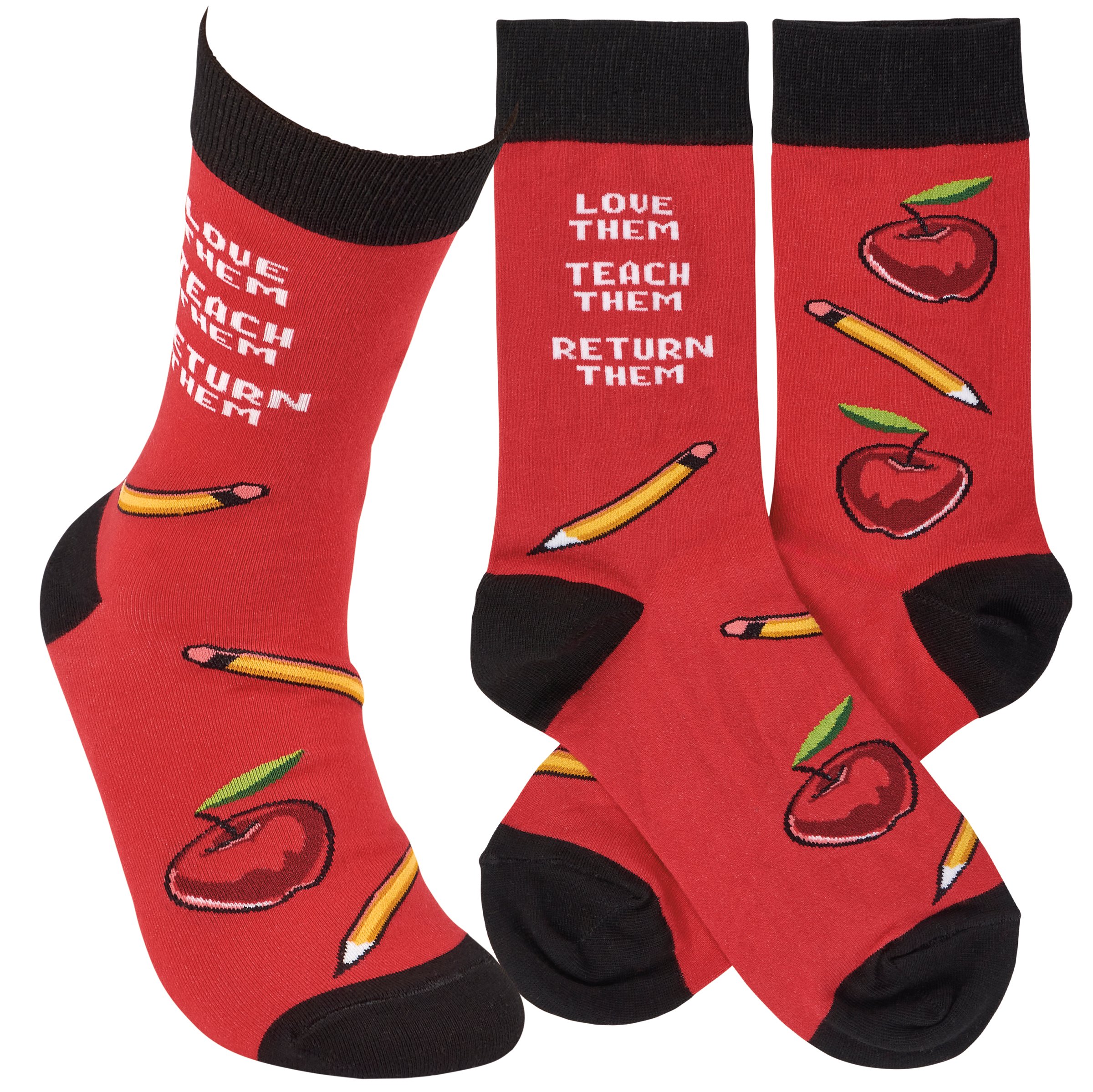 A pair of colorful socks from our Teacher Collection displaying playful hand illustrated designs of pencils and apples with a fun teacher inspired sentiment that reads "Love Them - Teach Them - Return Them." These giftable socks are made with a cotton, nylon, and spandex blend for a one size fits most design. Our Love Them socks come with a decorative header card and a clear plastic hanger for easy rack display and gifting. A fun teacher gift perfect for everyday self-expression.