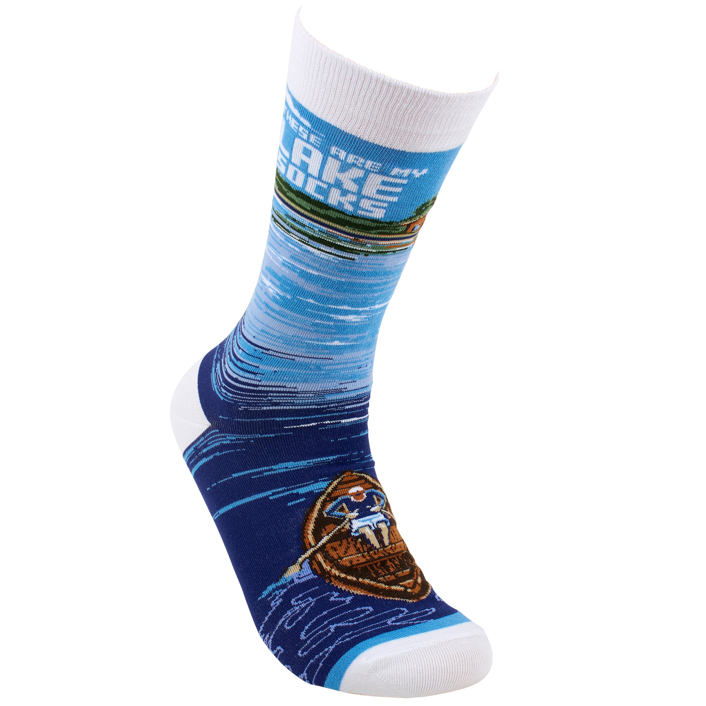 A pair of colorful socks from our Lake & Cabin Collection displaying a playful hand illustrated scene of a row boat and lake house with a fun lake inspired sentiment that reads "These Are My Lake Socks." These giftable socks are made with a cotton, nylon, and spandex blend for a one size fits most design. Our My Lake socks come with a decorative header card and a clear plastic hanger for easy rack display and gifting. A fun lake themed gift perfect for an outdoor accessory or everyday self-expression.