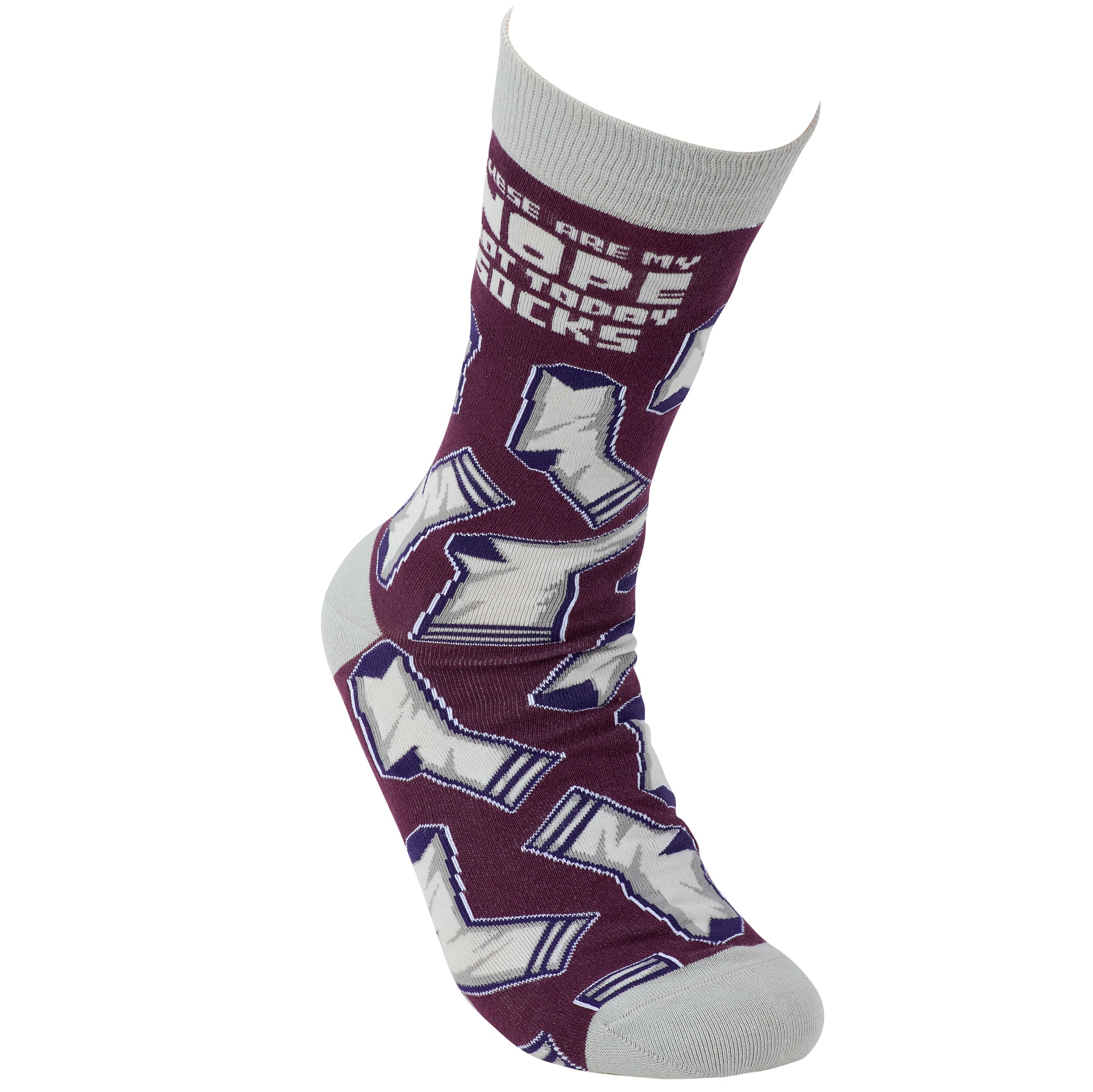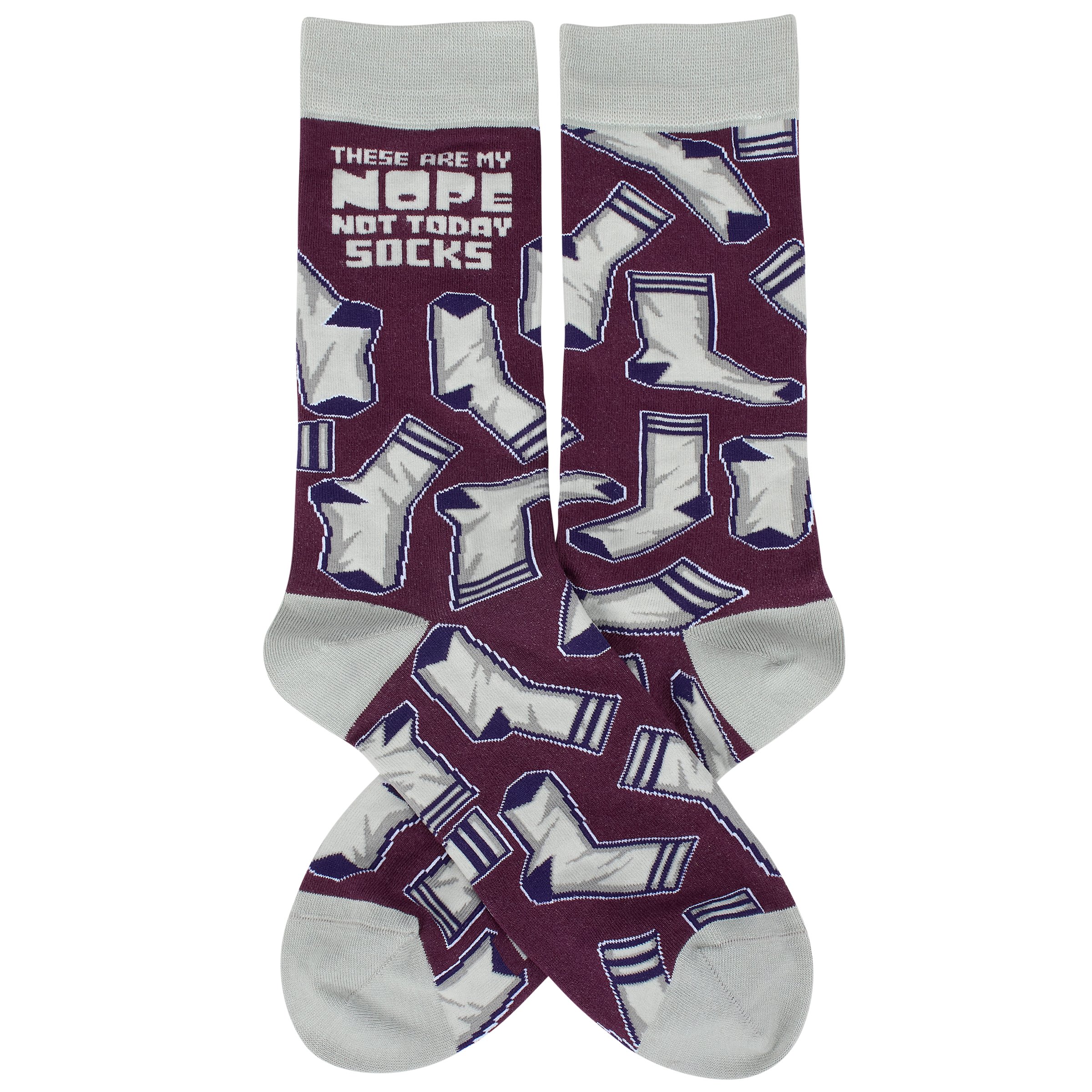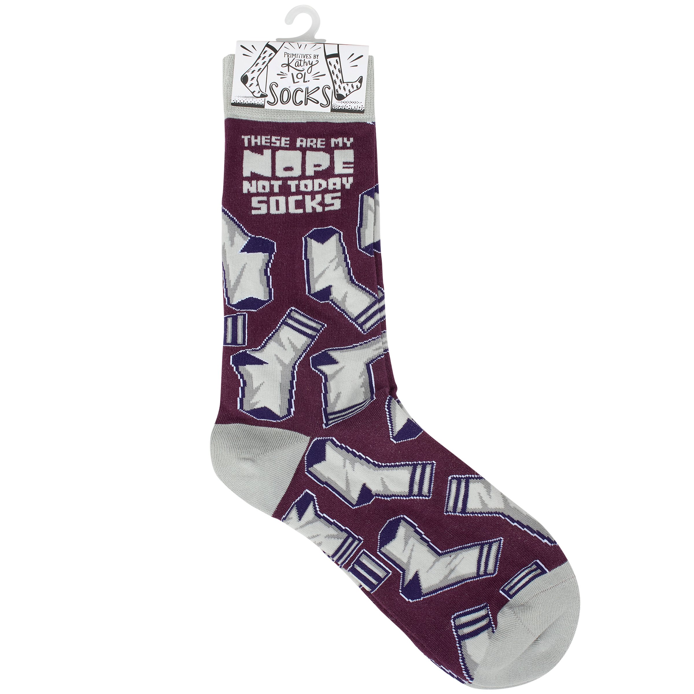 A pair of colorful socks from our LOL-Made You Smile Collection displaying a playful hand illustrated design of messy socks with a sassy sentiment that reads "These Are My Nope Not Today Socks." These giftable socks are made with a cotton, nylon, and spandex blend for a one size fits most design. Our My Nope Not Today socks come with a decorative header card and a clear plastic hanger for easy rack display and gifting. A funny gift perfect for everyday self-expression.