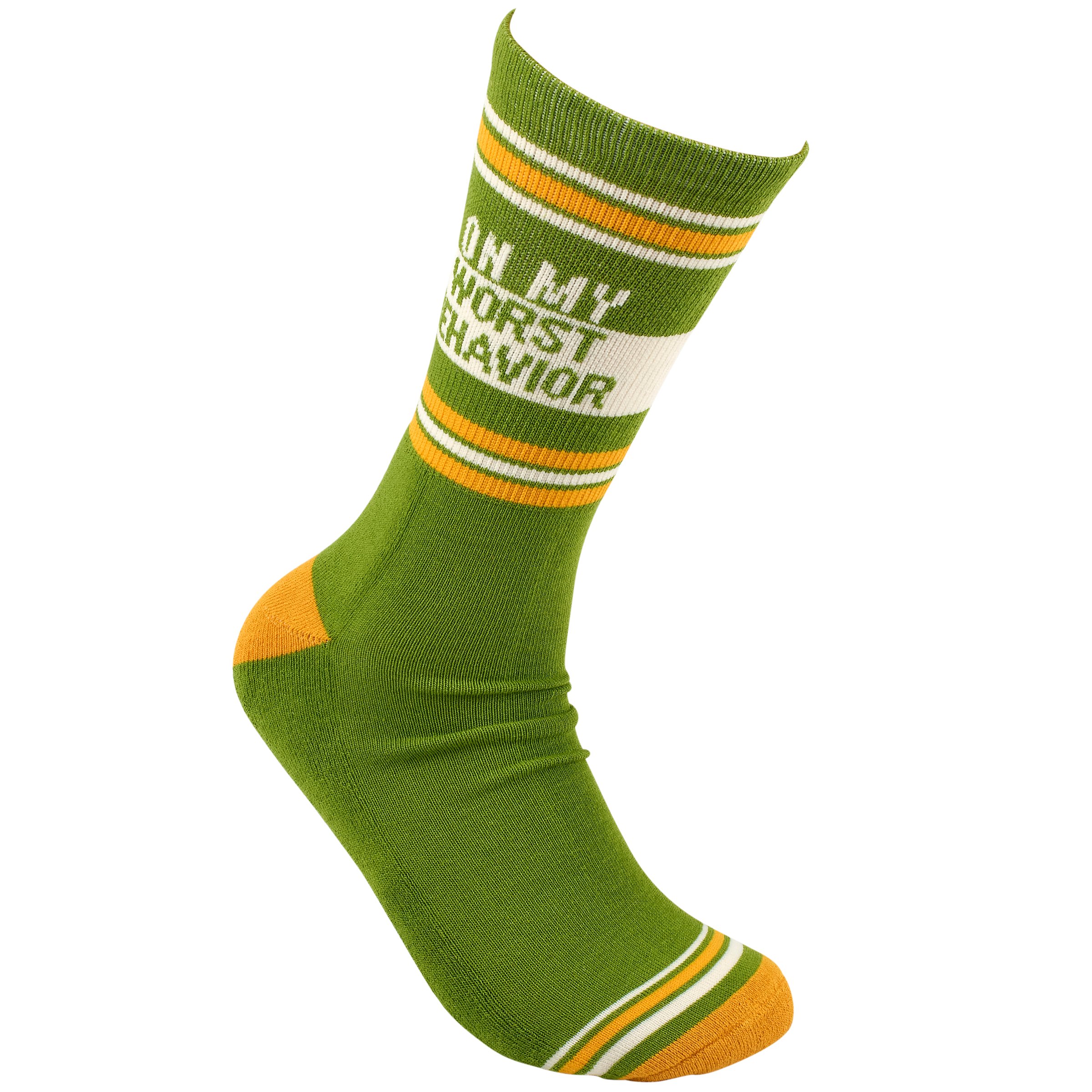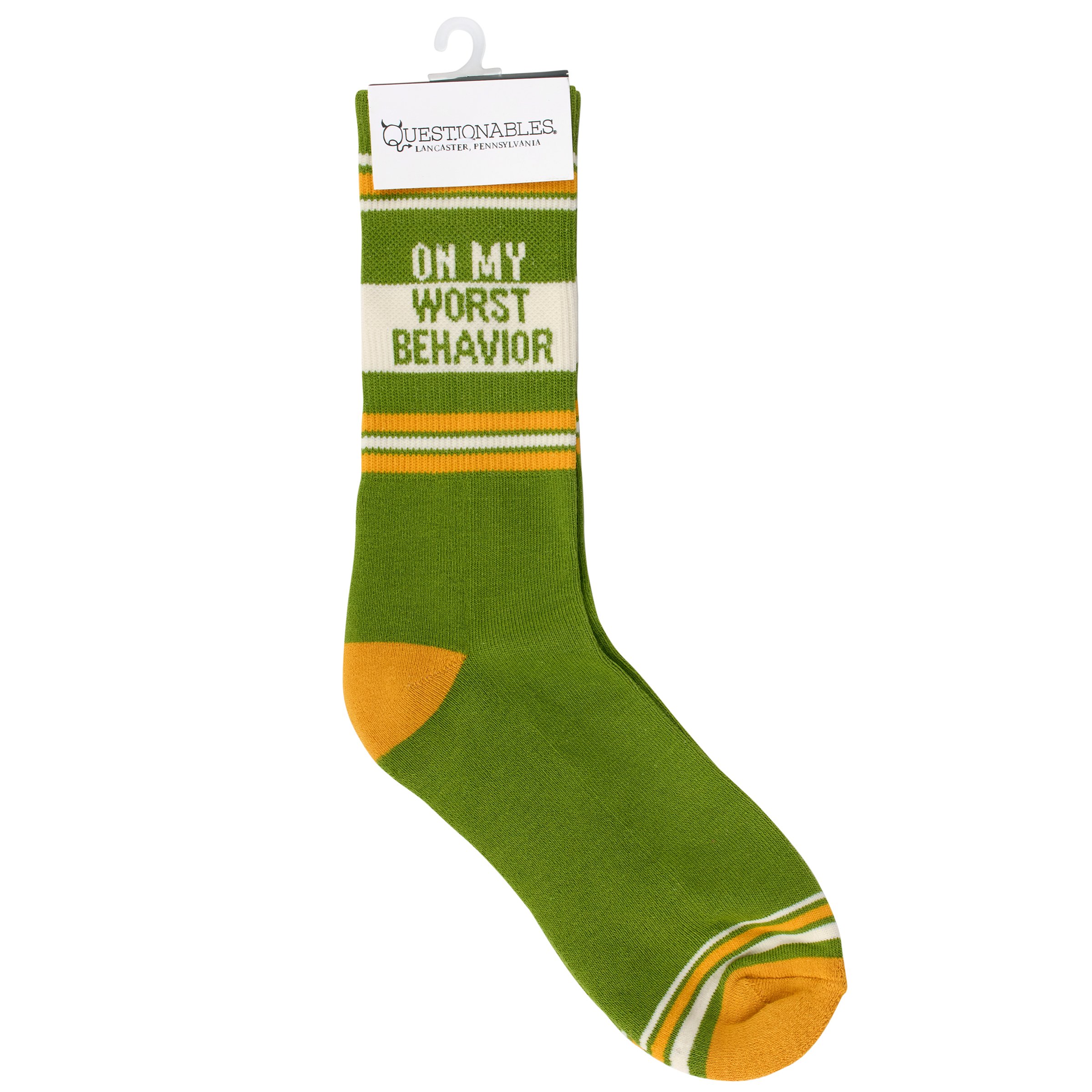 Our mid-calf varsity inspired socks are knitted with ribbed and striped designs for a comfy athleisure style and then finished with a questionable phrase. This fun pair of expressive socks displays a sassy sentiment that reads "On My Worst Behavior" letting others know to prepare themselves. Questionables socks are made with cotton, nylon, and spandex to create a one-size-fits-most design. Each pair of socks is packaged on a clear plastic hanger with header card for graceful display in store. Our On My Worst Behavior socks call back to a retro style but with modern mentality, perfect for making a statement while getting a giggle out of others. Colorful and cozy socks always make a great gift for everyday self-expression.