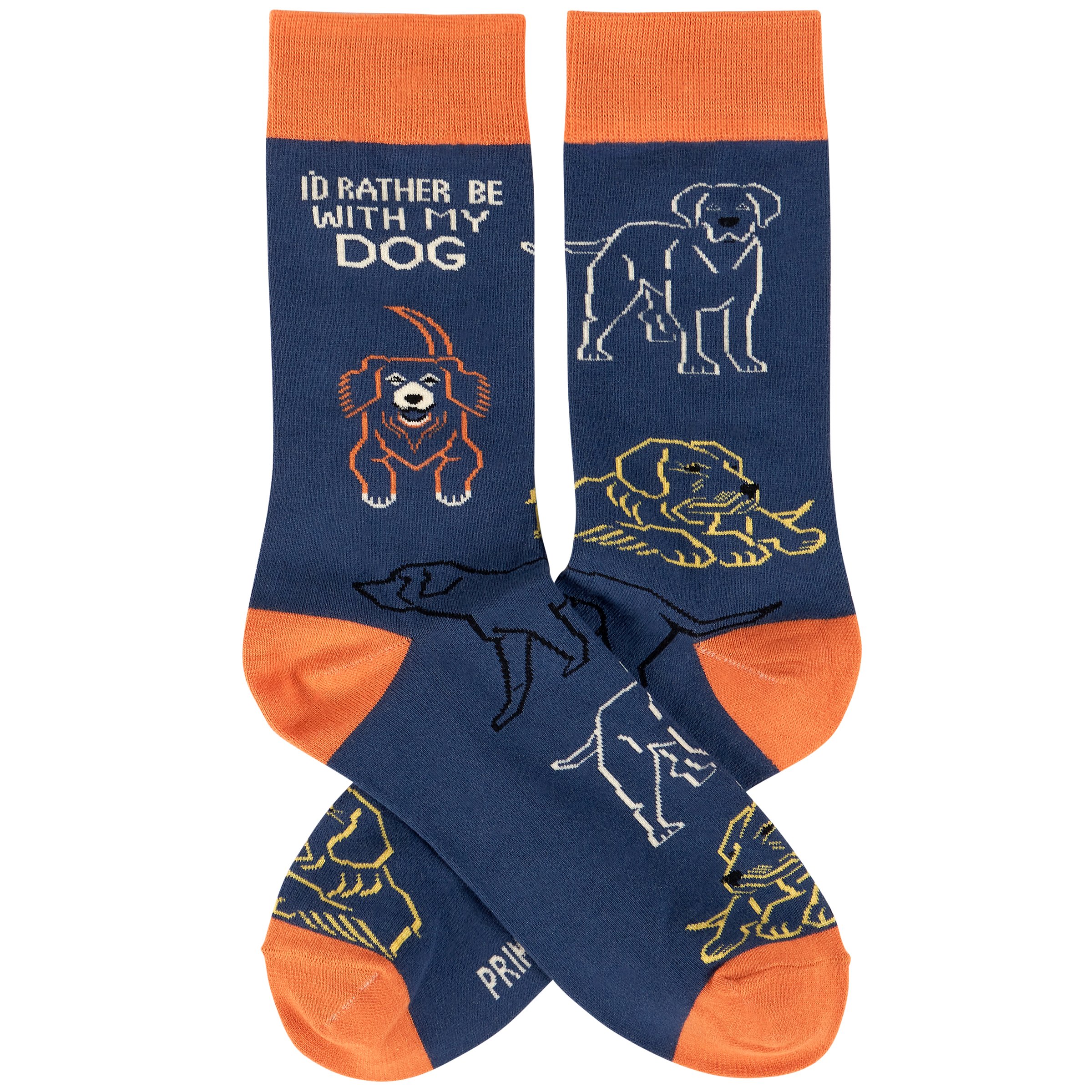A pair of colorful socks from our Pet Collection displaying playful hand illustrated designs of various dogs with a fun pet inspired sentiment that reads "I'd Rather Be With My Dog." These giftable socks are made with a cotton, nylon, and spandex blend for a one size fits most design. Our Rather Be With My Dog socks come with a decorative header card and a clear plastic hanger for easy rack display and gifting. A fun dog-themed gift perfect for everyday self-expression.