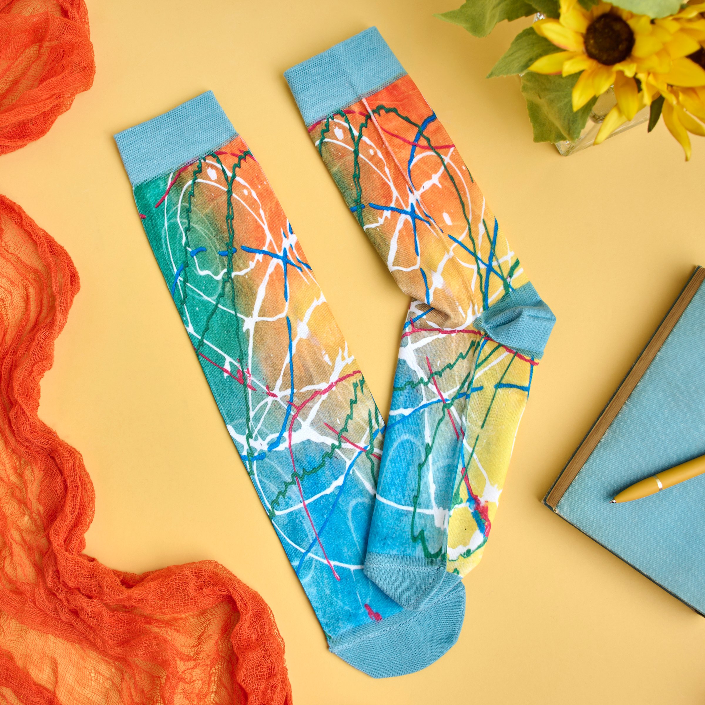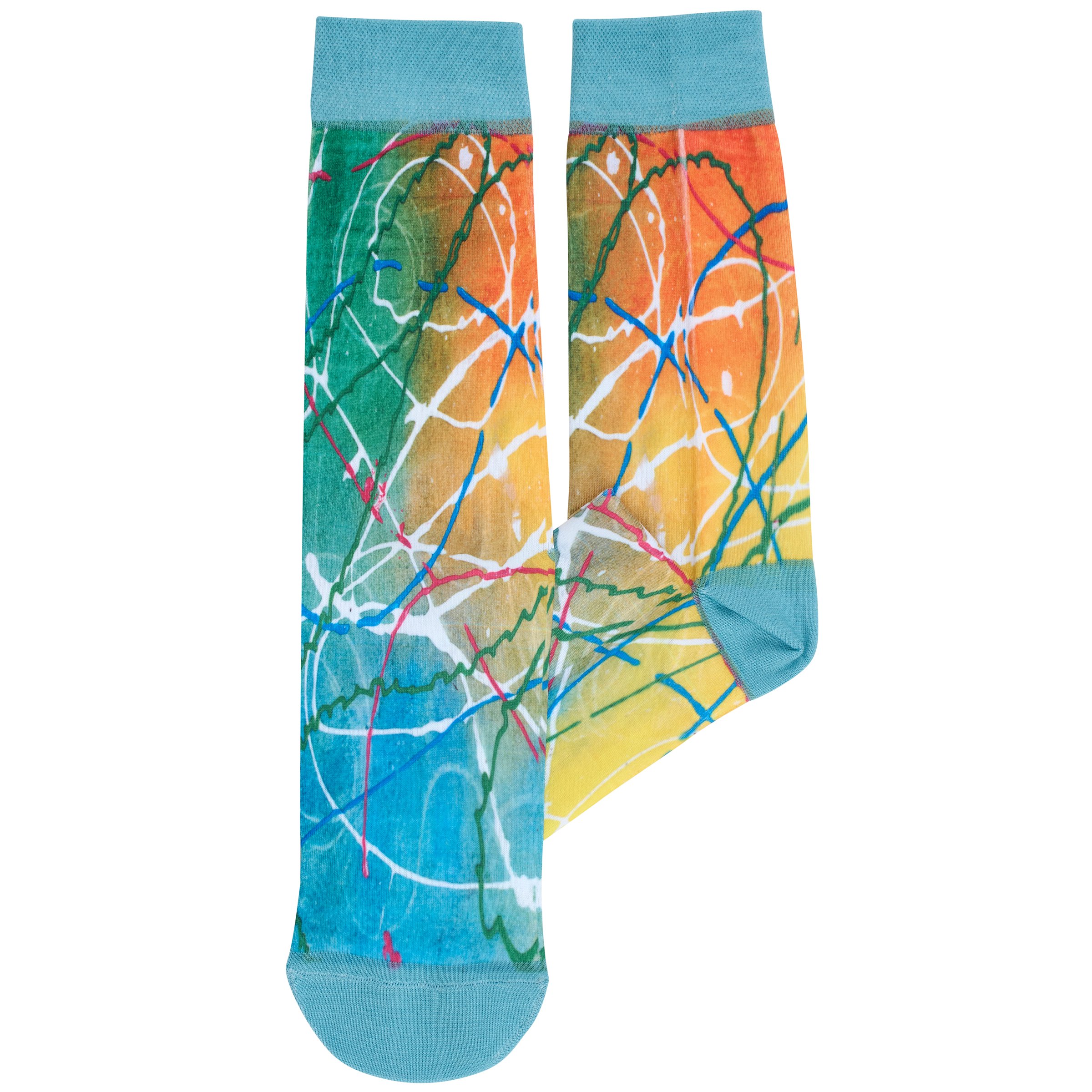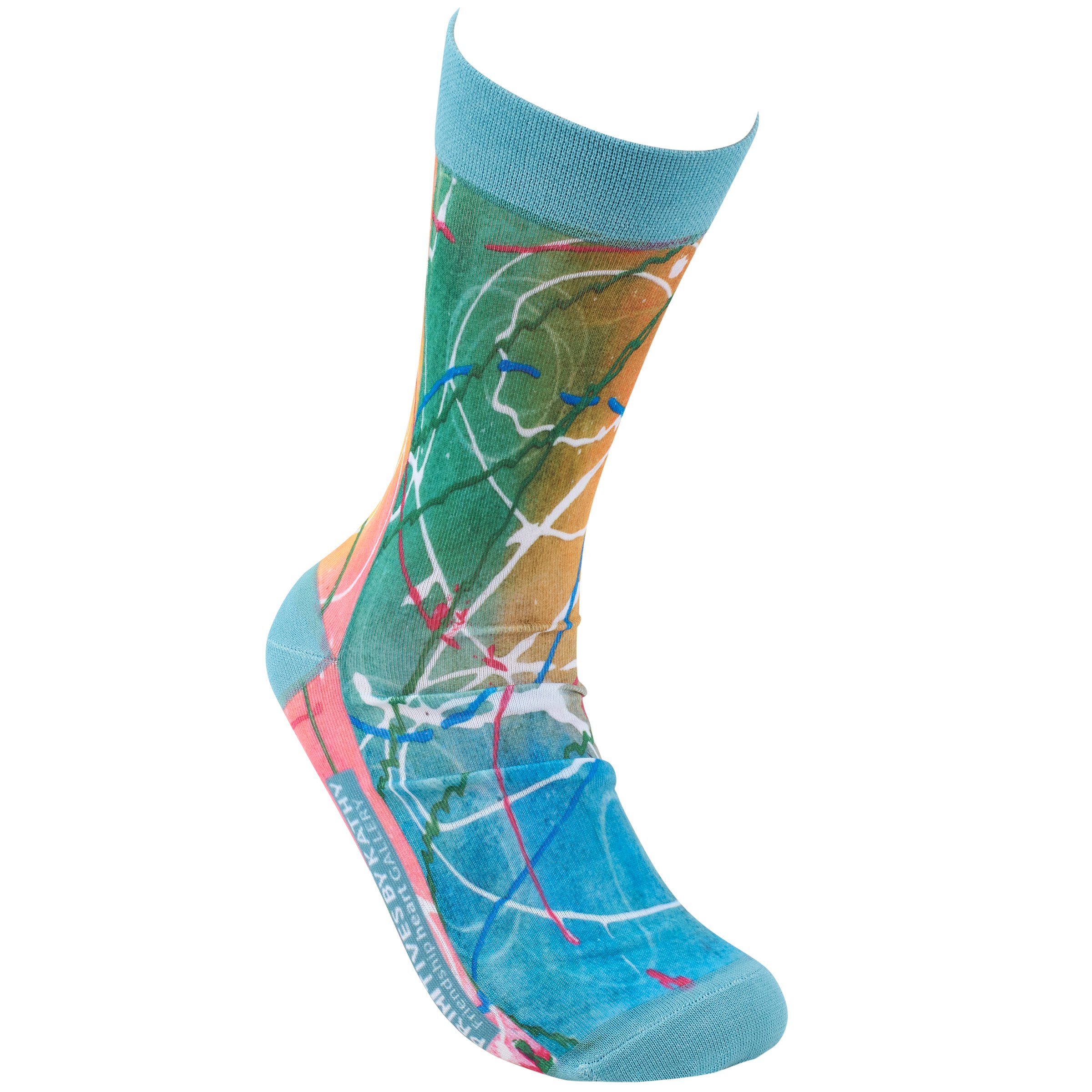 A pair of colorful socks from our Friendship Heart Gallery Collection featuring an all-over design displaying original art inspired by rope candy created at the Friendship Heart Gallery in Lancaster, PA which supports artists with intellectual disabilities and autism. Artist socks also feature blue color accents on the cuff, heel, and toe. These giftable socks are made with a spandex blend for a one size fits most design. Our Rope Candy socks come with a decorative header card and a clear plastic hanger for easy rack display and gifting. A thoughtful gift that supports artists in local communities. Perfect for mismatching with other colorful socks to wear during Rock Your Socks events. On March 21st people all around the world come together every year and celebrate World Down Syndrome Day by wearing brightly colored, mismatched socks to represent the unique talents and abilities of people with Down syndrome.